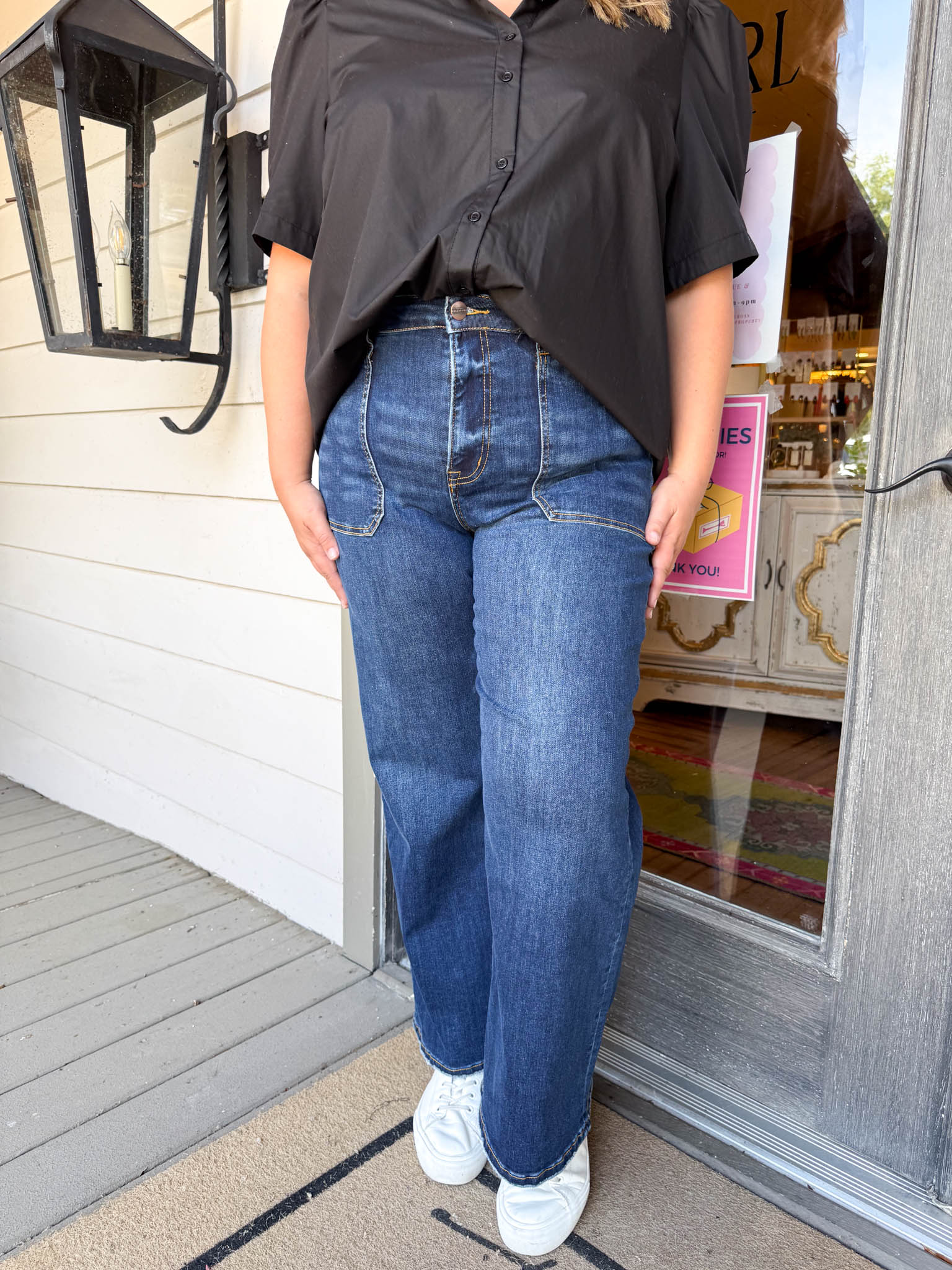 Nice Blue High Rise Wide Leg Patch Pocket Jeans - Curvy