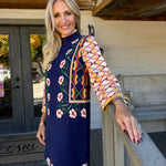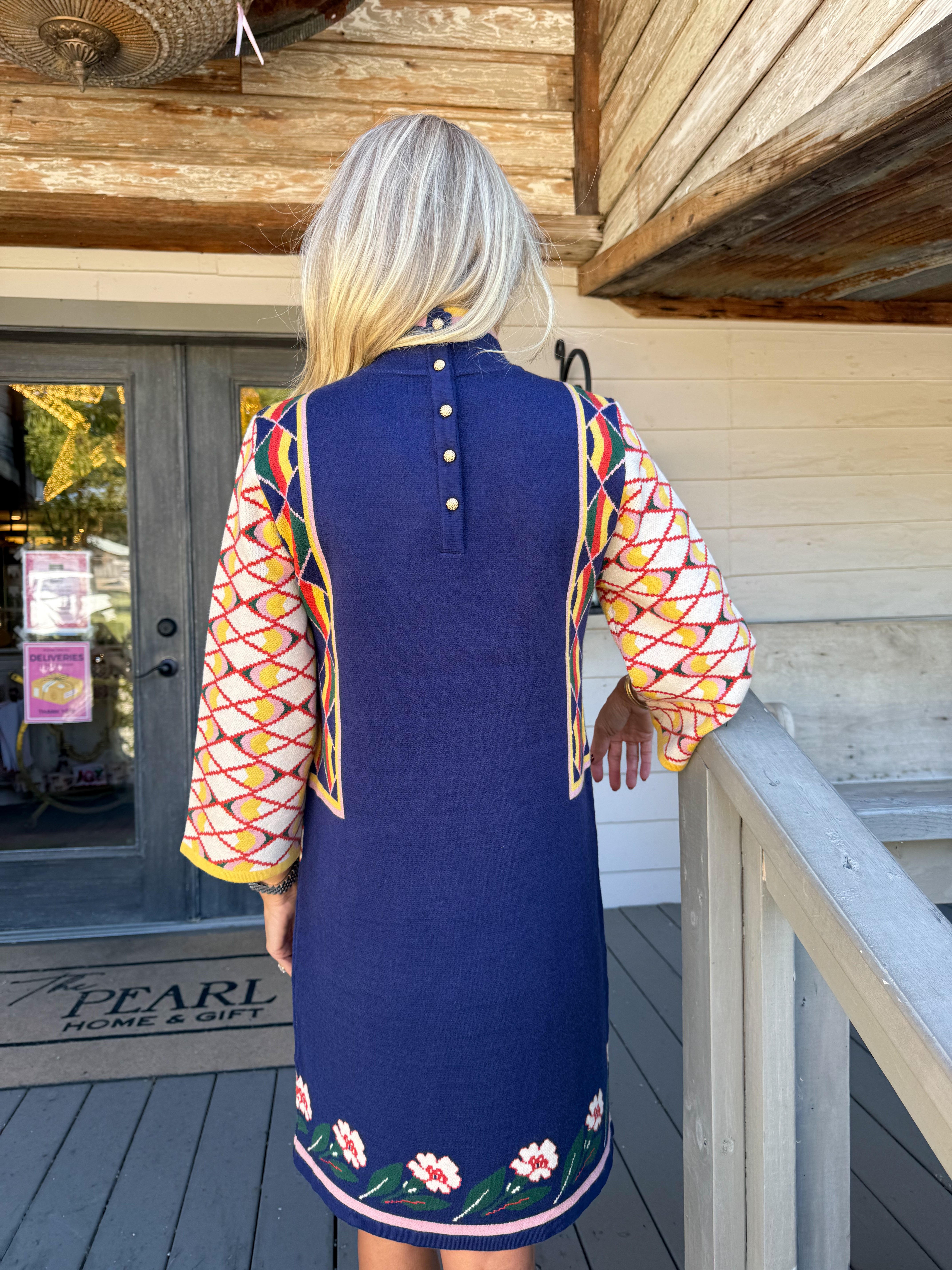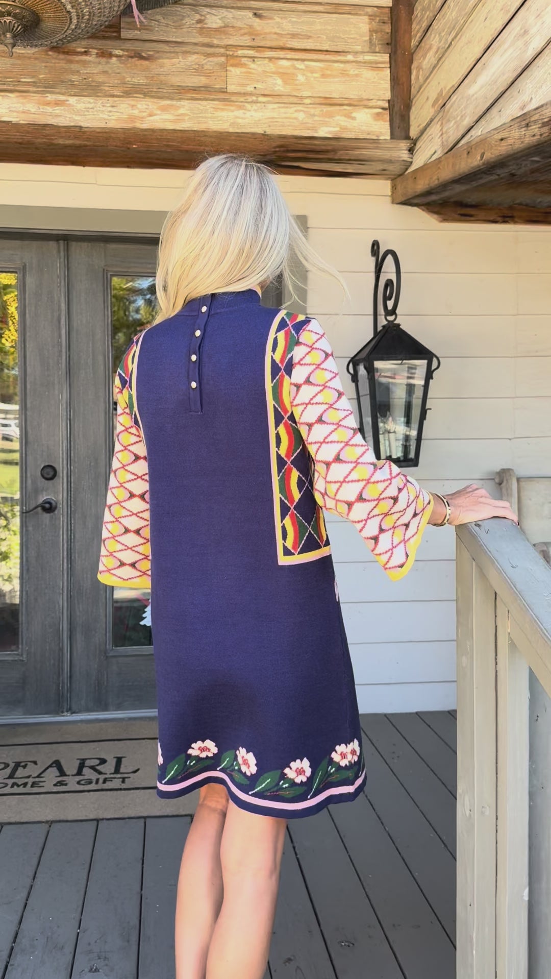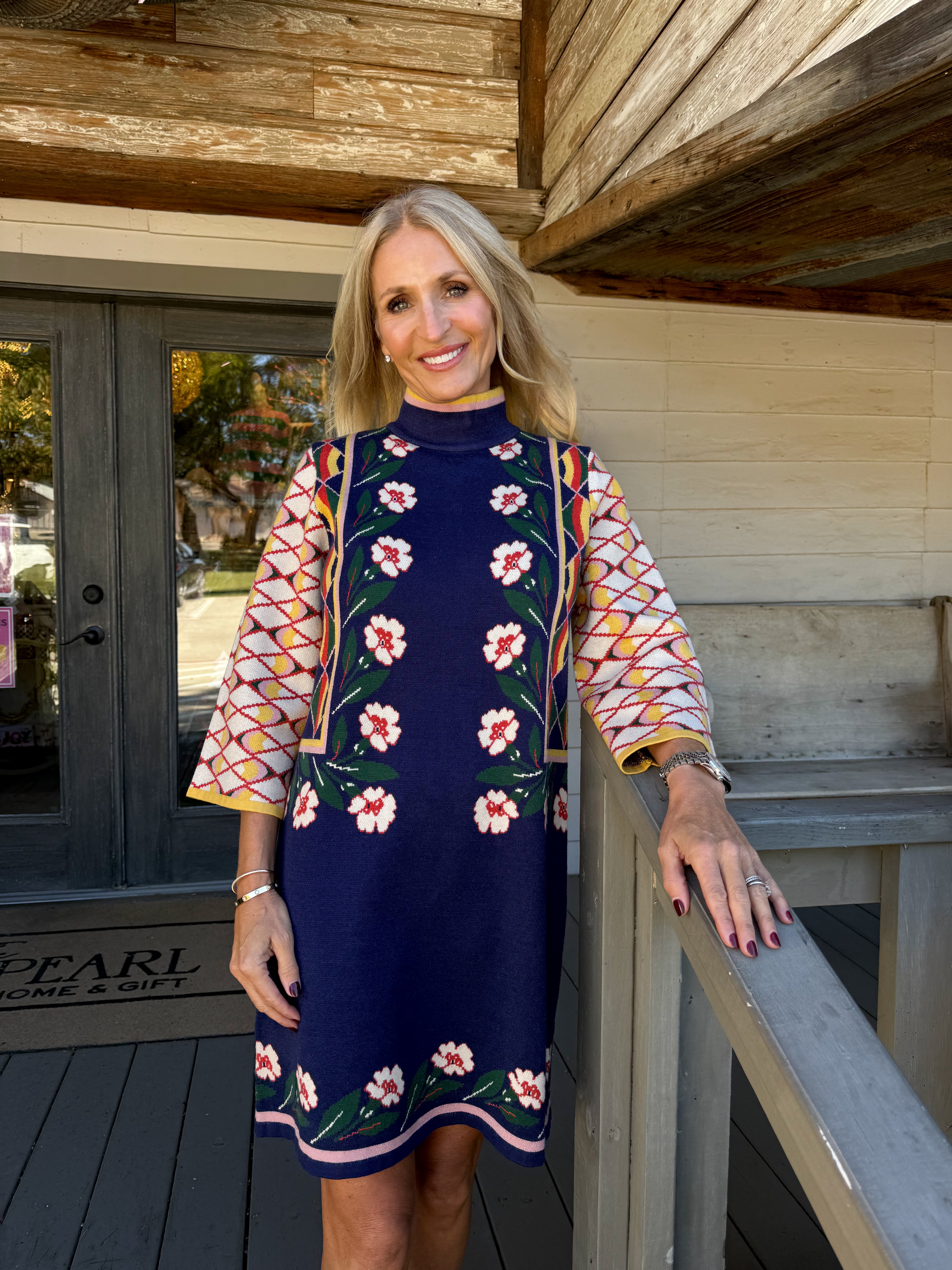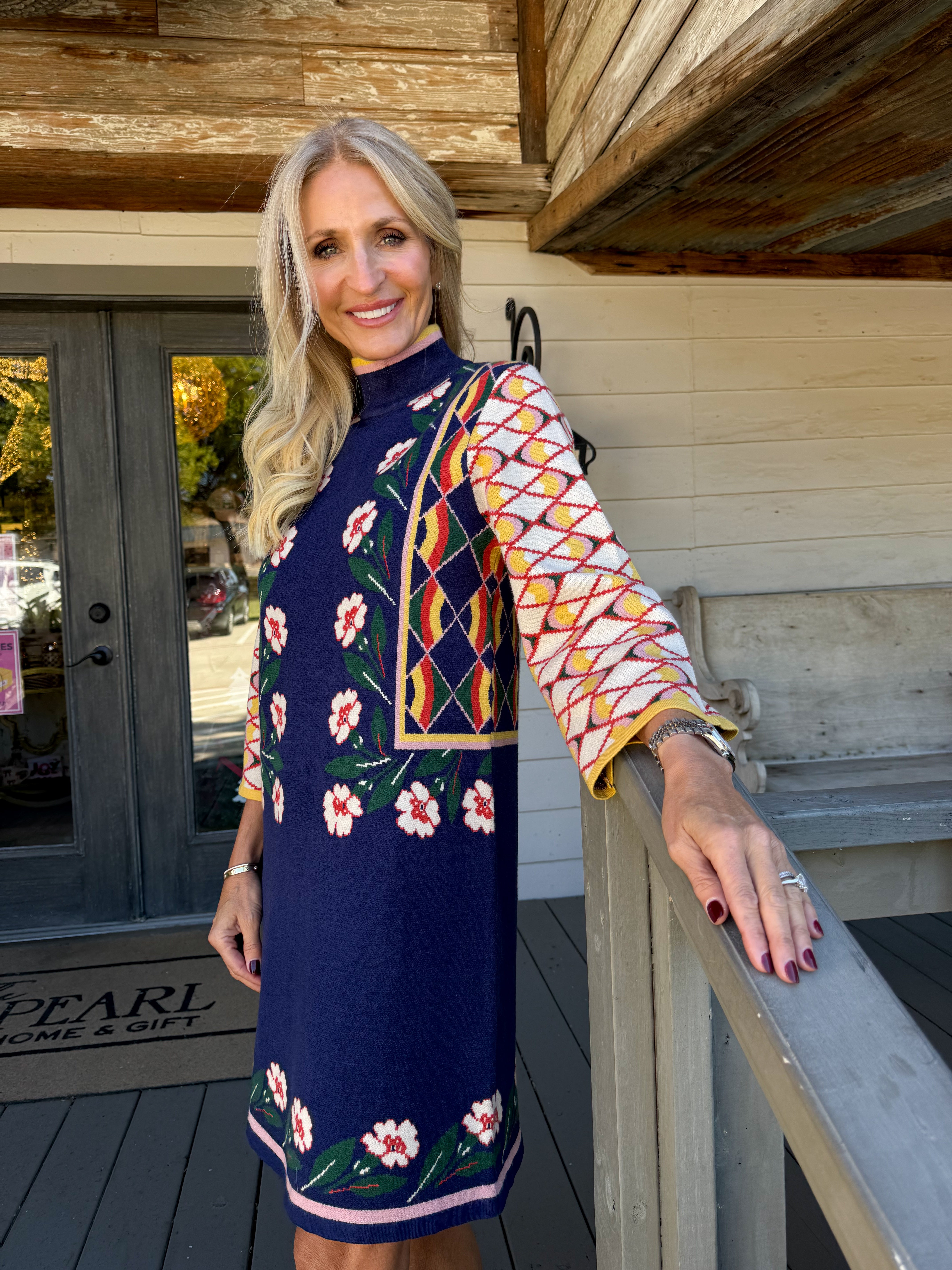 Elevate your everyday style with this charming Alba Sweater Dress, where intricate floral and geometric jacquard patterns meet cozy sophistication.
