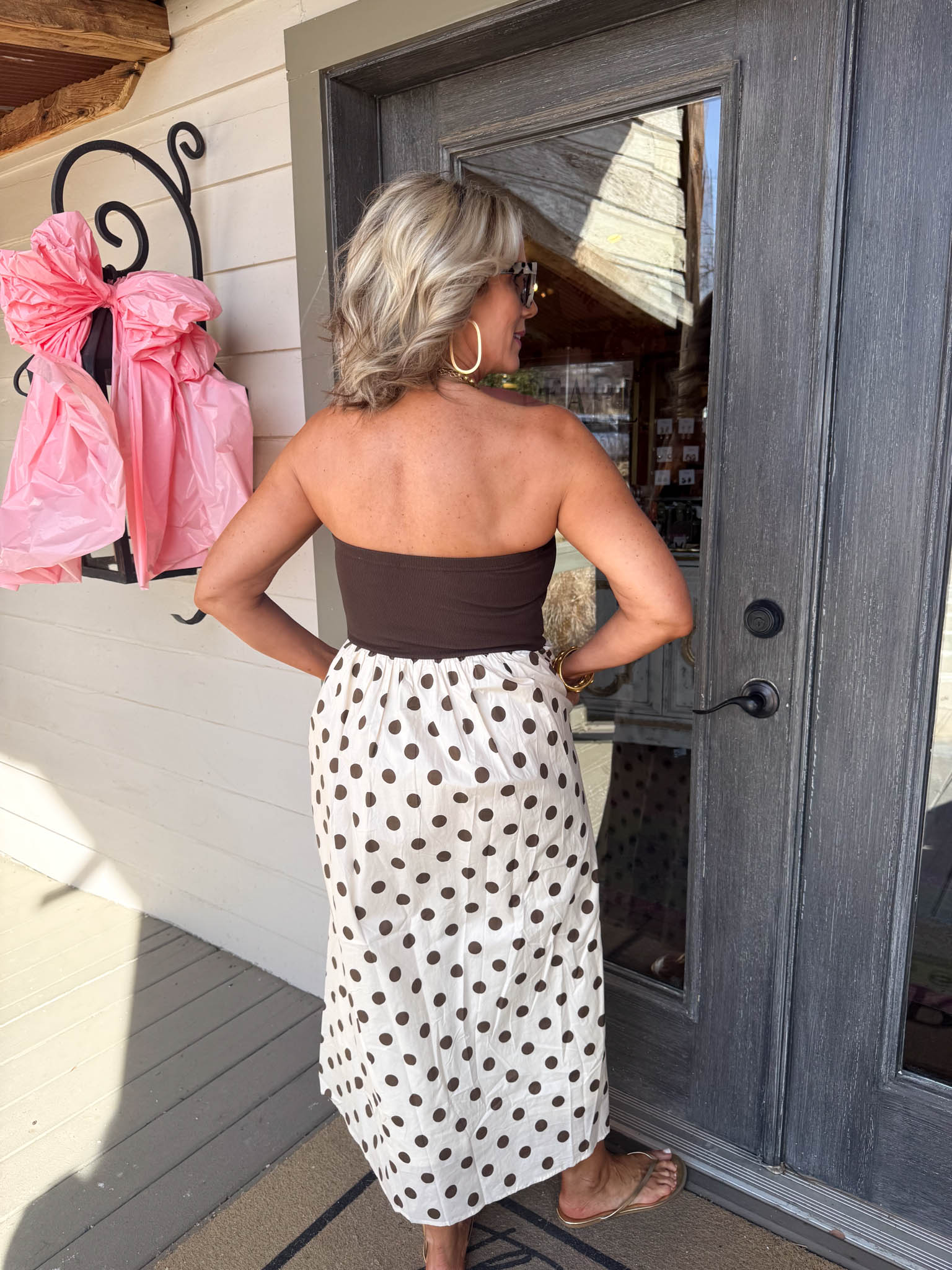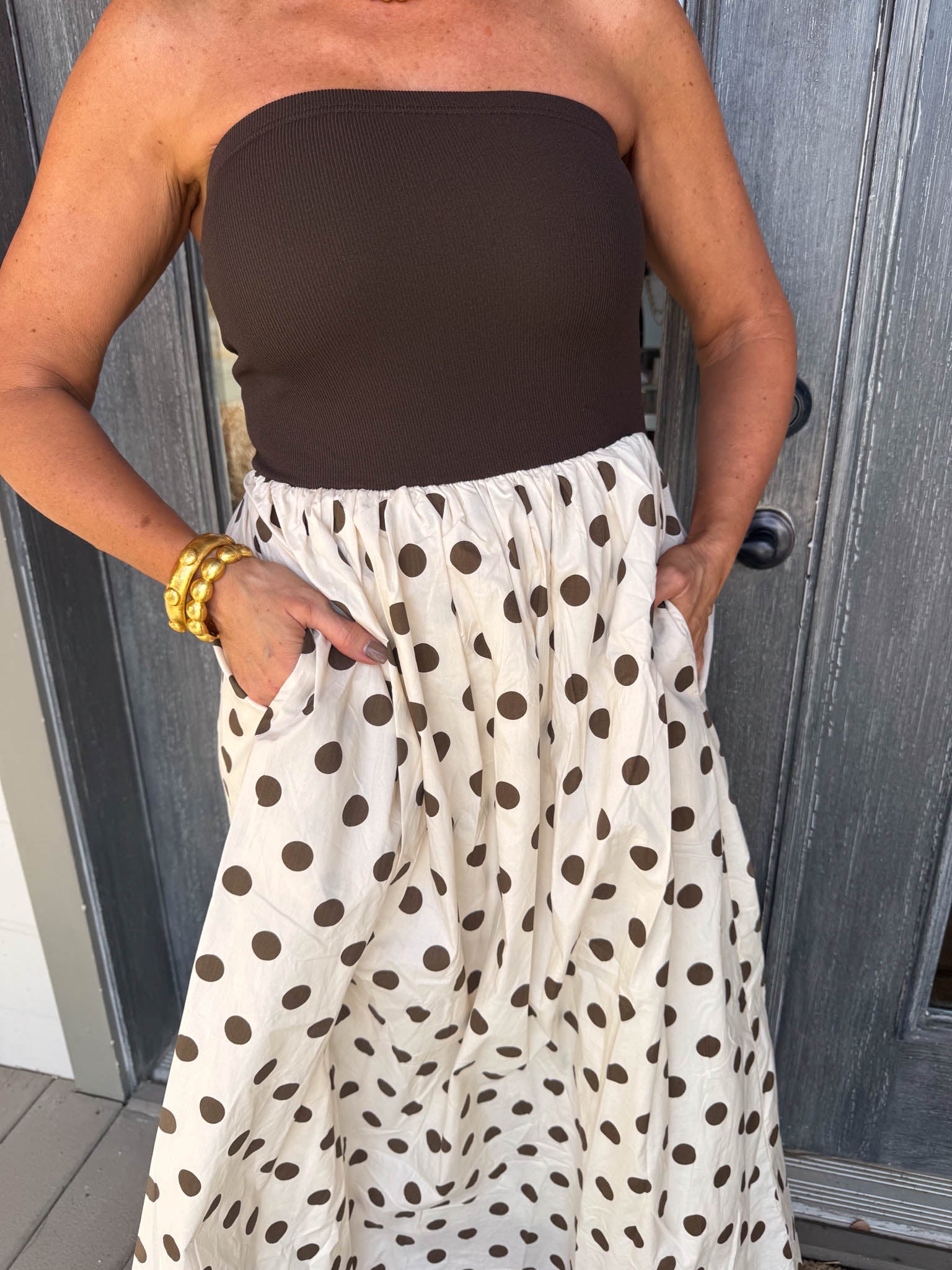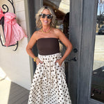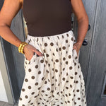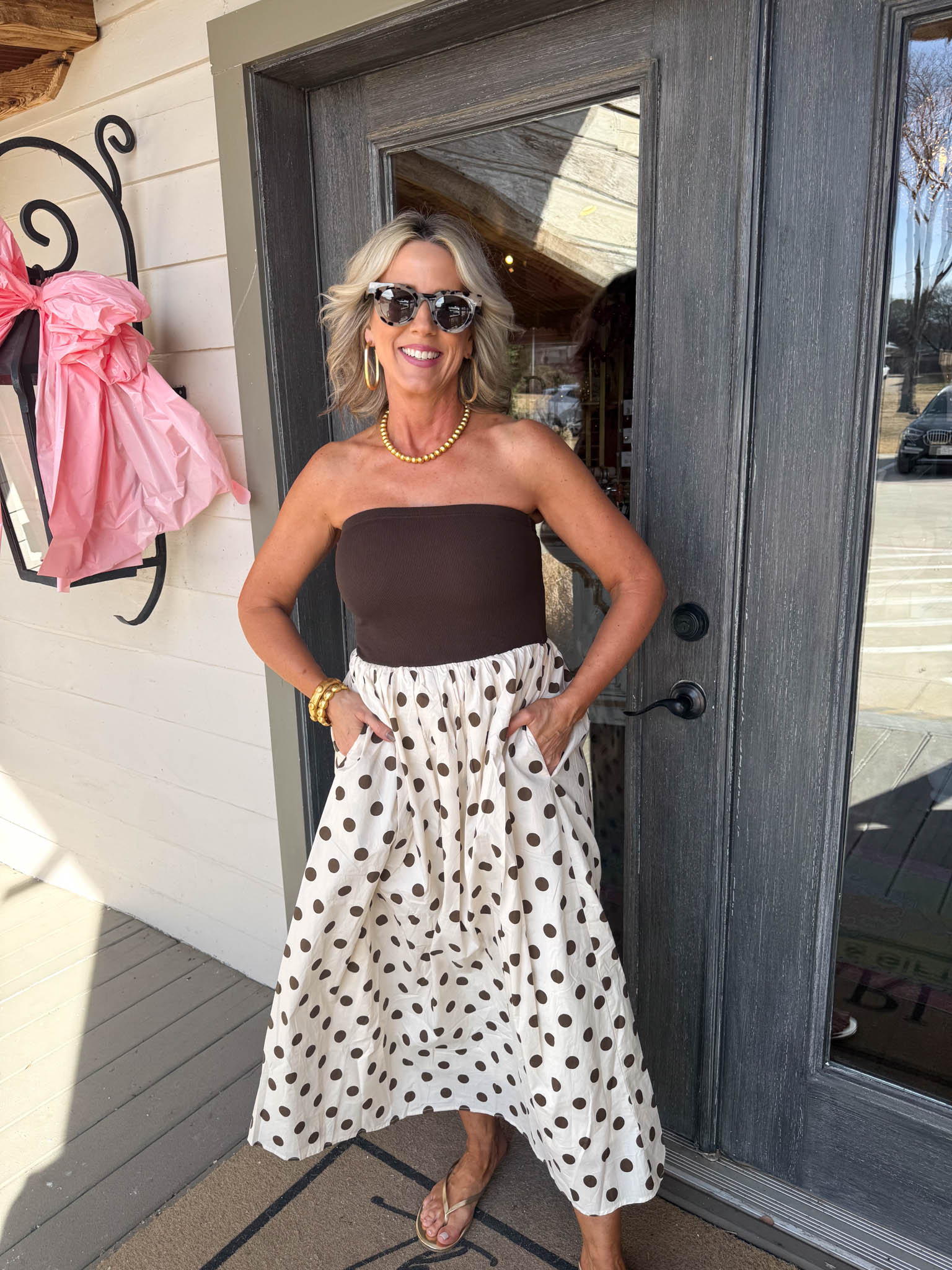 Effortlessly chic in a brown and white polka dot print that transitions seamlessly from brunch to evening plans.