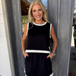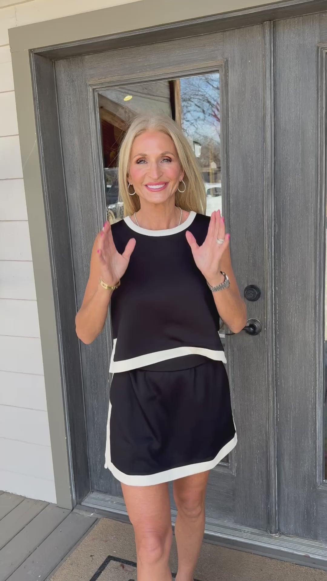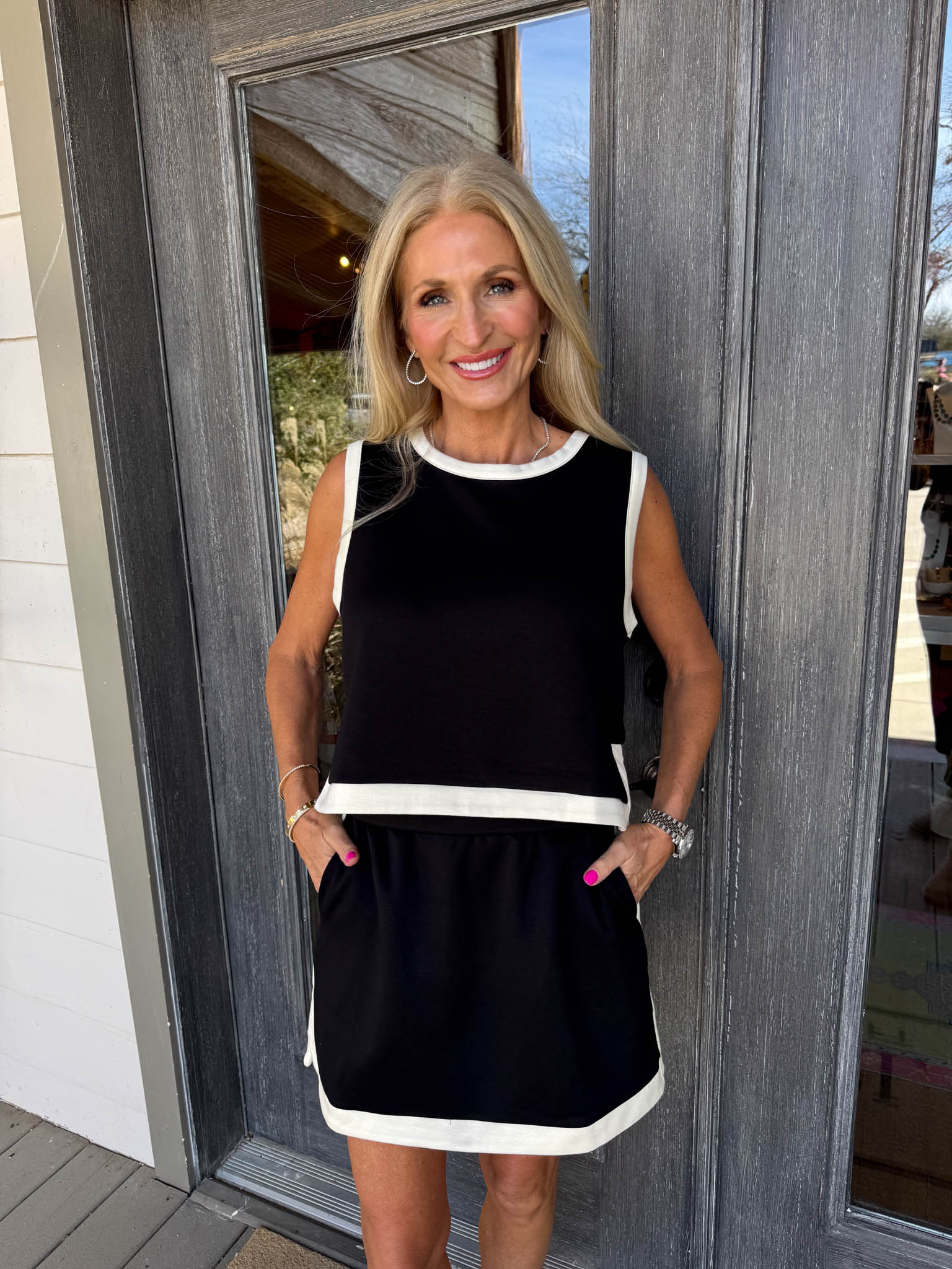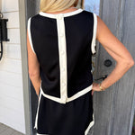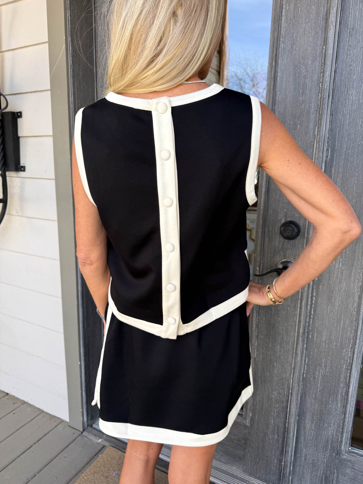 Turn heads in this chic black tank and skort duo—effortlessly polished with crisp white trim and a charming button-up back.