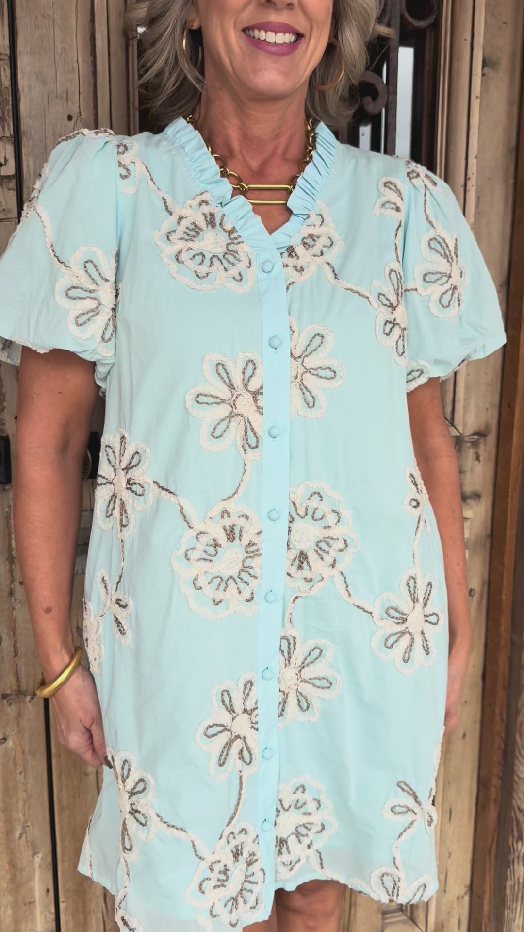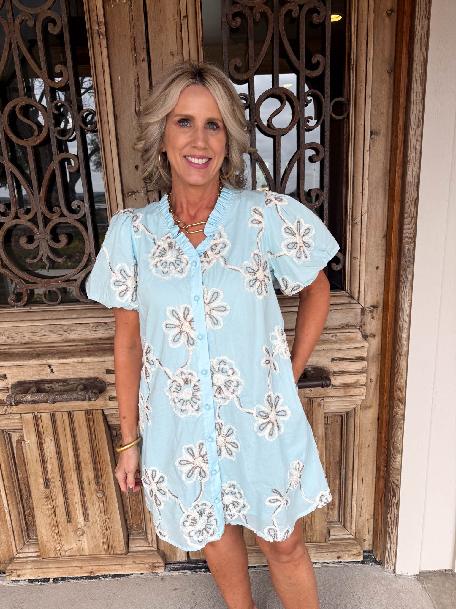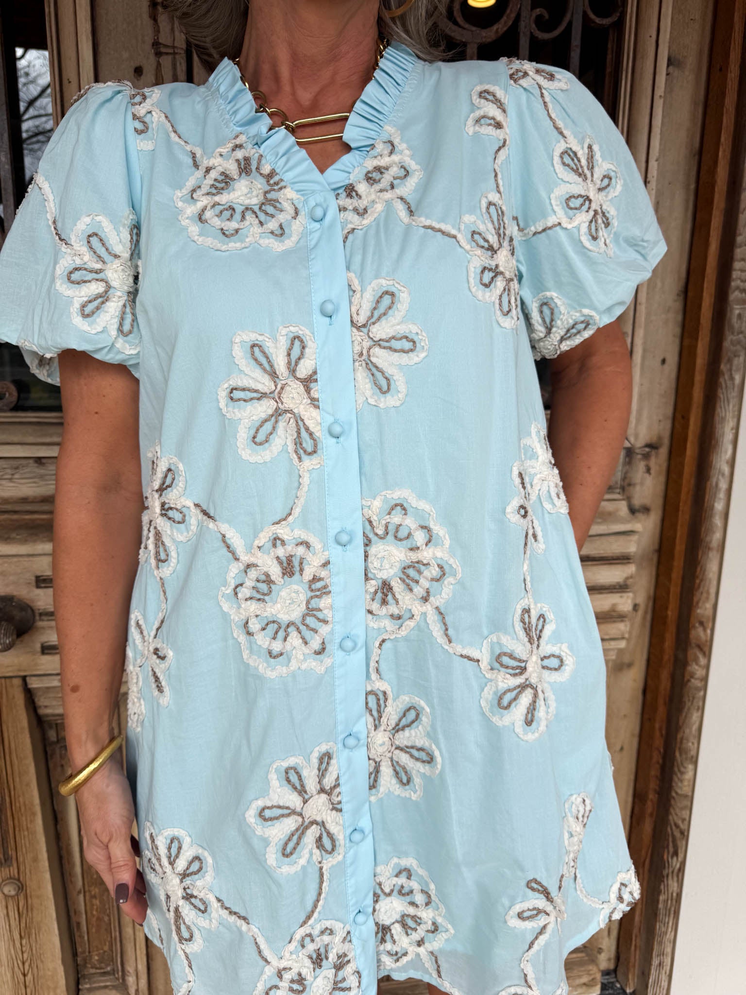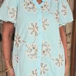 • Puffy short sleeves frame the shoulders with playful volume, while delicate white embroidered flowers add a whimsical, handcrafted touch