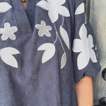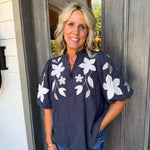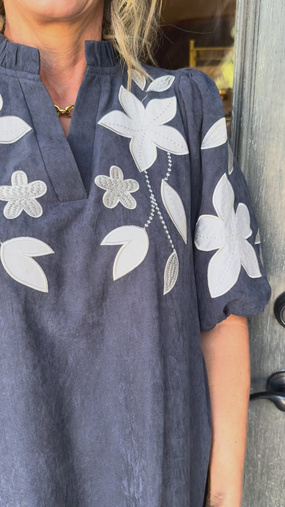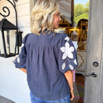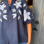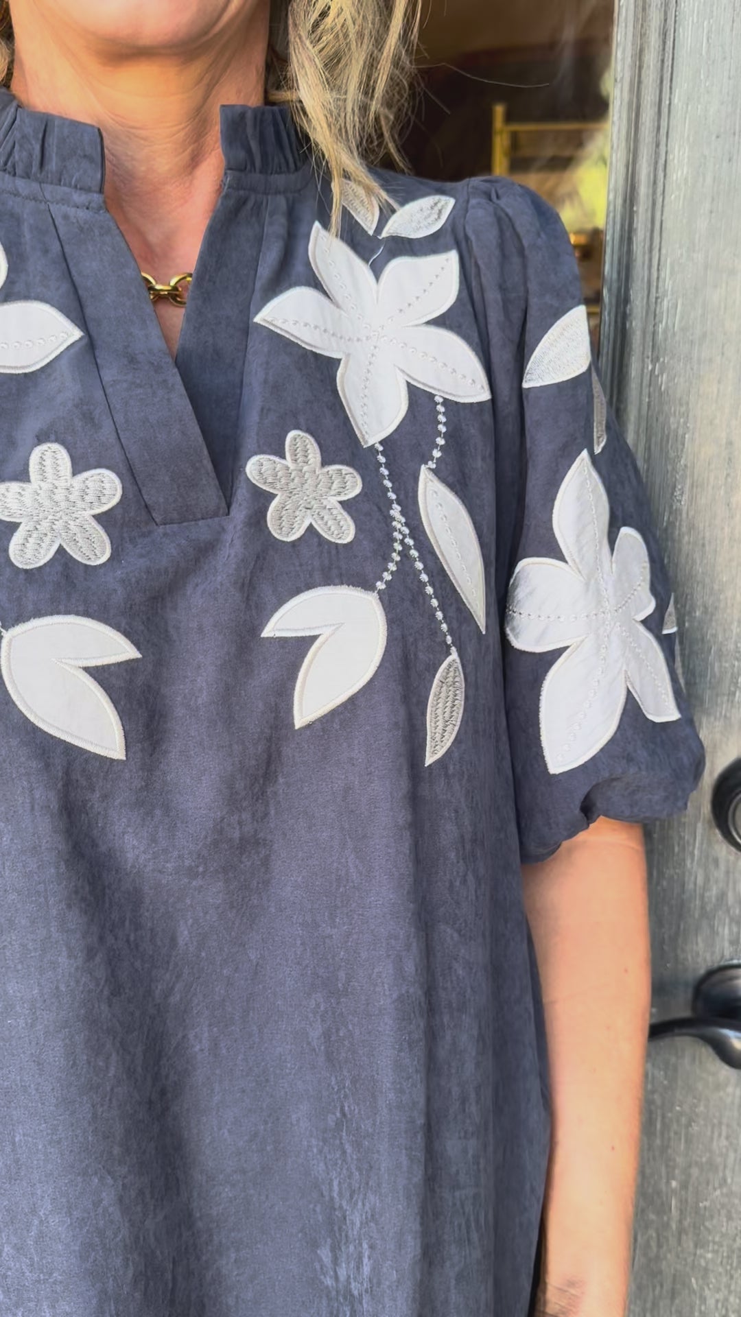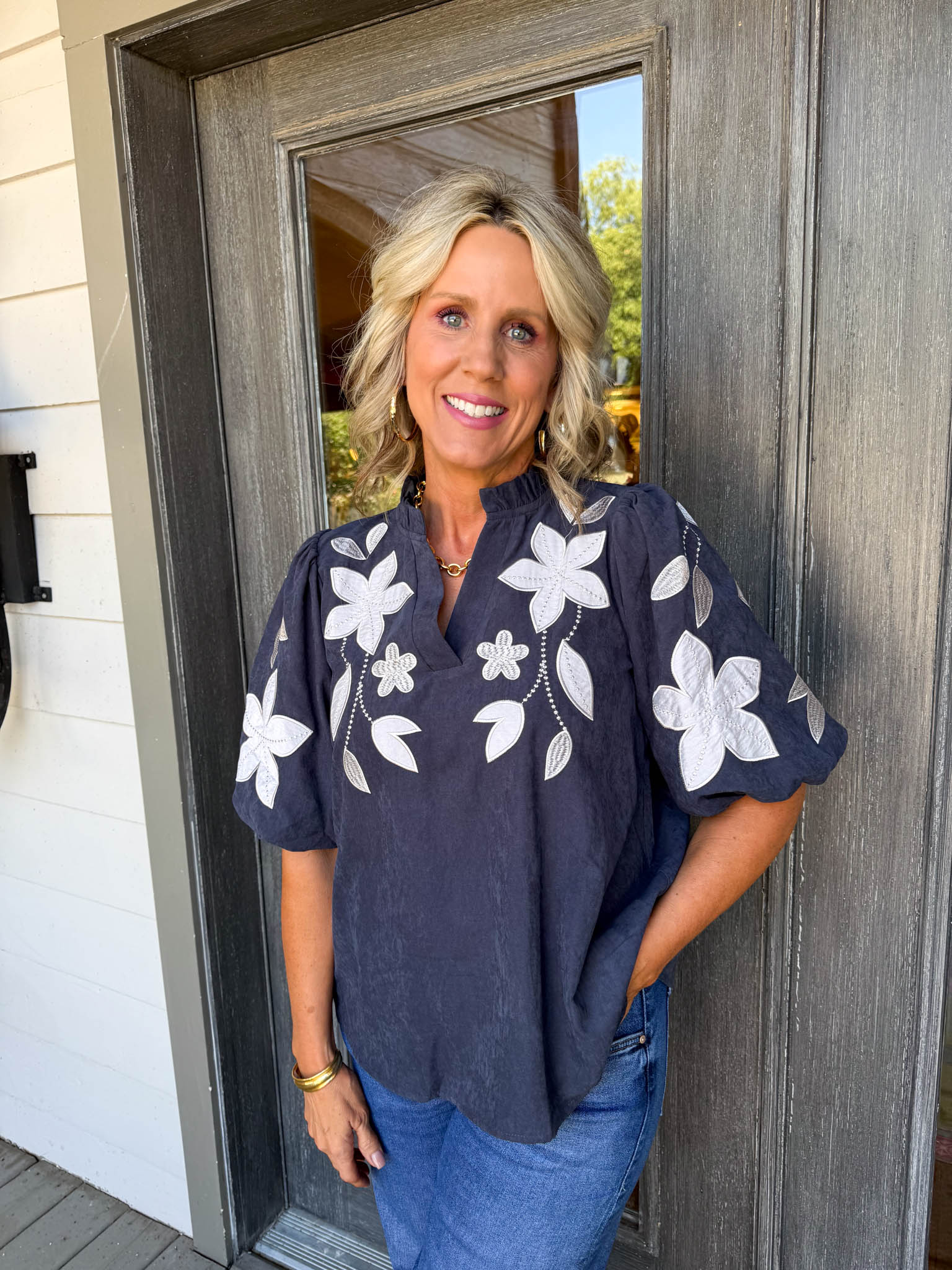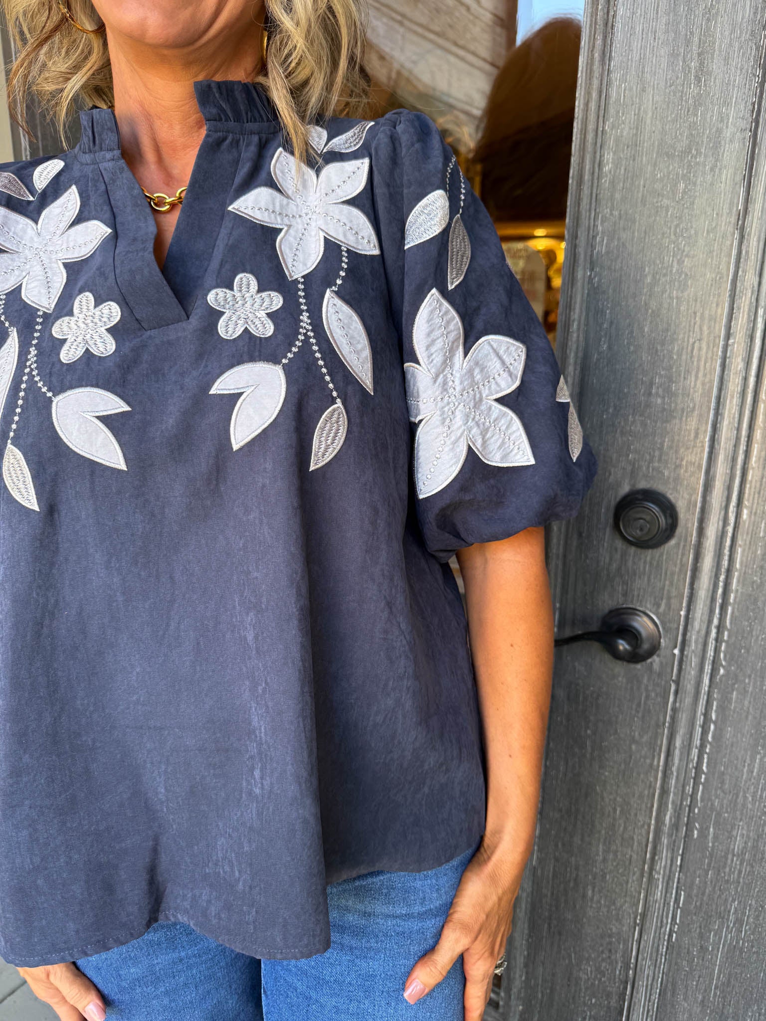 Elevate your style with the Azure Blouse, where whimsical floral applique meets soft navy washed suede for a look that's both charming and effortlessly chic.