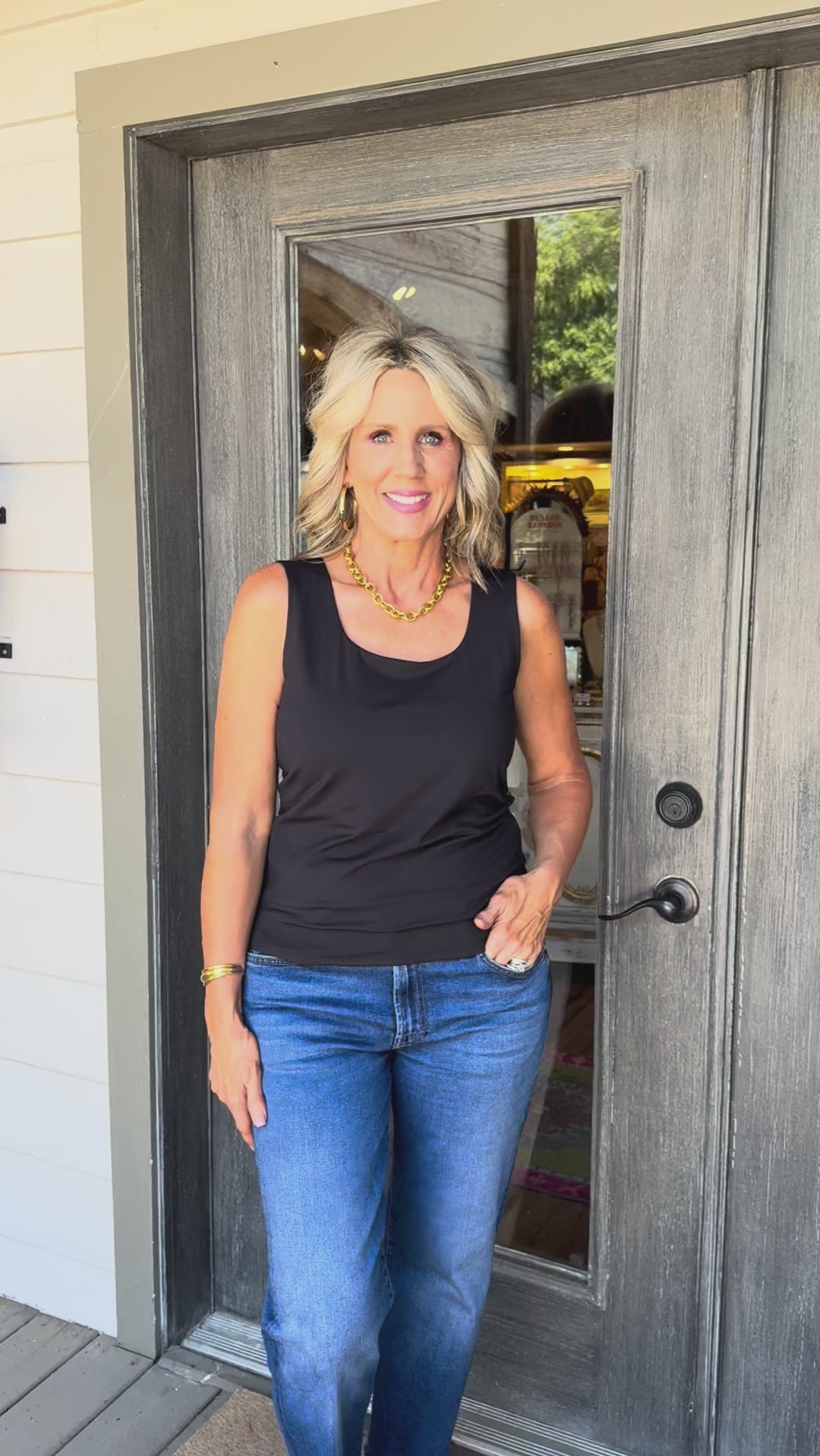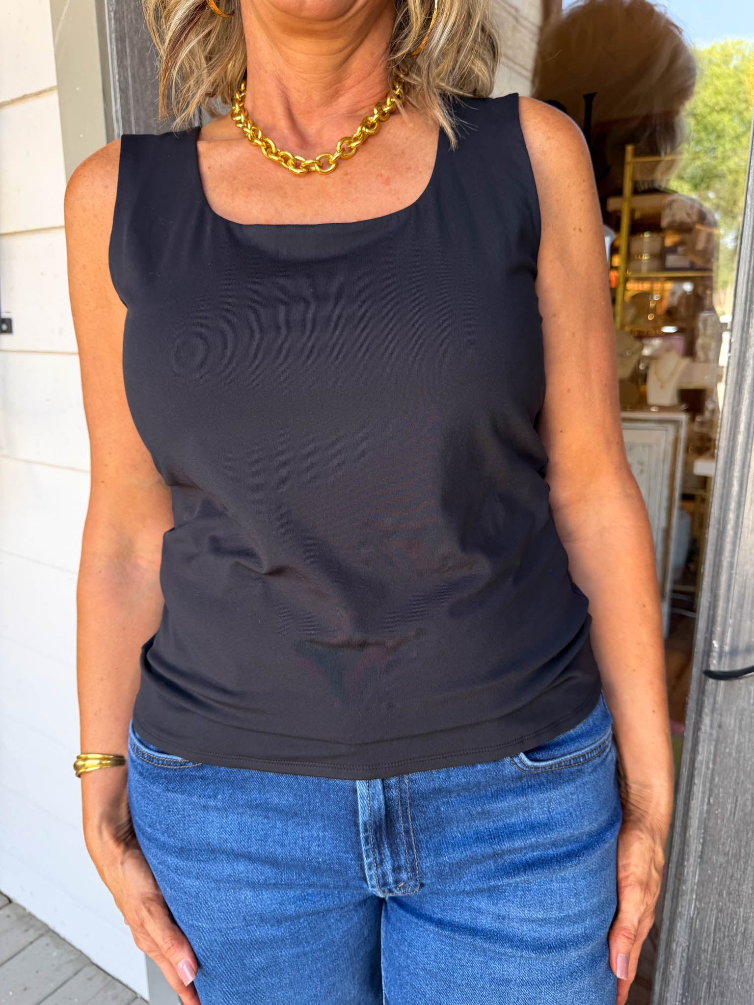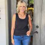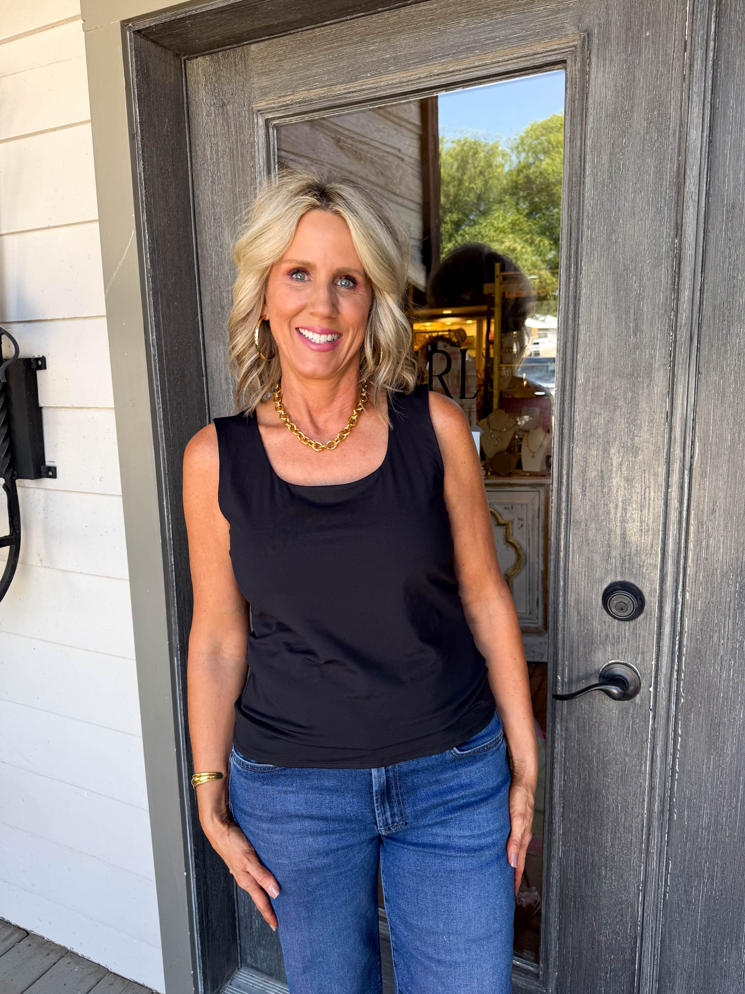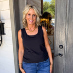 Experience ultimate comfort and style with the Black Evie Scoop Neck Tank, featuring a butter-soft wide strap perfect for any casual adventure.