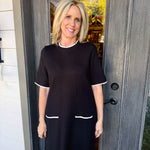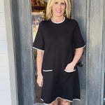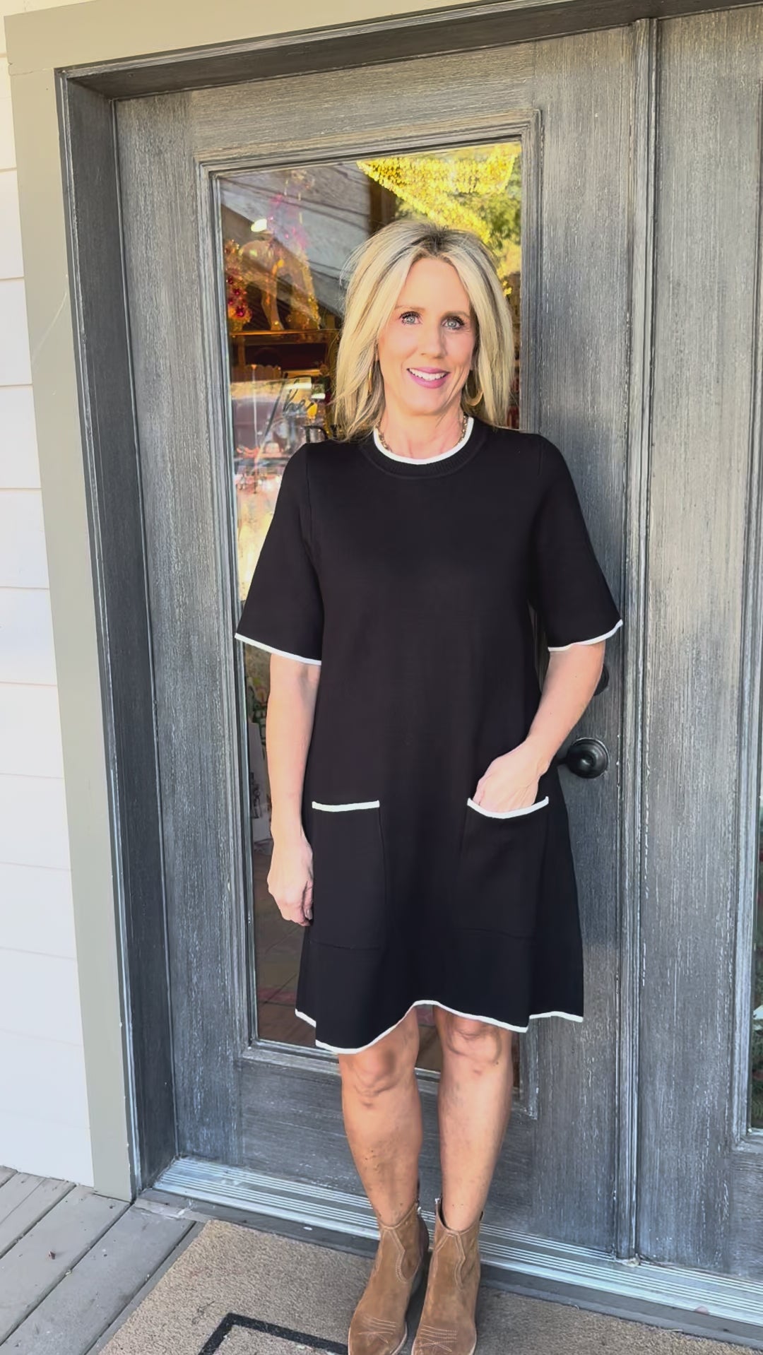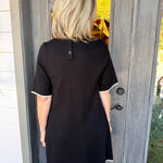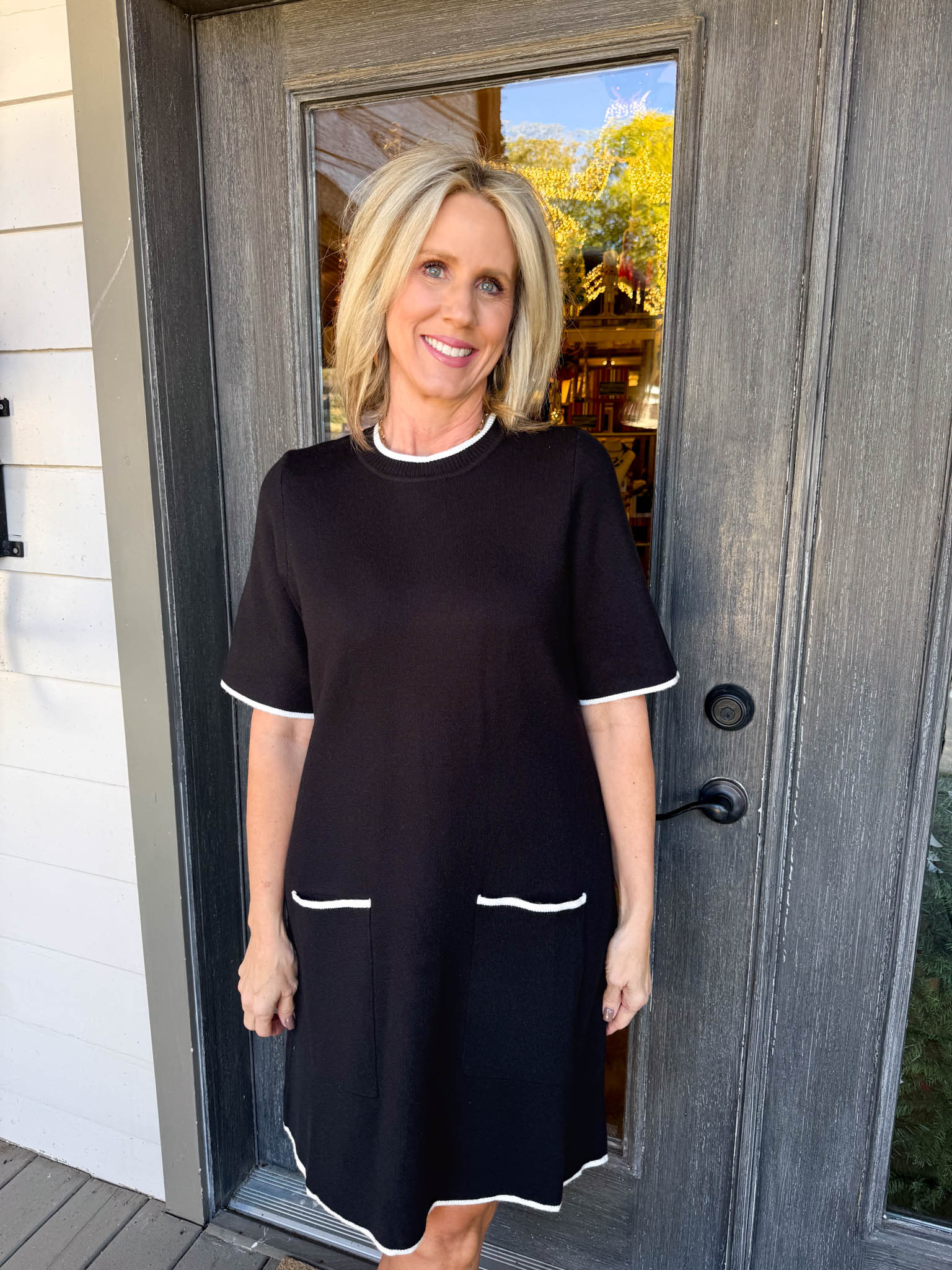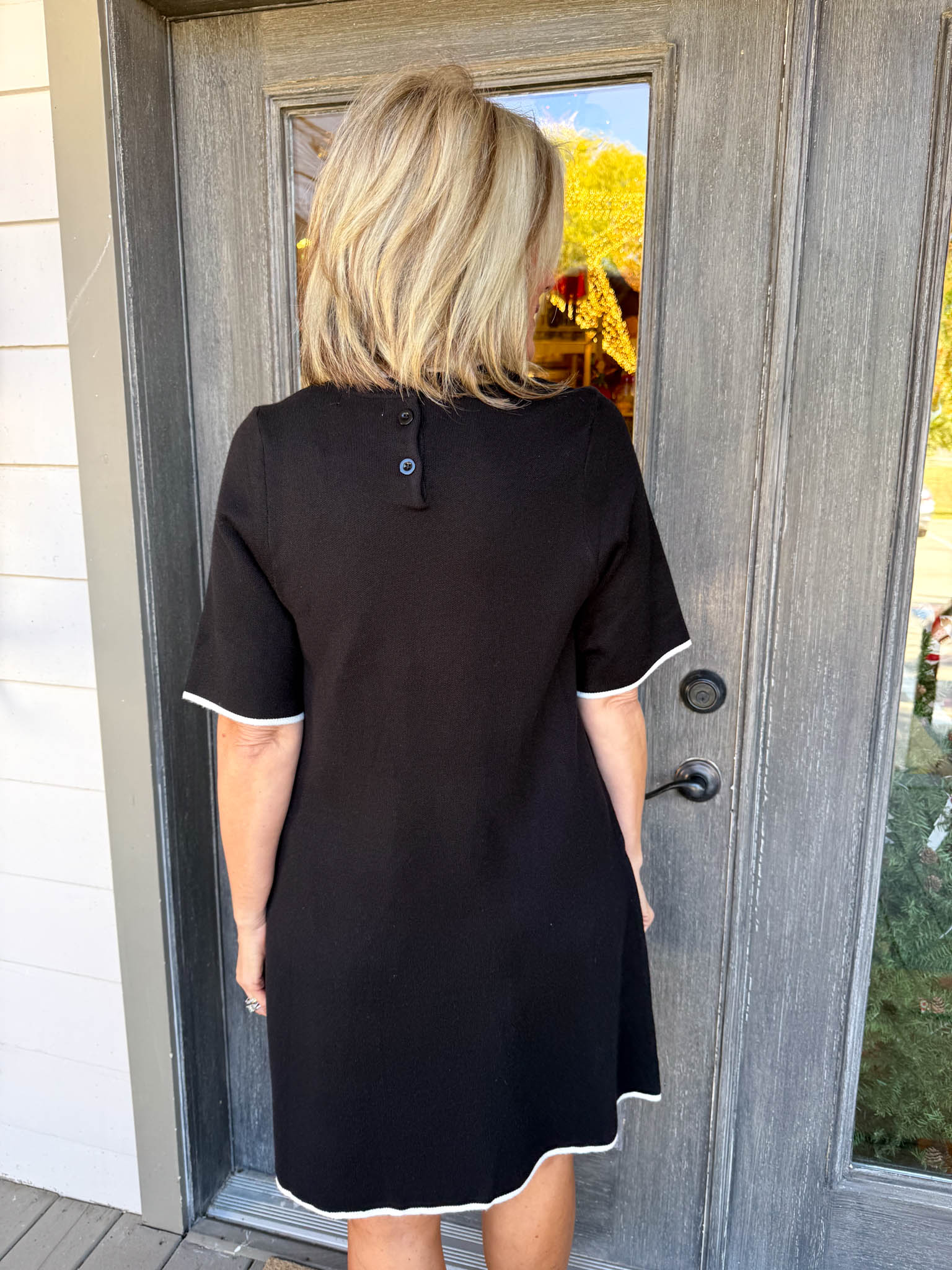 Go bold and chic with this sleek black mini dress that features playful contrast tipping for a look that's effortlessly put-together and ready for anything.