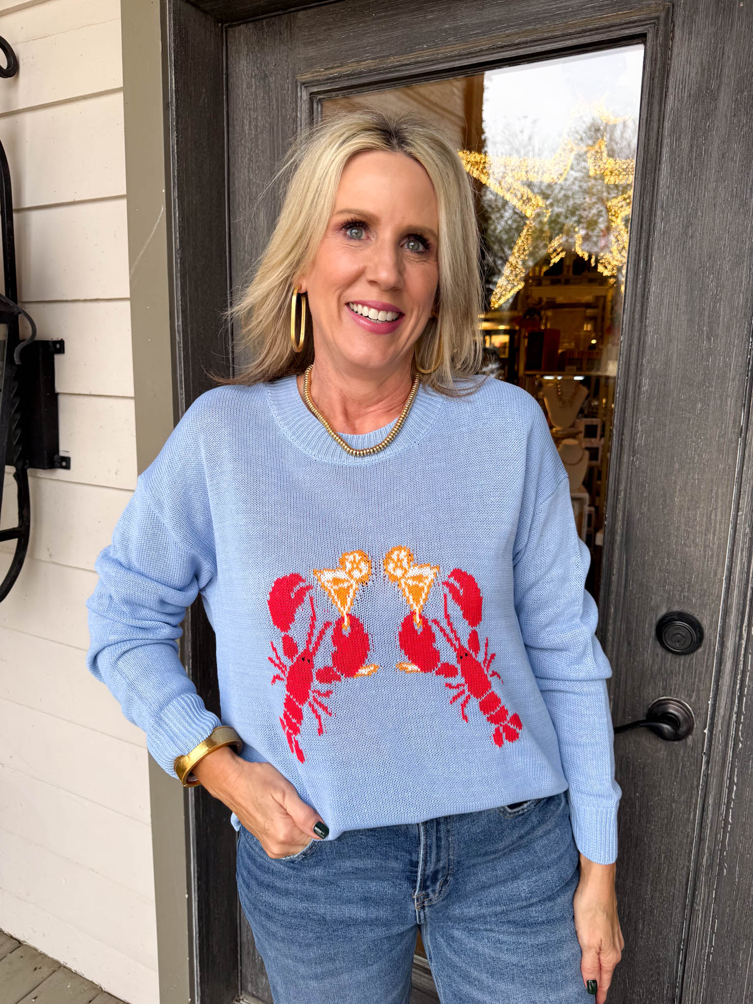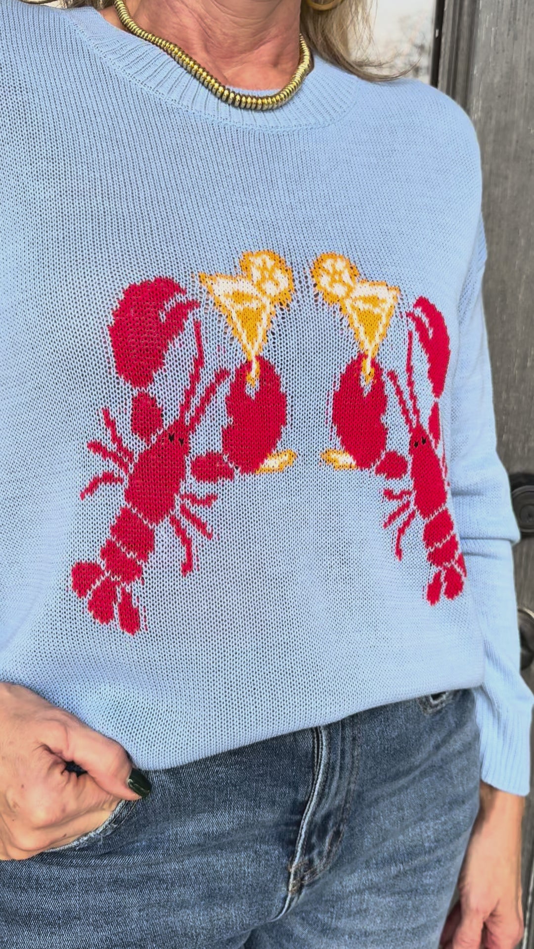Dive into coastal charm with this whimsical blue lobster graphic sweater that brings beachy vibes and personality to your everyday rotation.