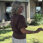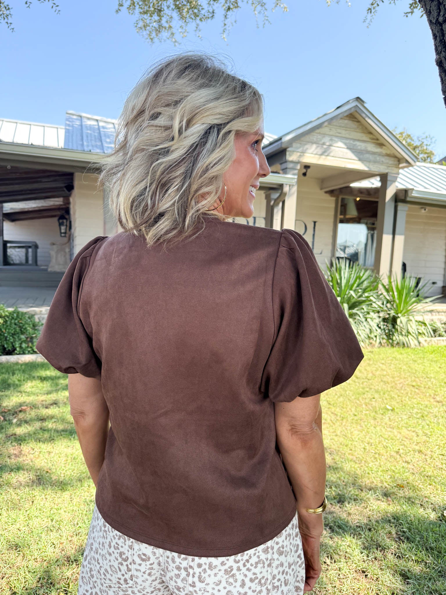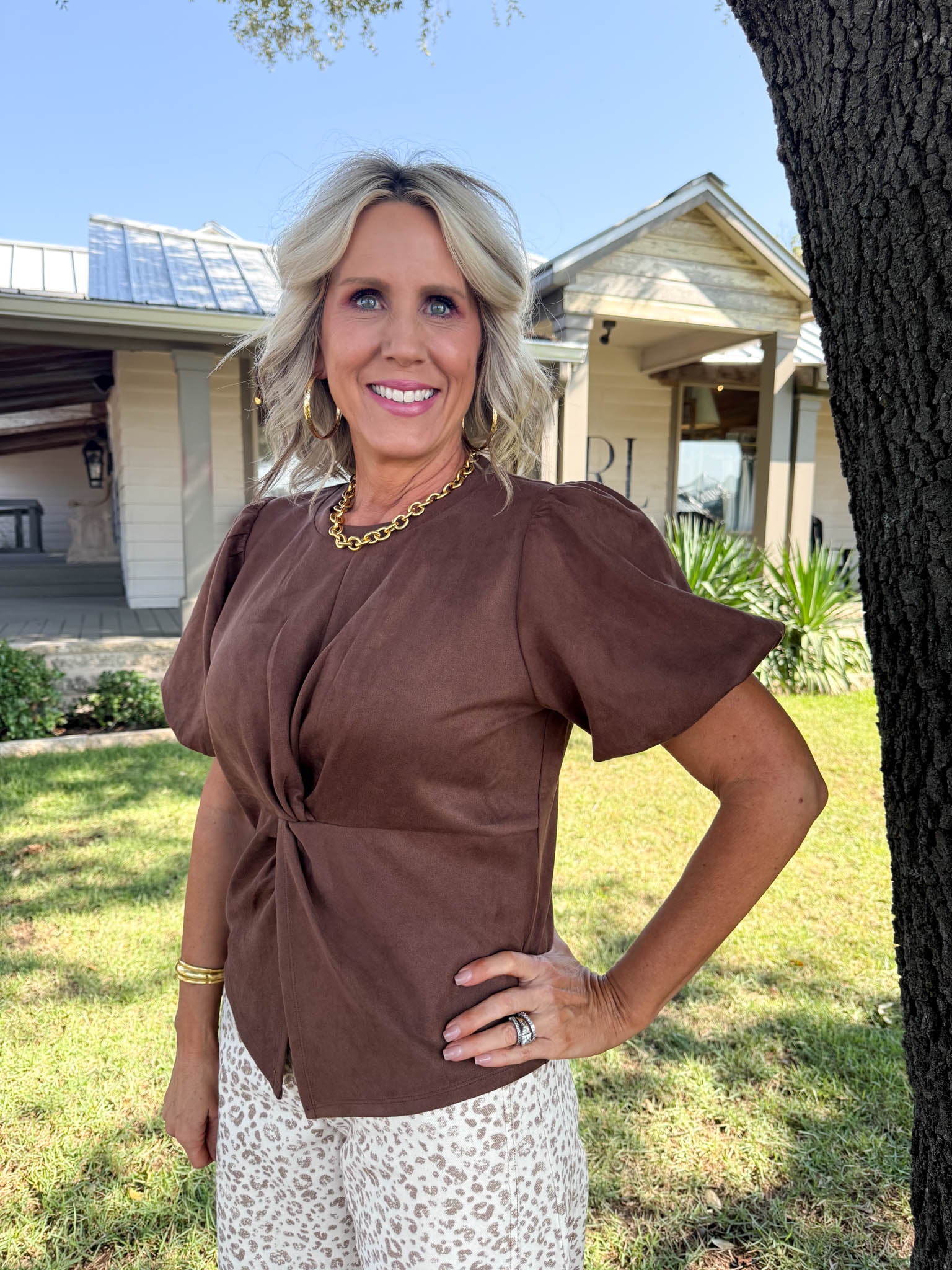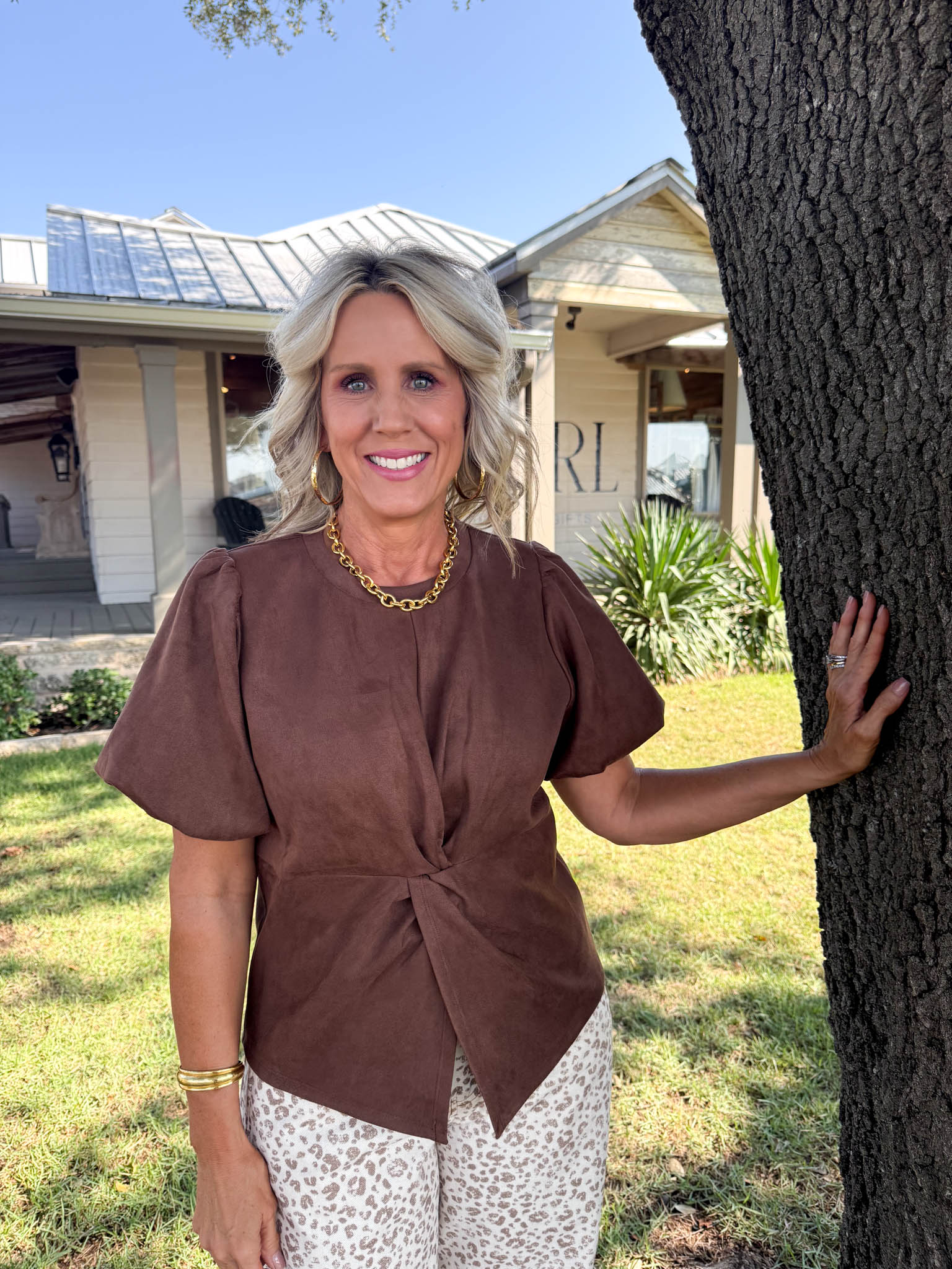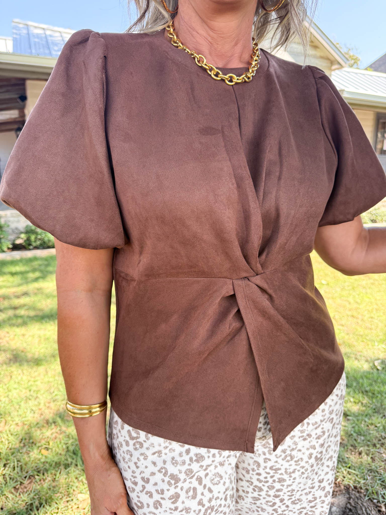 The Brodie Blouse turns heads with its puff sleeves and twisted suede detail, adding flirty flair to every look.