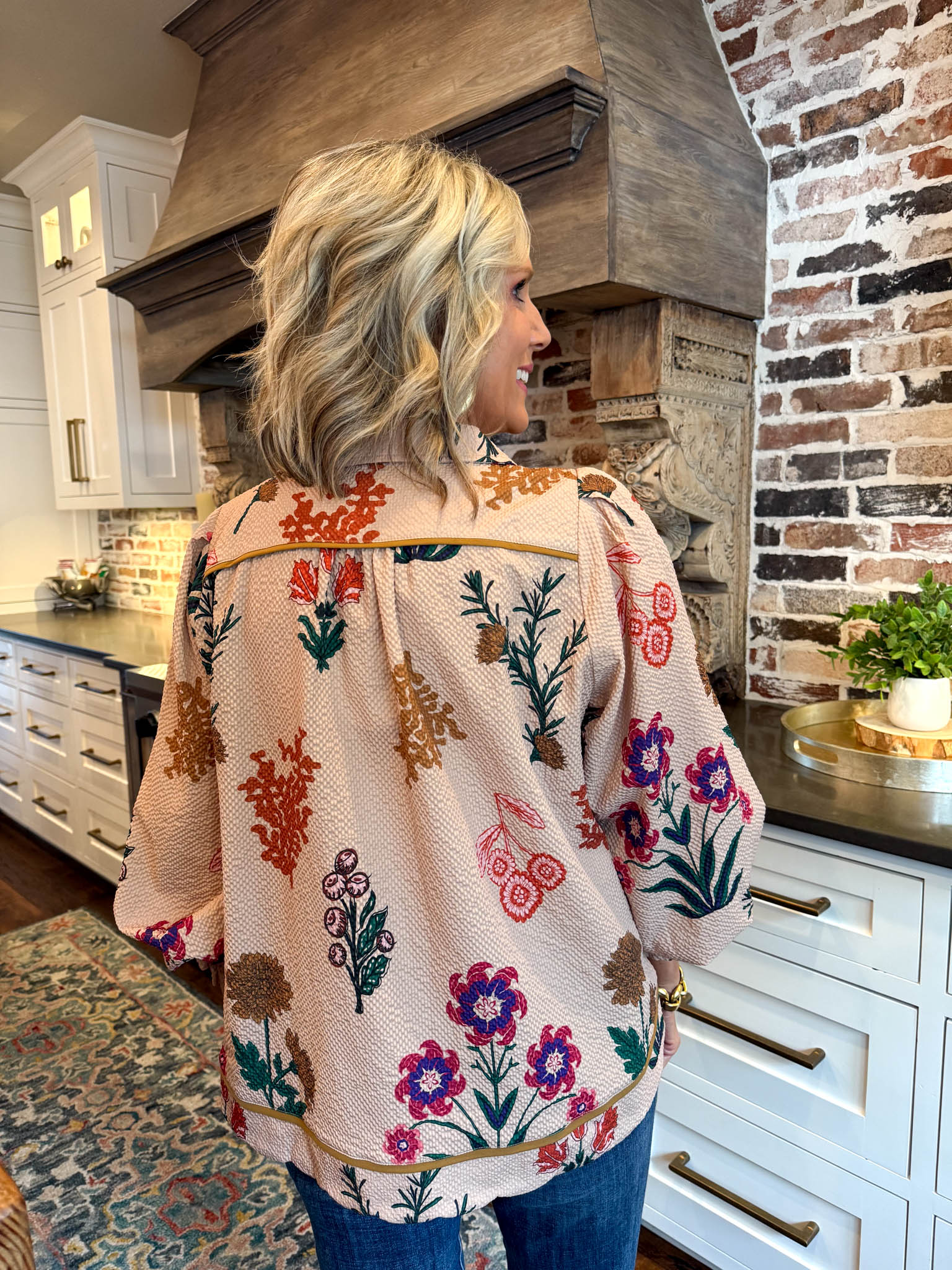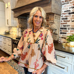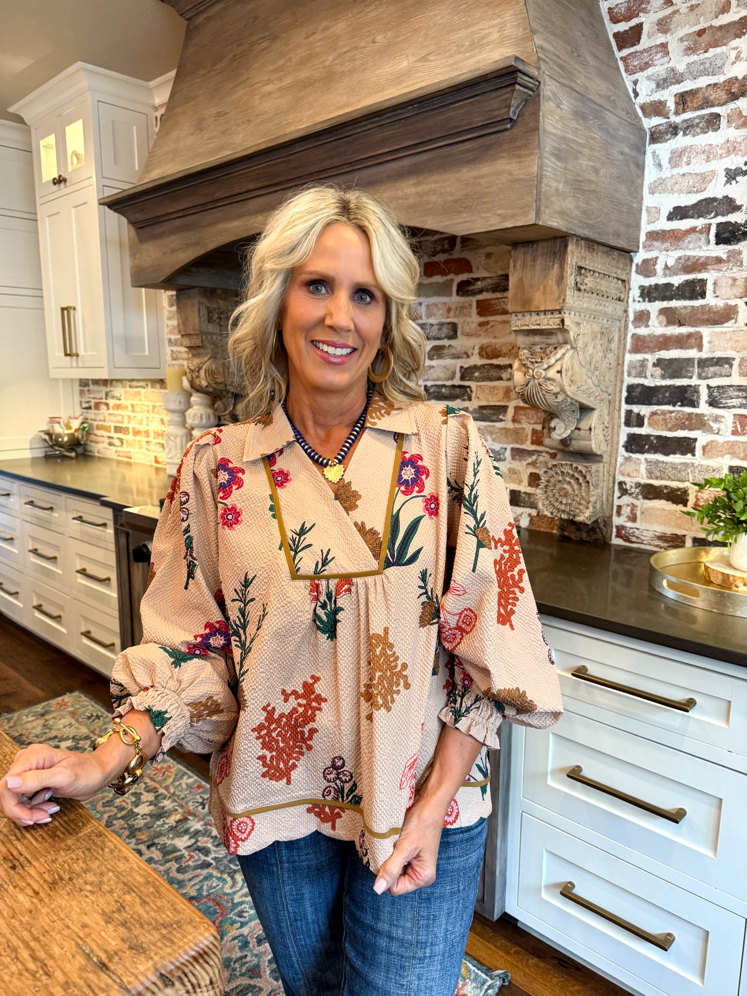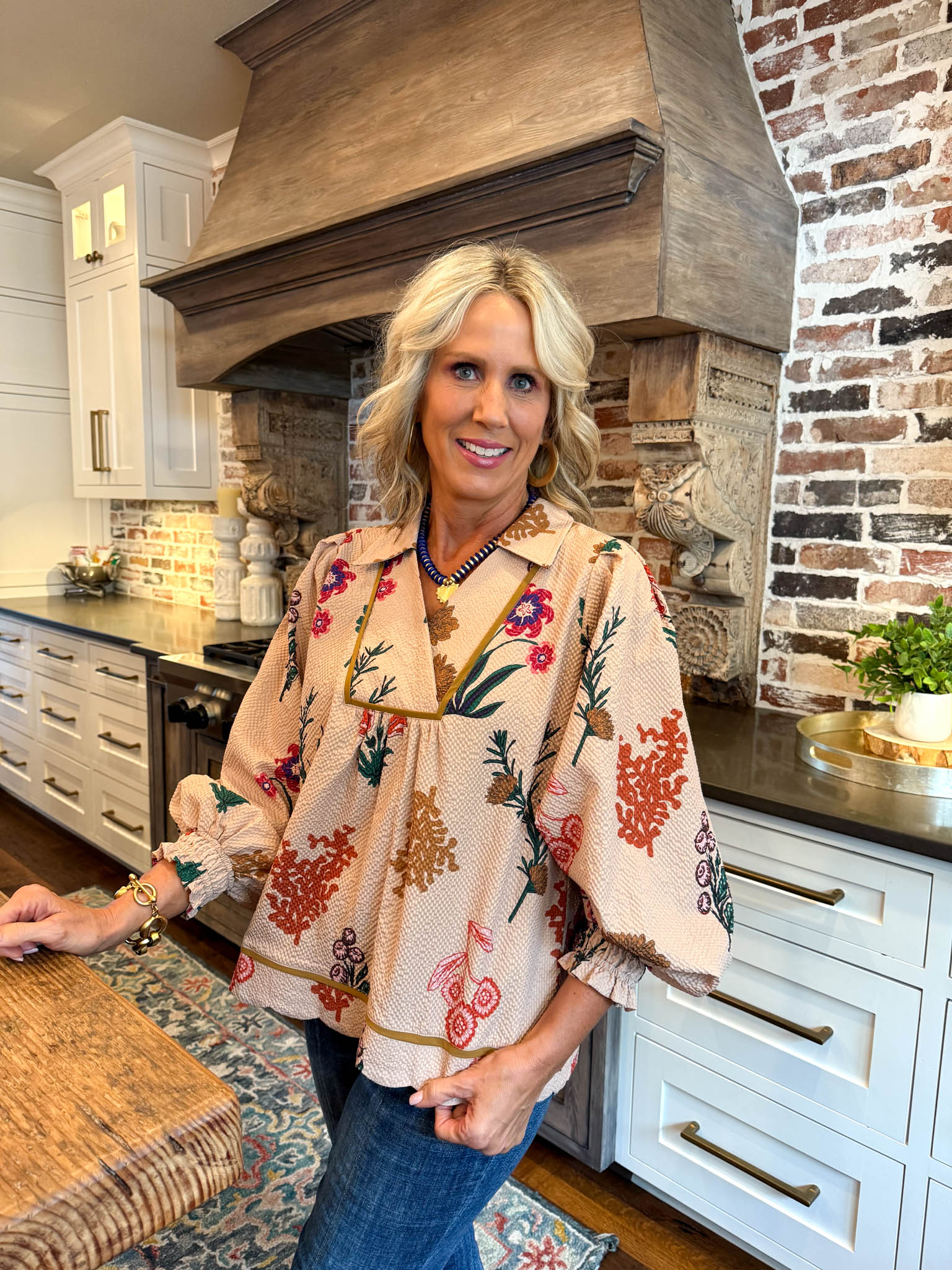 Elevate your style with the Calliope Blouse—a playful mix of tan warmth and delicate floral charm, perfect for turning heads wherever you go.