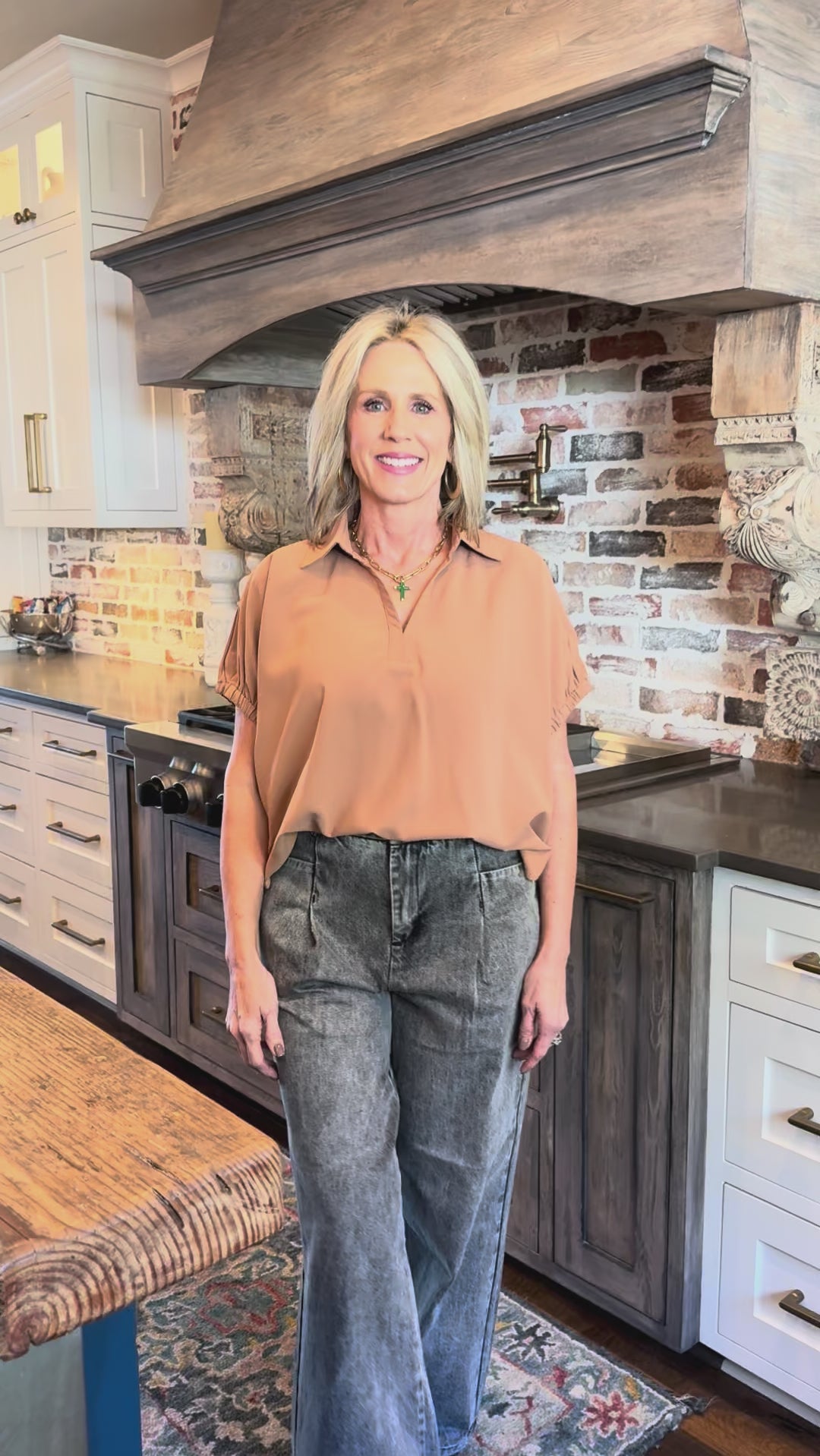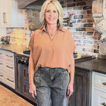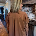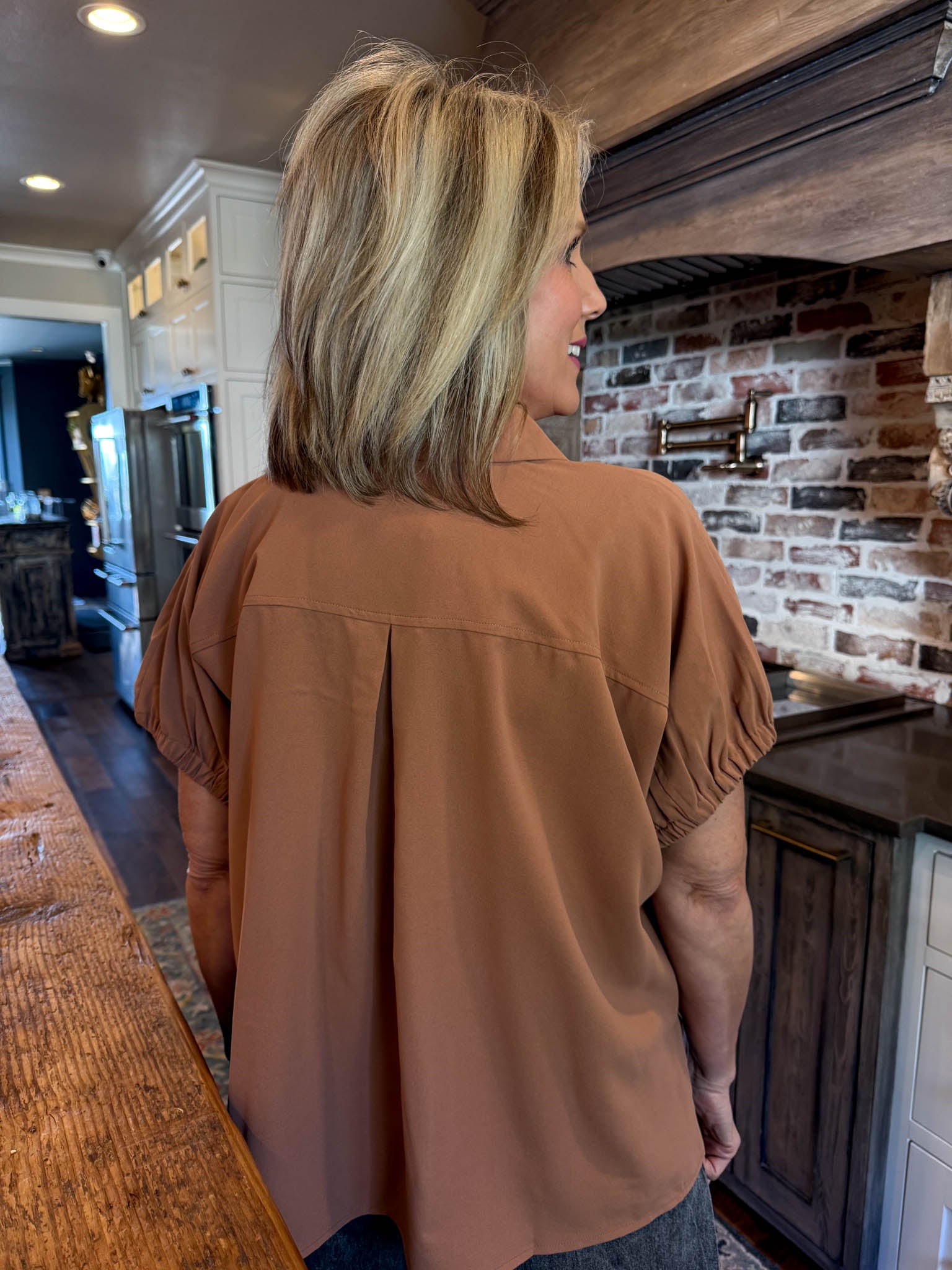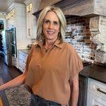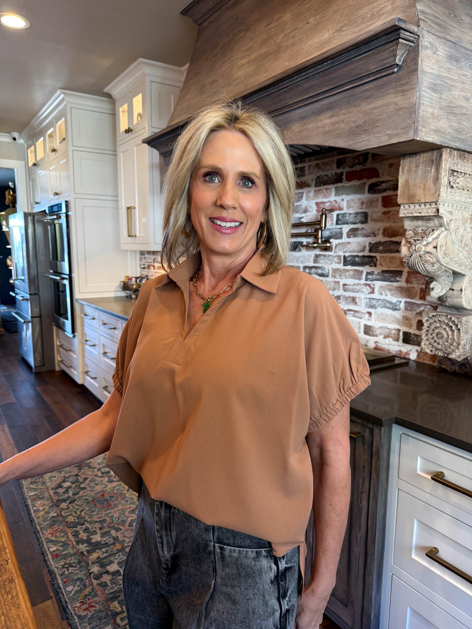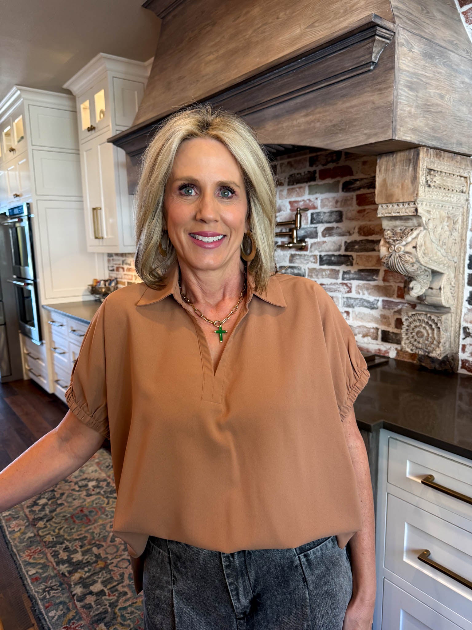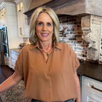 Elevate your everyday style with this luxe camel blouse that effortlessly transitions from brunch to dinner.