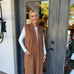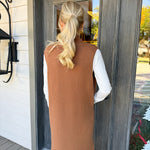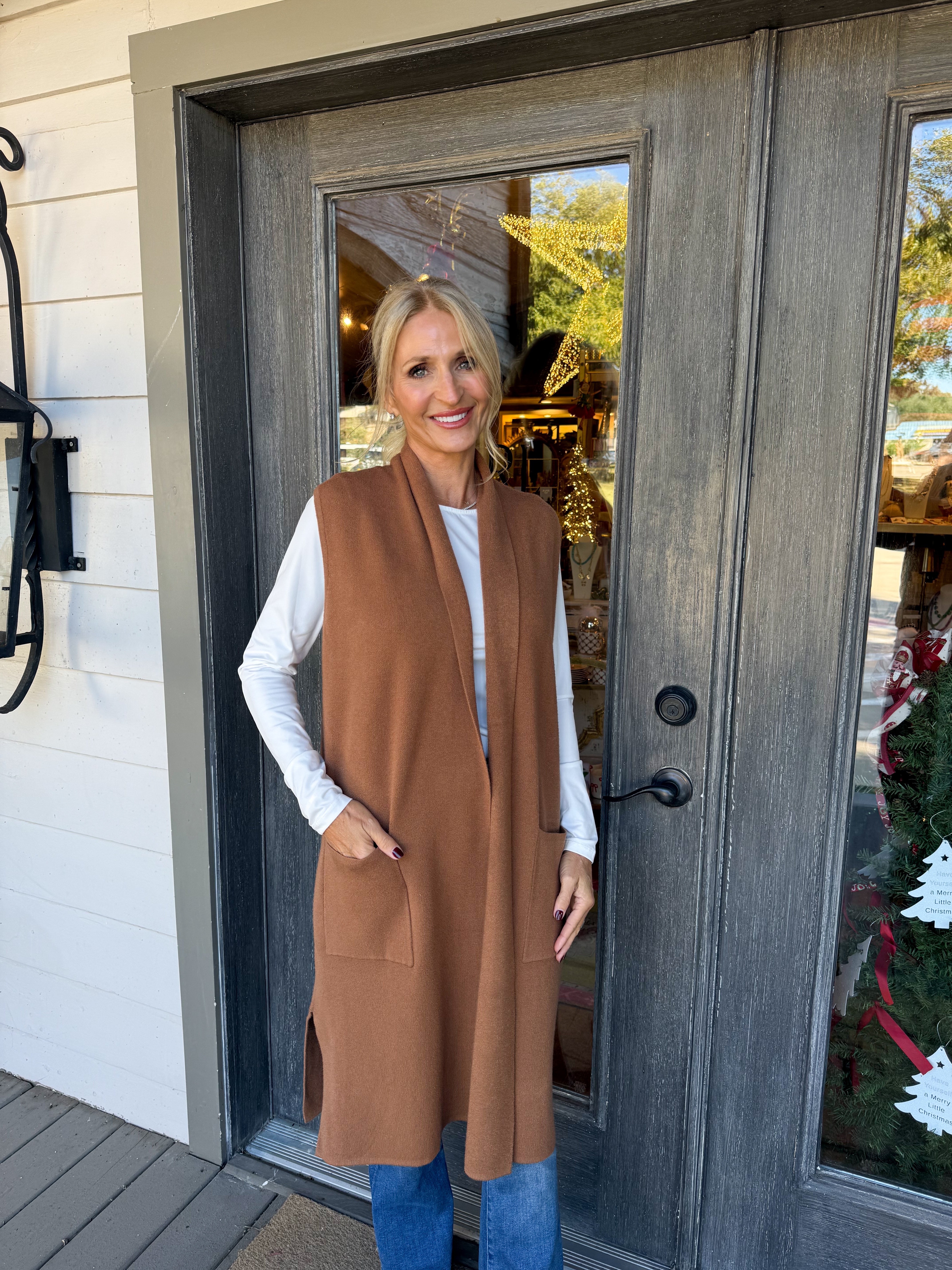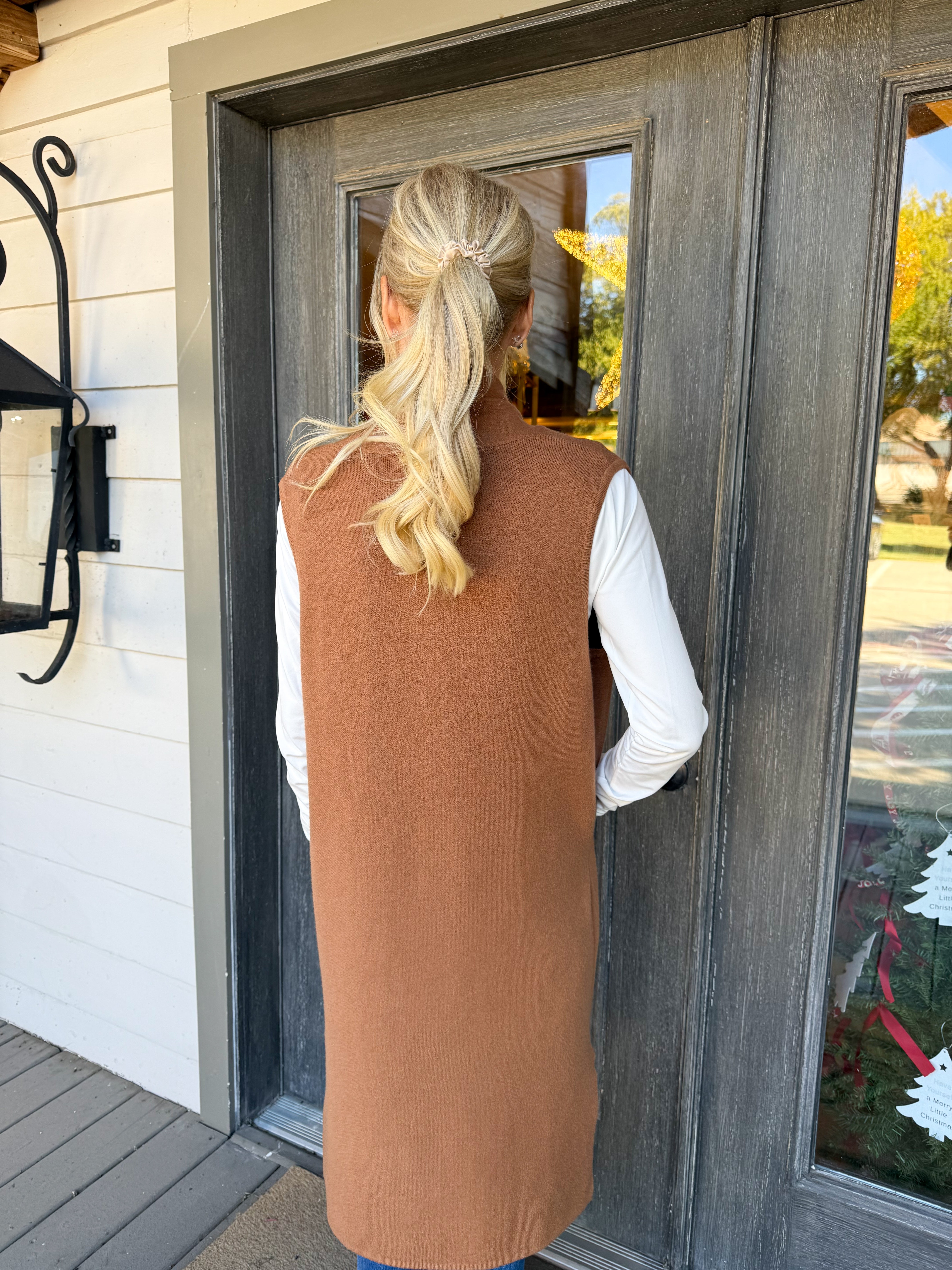 This camel sleeveless cardigan is a great addition to any wardrobe. The open knitted design adds texture and the color is a trendy neutral. Perfect for layering, this cardigan adds a touch of playfulness to any outfit.