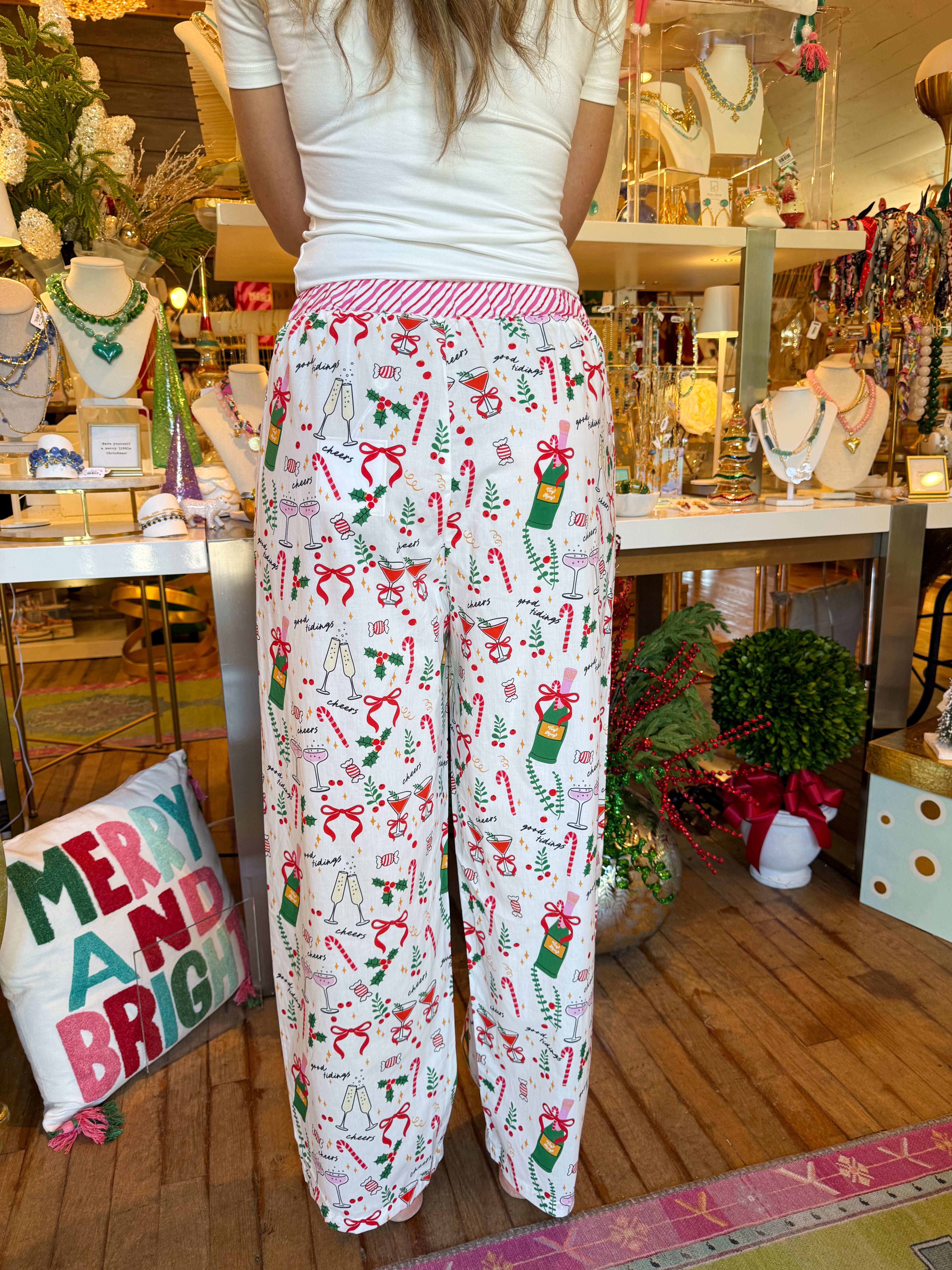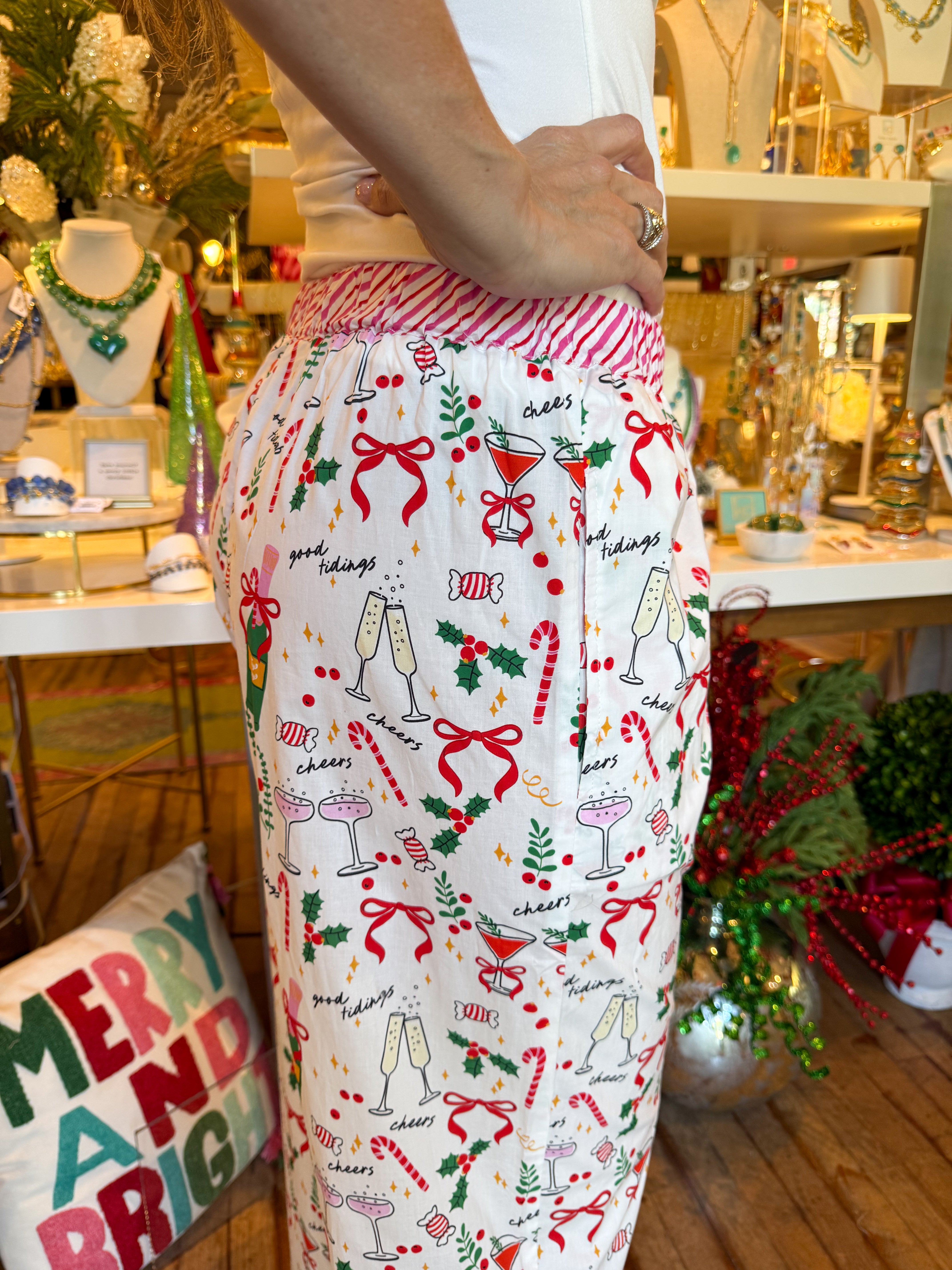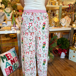 Celebrate every cozy moment in these white pajama pants, featuring playful prints of champagne bottles, drinks, and peppermints that add a festive touch to your loungewear.