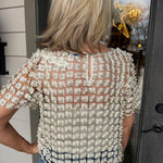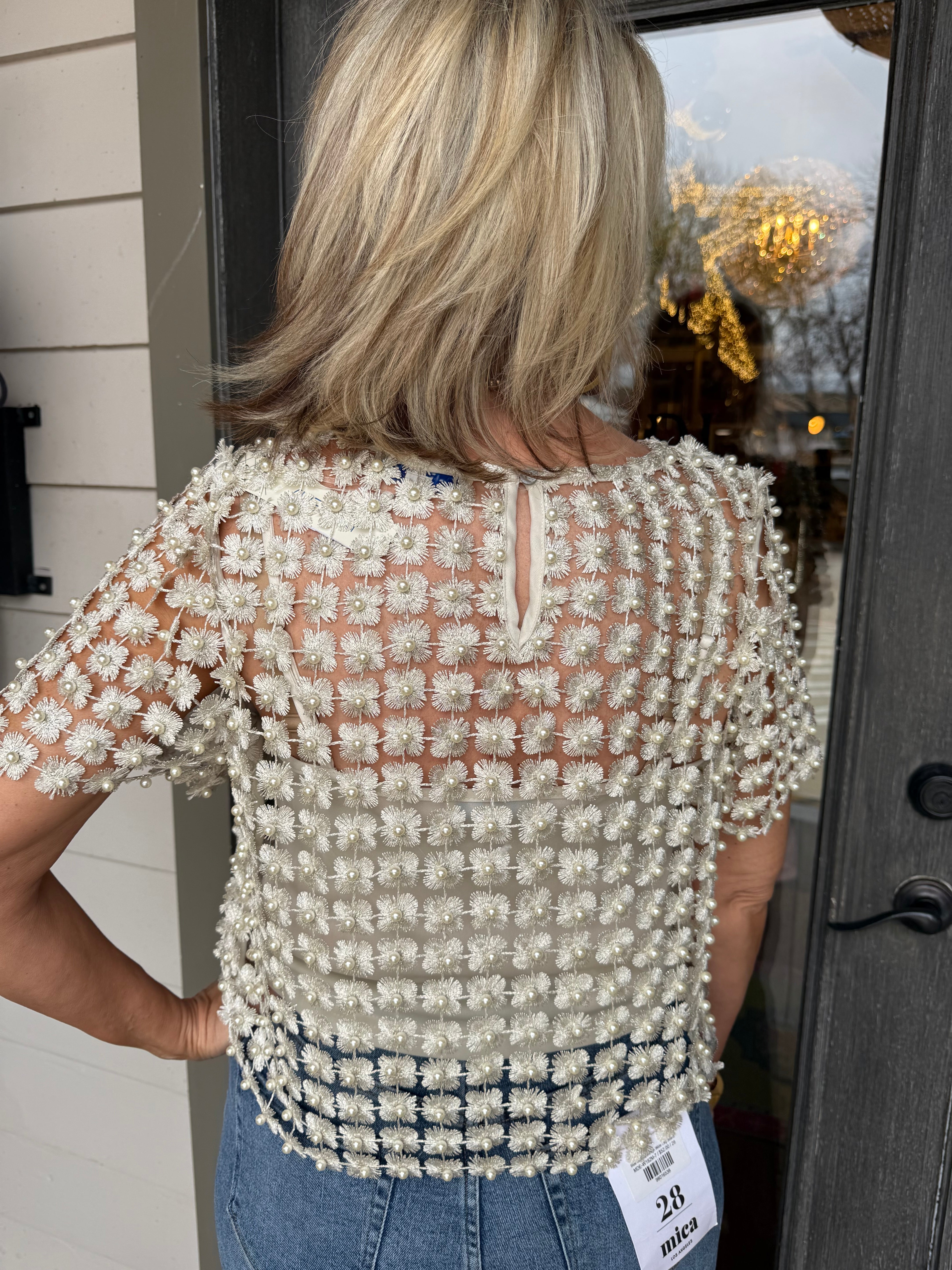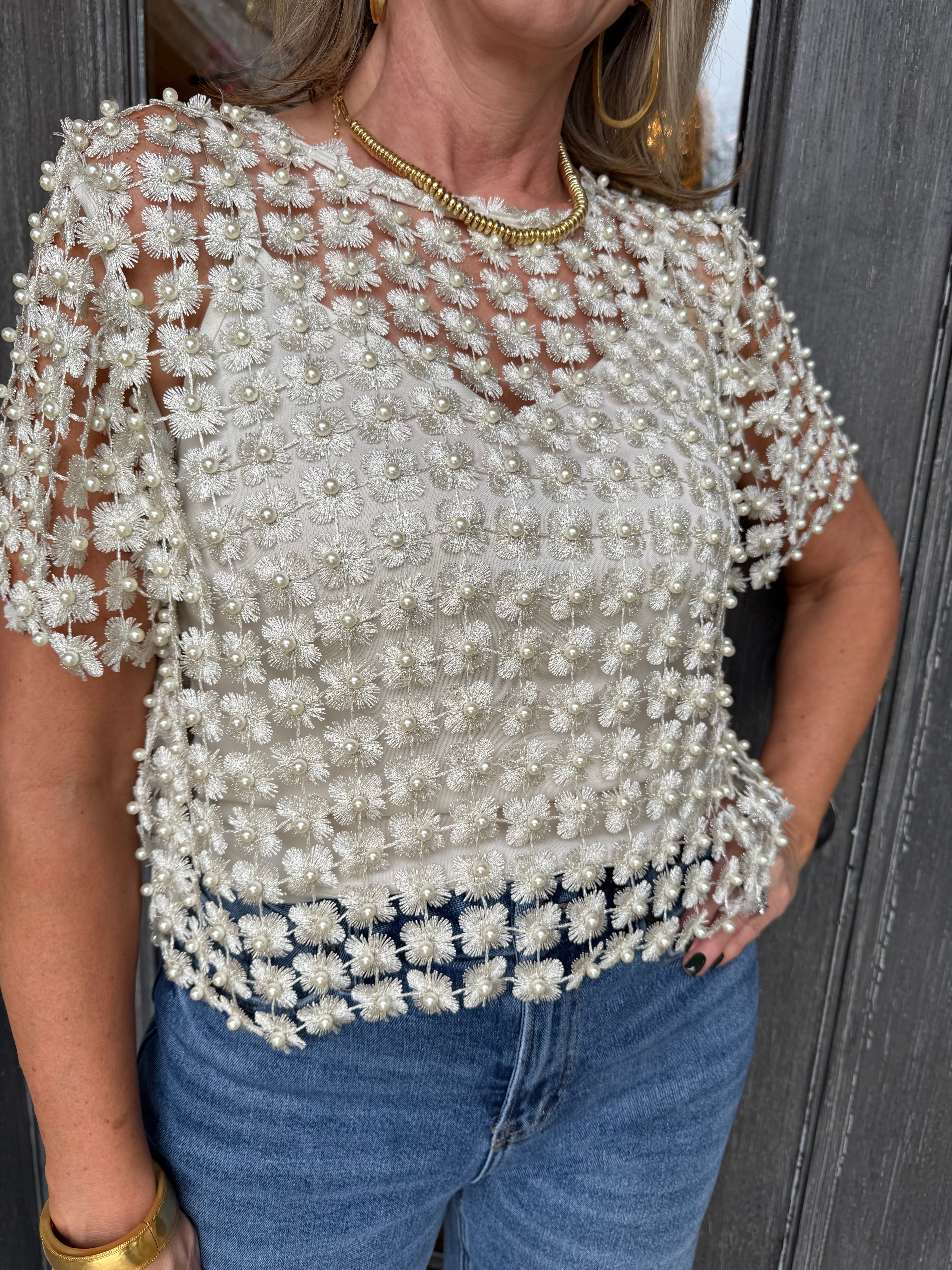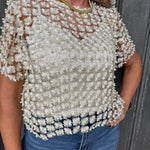 Drape yourself in delicate elegance with this shimmering crochet lace top, adorned with lustrous pearl beads that catch the light with every move.