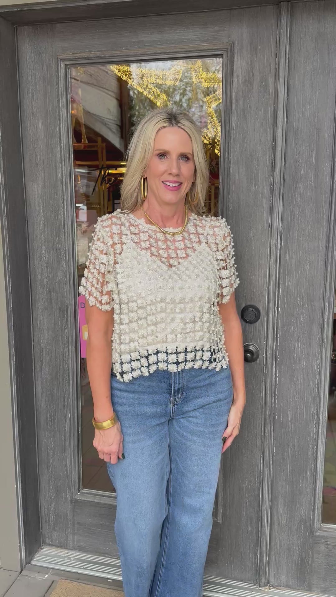 • Intricate crochet detailing paired with pearl beading creates an effortlessly sophisticated look perfect for elevated casual or special occasions
