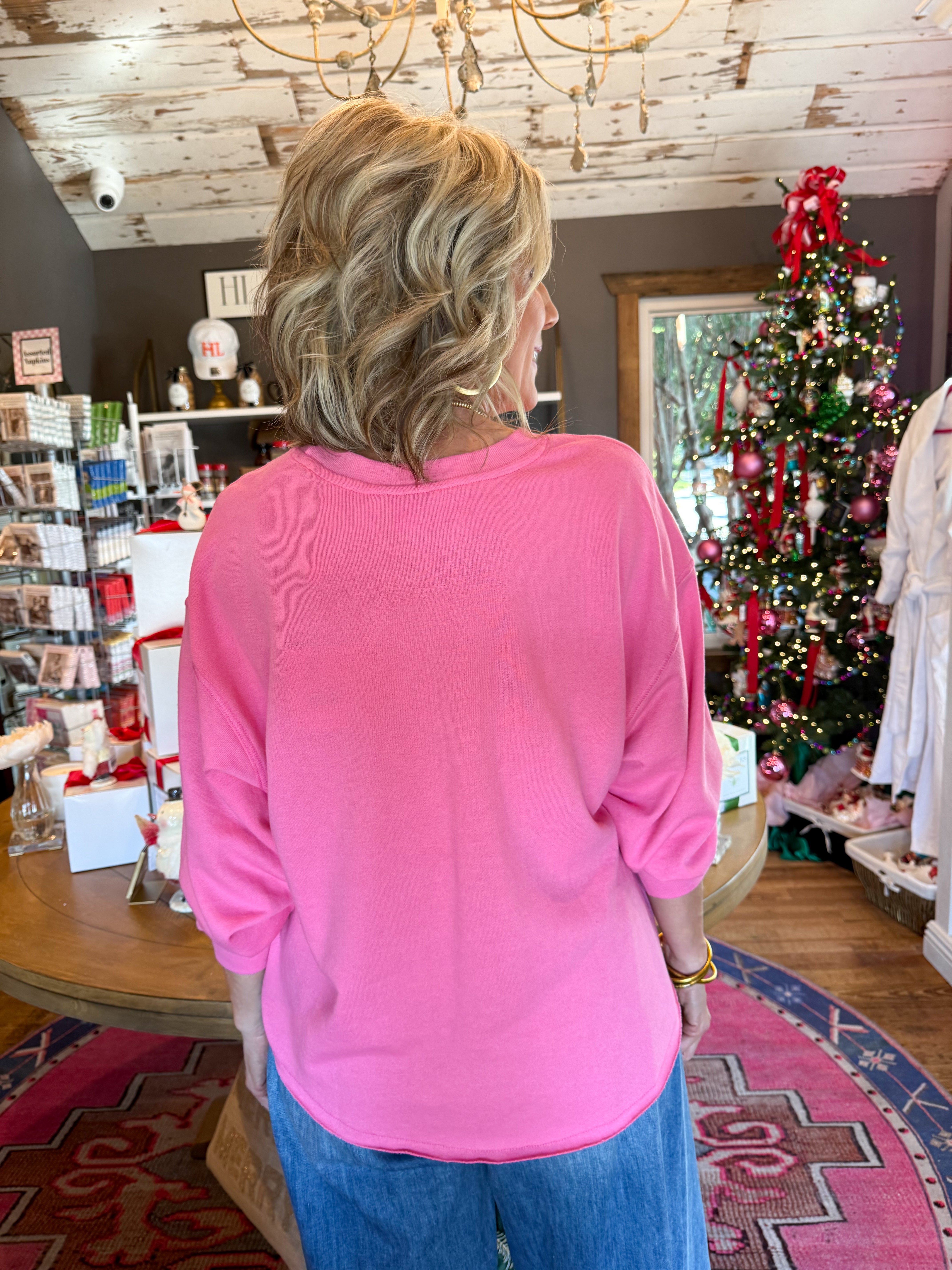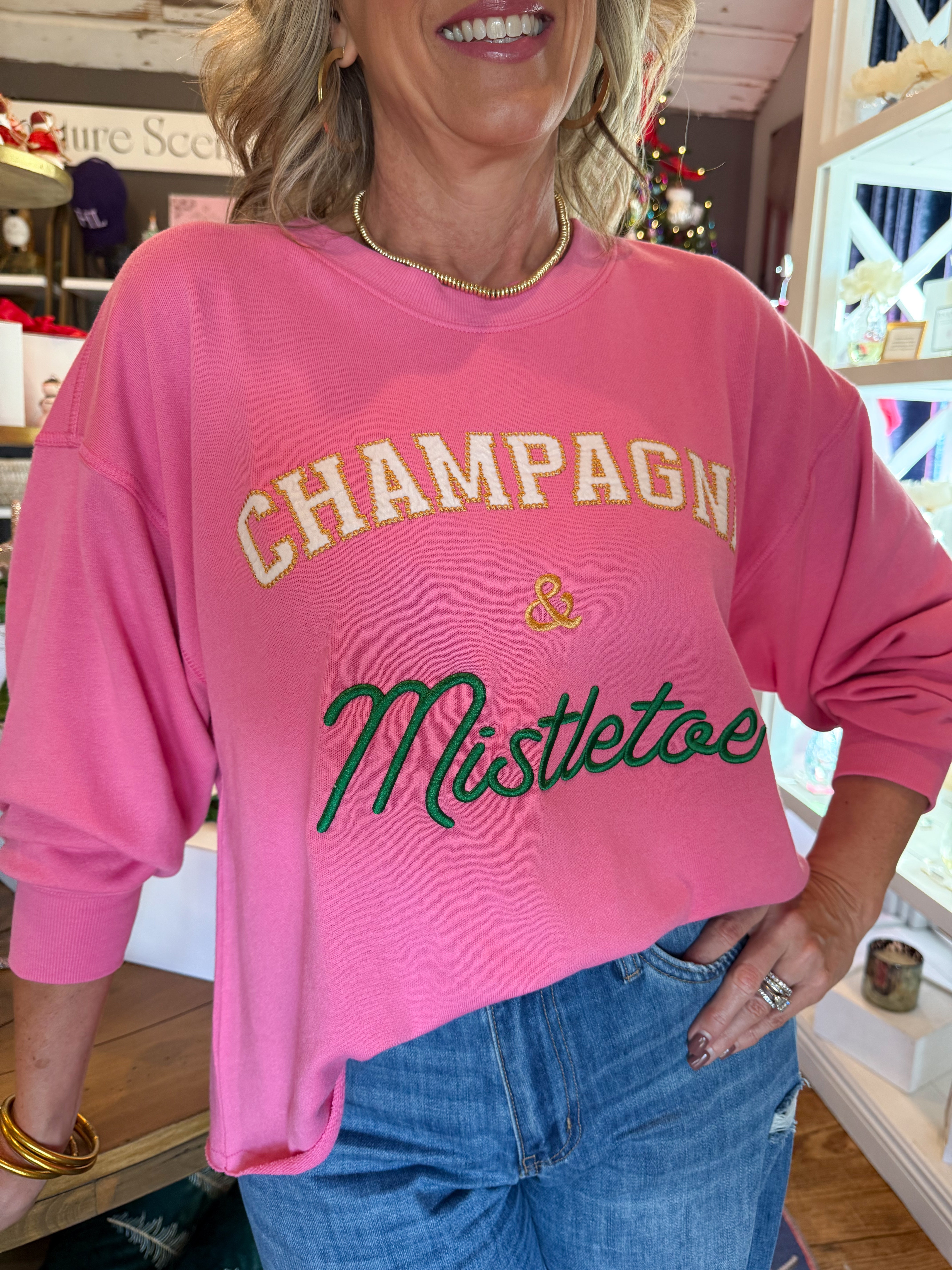 Celebrate the season in style with this cozy pink sweatshirt adorned with sparkling gold and green embroidery that proudly reads Champagne & Mistletoe.