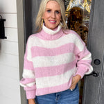 • Soft pink and white stripes paired with a flattering high neckline for effortless sophistication