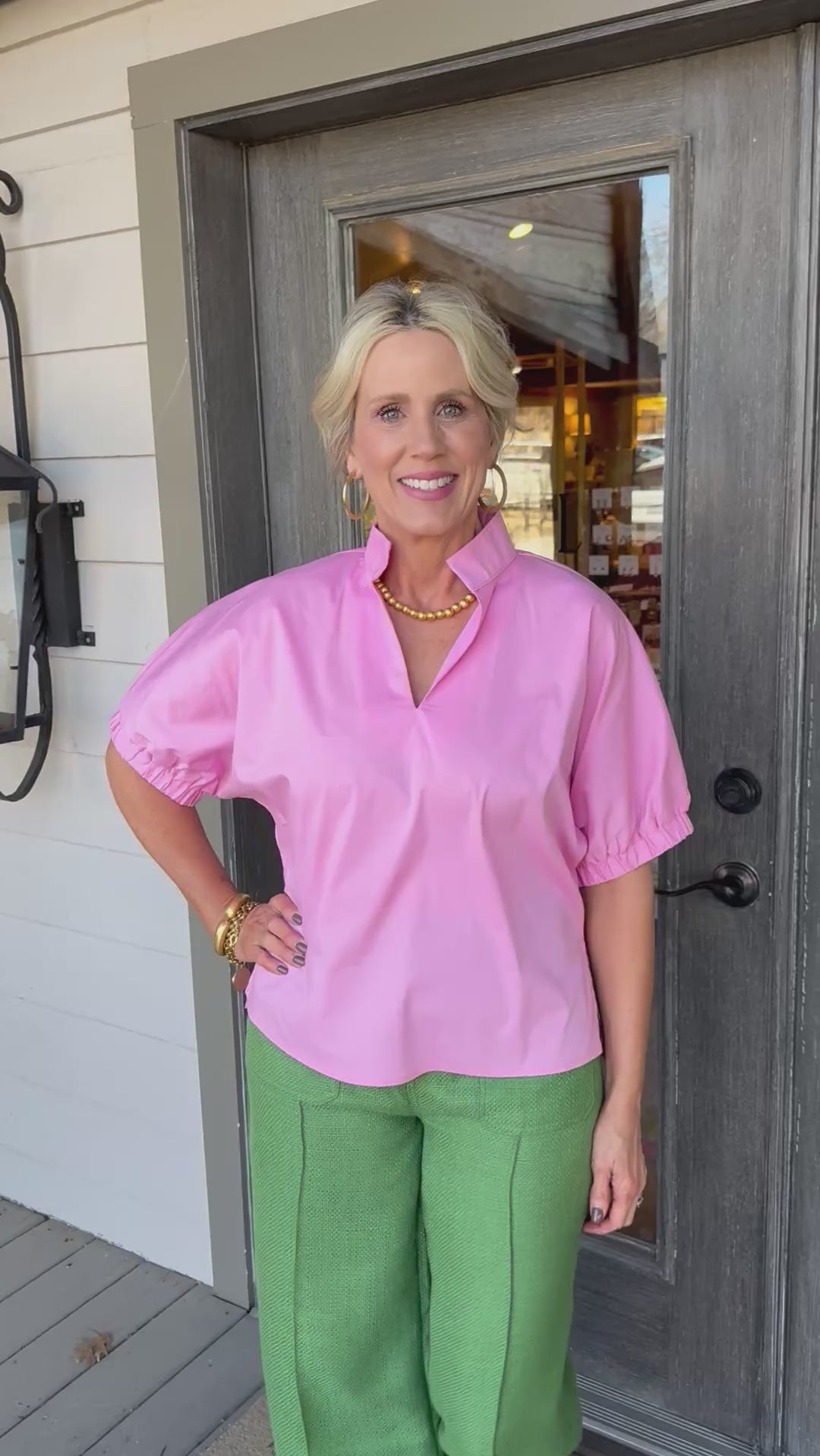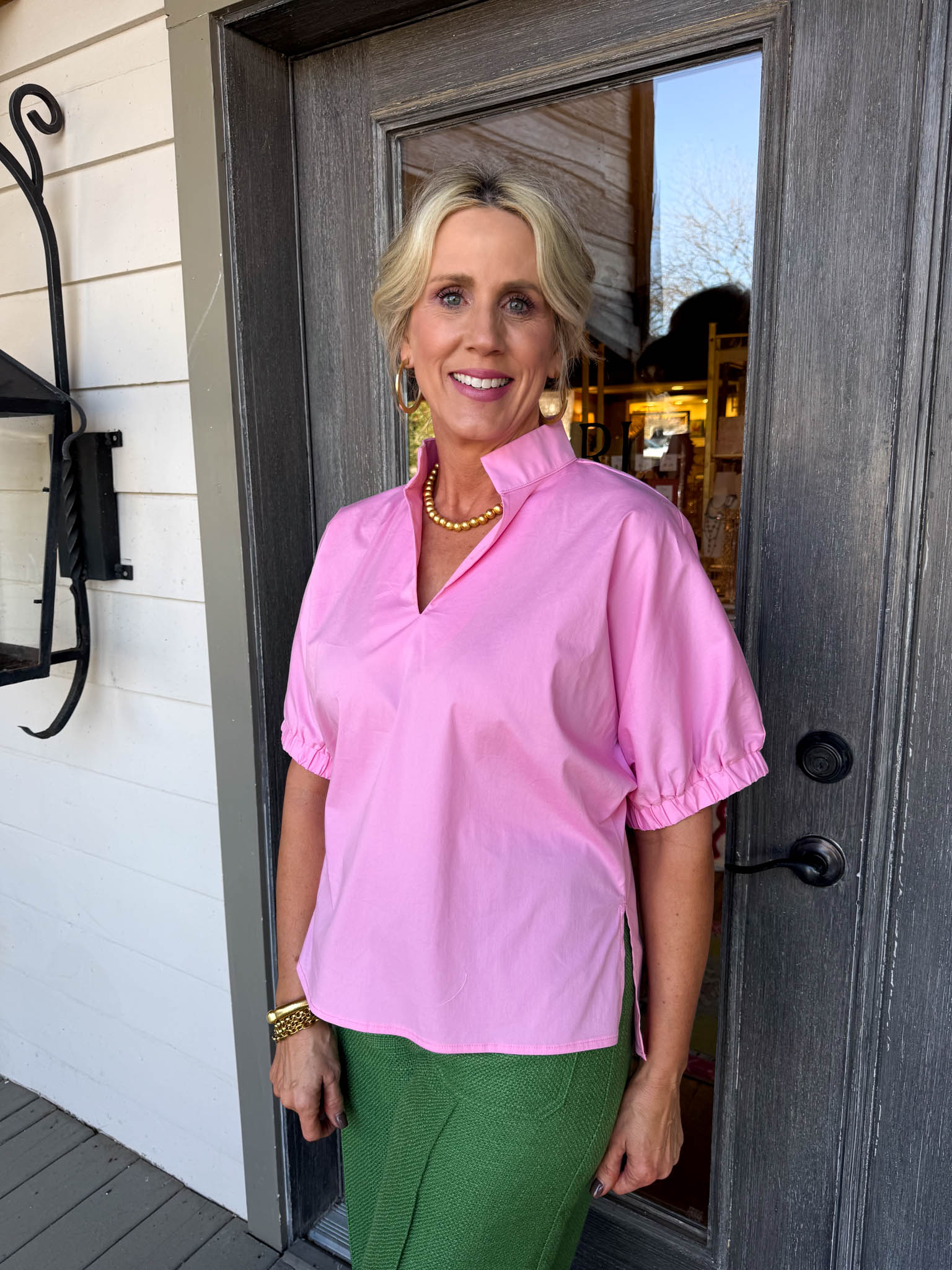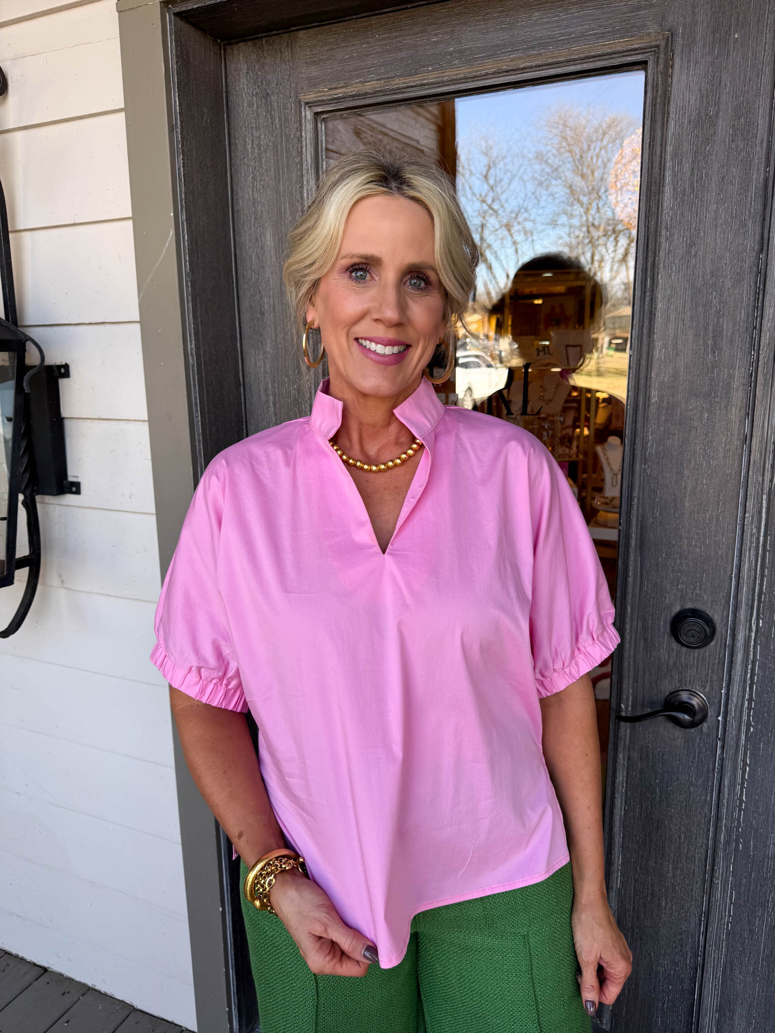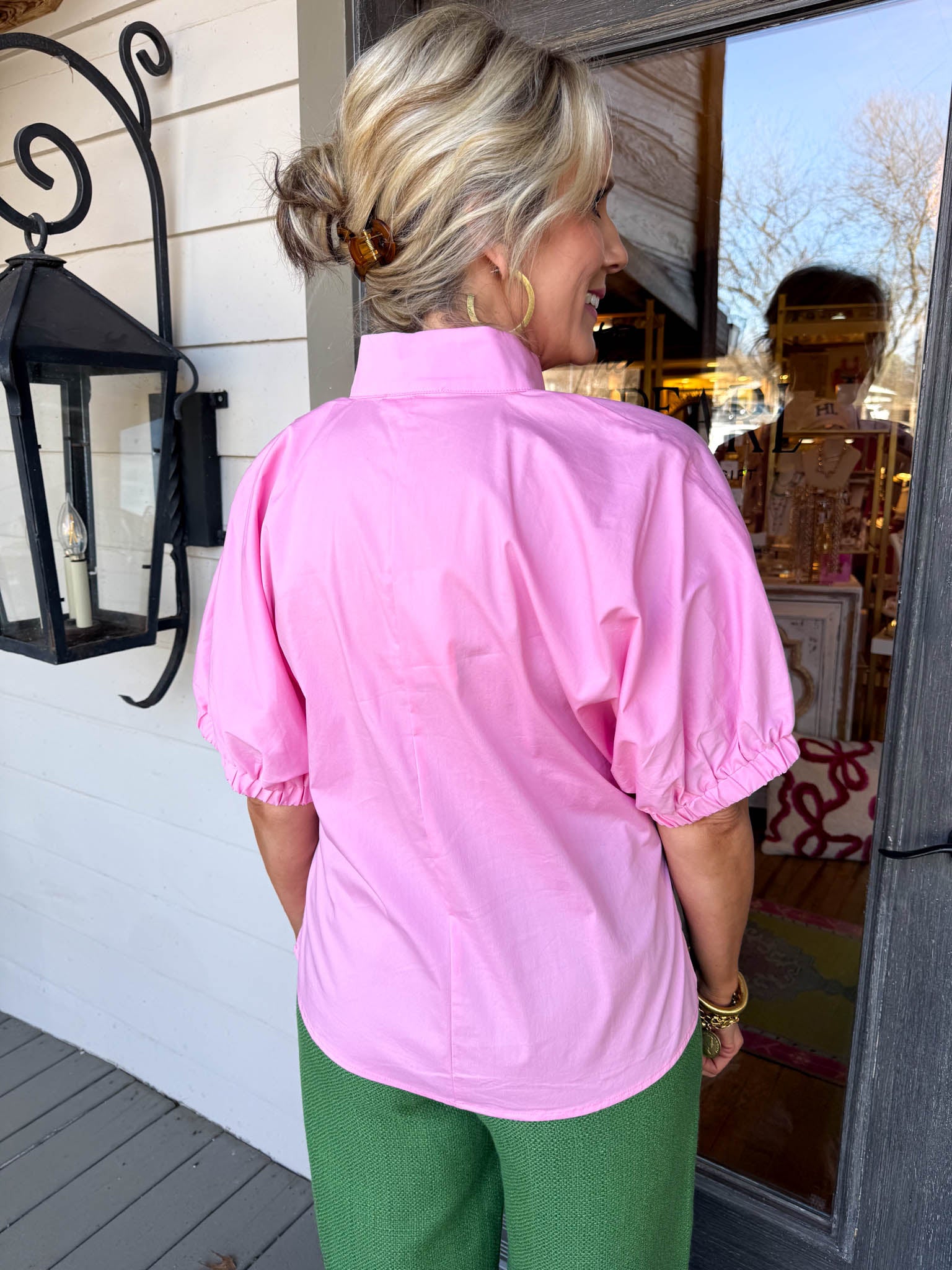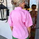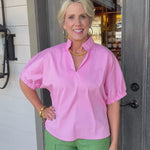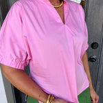 Elevate your everyday style with this pink blouse, where soft puffy sleeves and a flattering V-neck create an instantly charming, versatile piece.