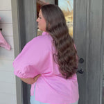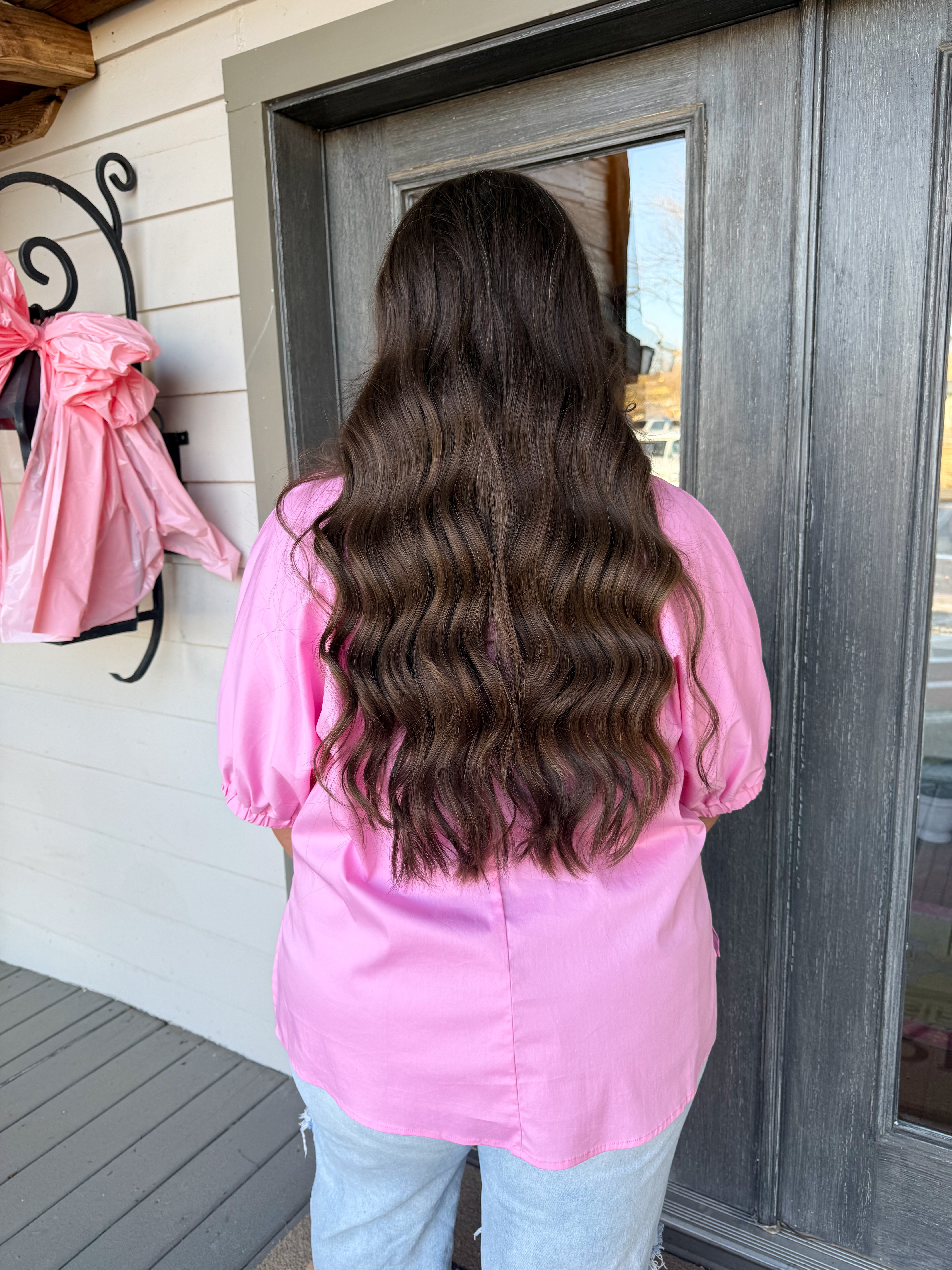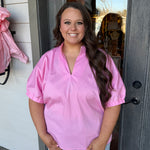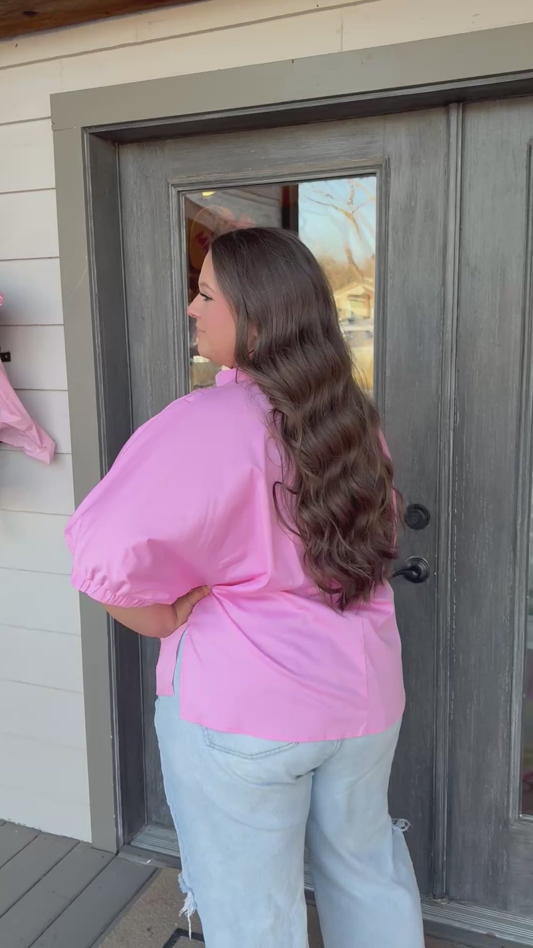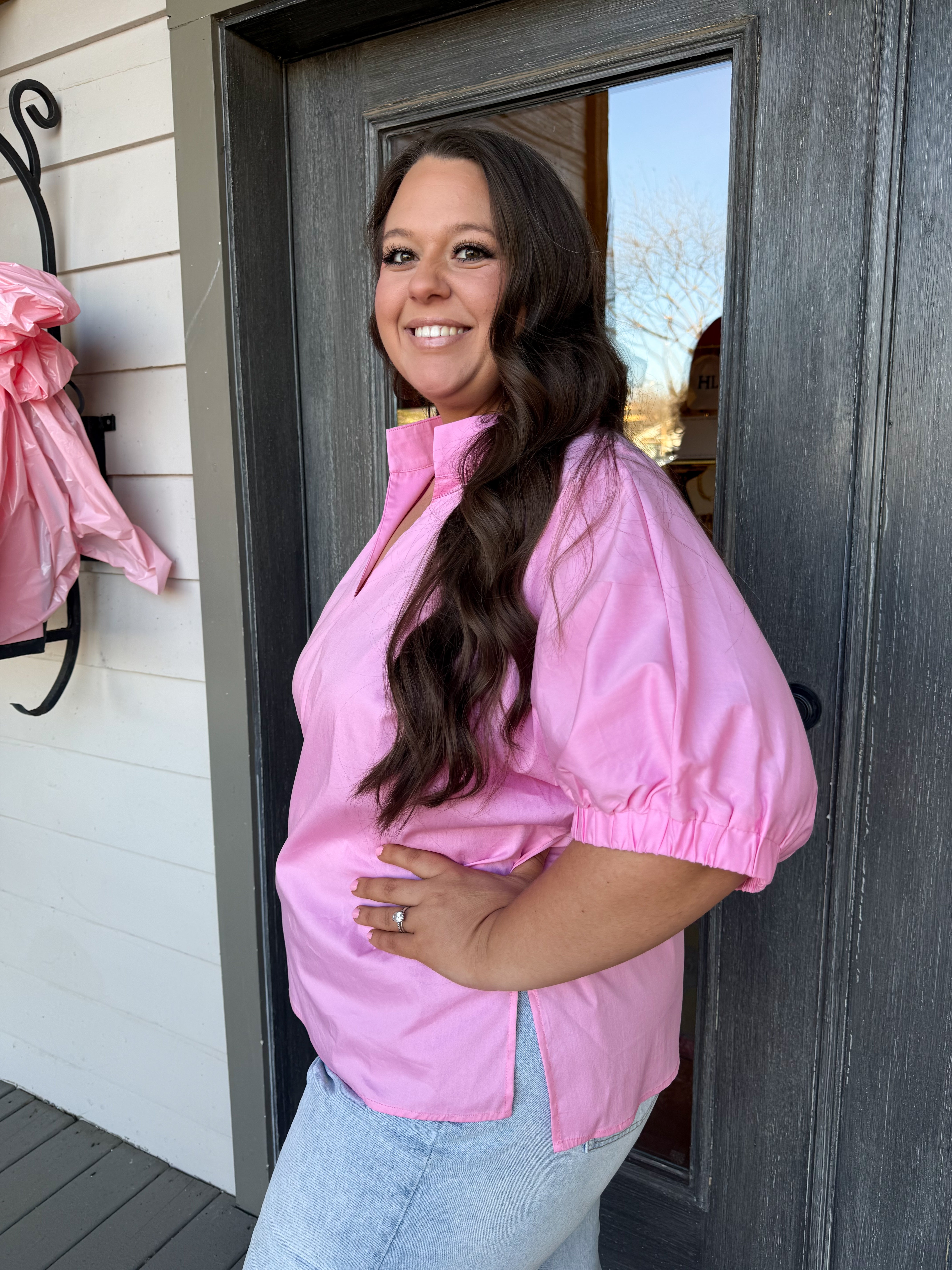 Elevate your everyday style with this pink blouse, where soft puffy sleeves and a flattering V-neck create an instantly charming, versatile piece.