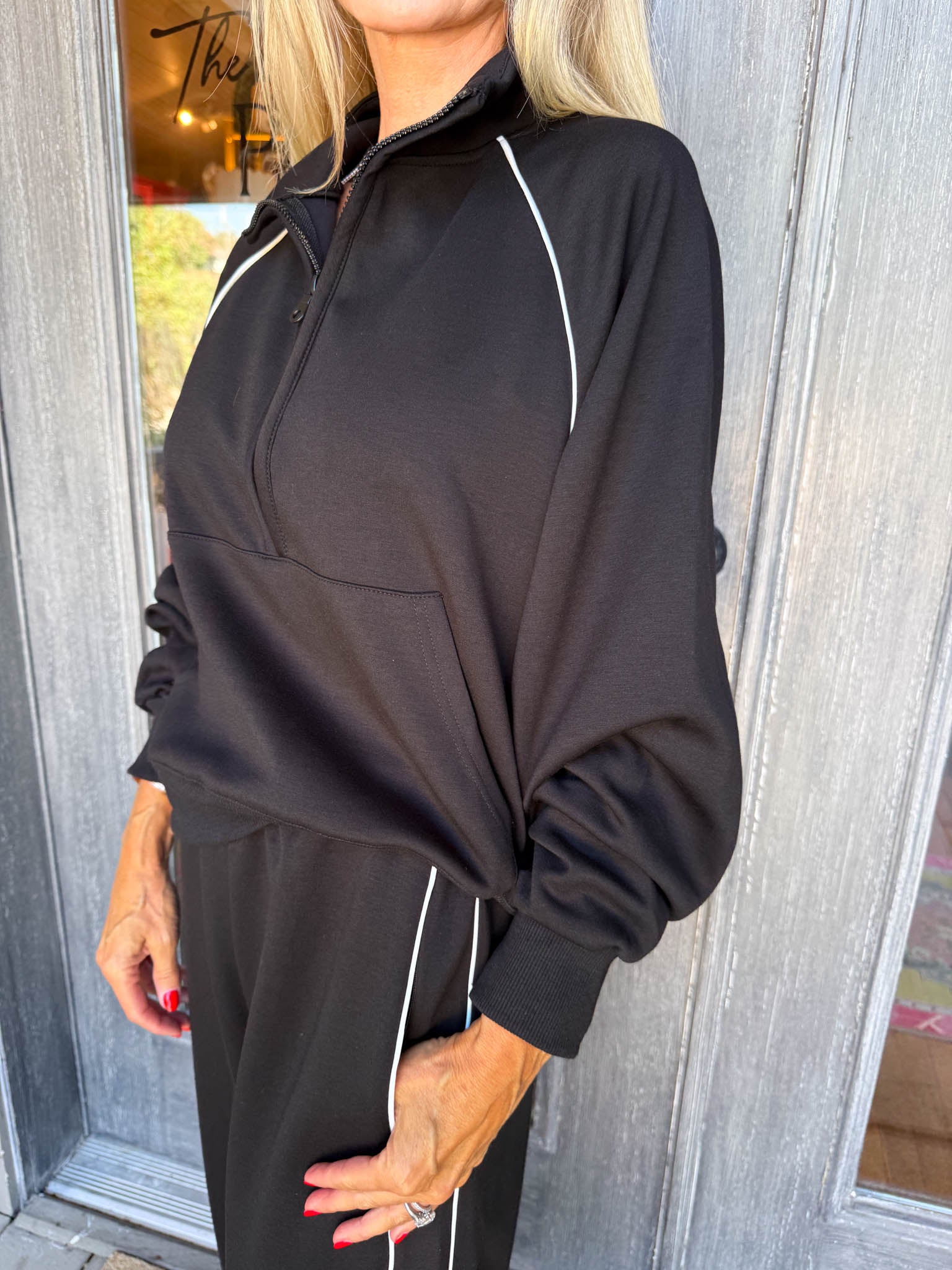 - Features a sleek black long sleeve top with a half zip and crisp white piping for a sporty vibe