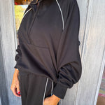 - Includes matching black lounge pants with a convenient hoodie-style front pocket for easy storage and comfort