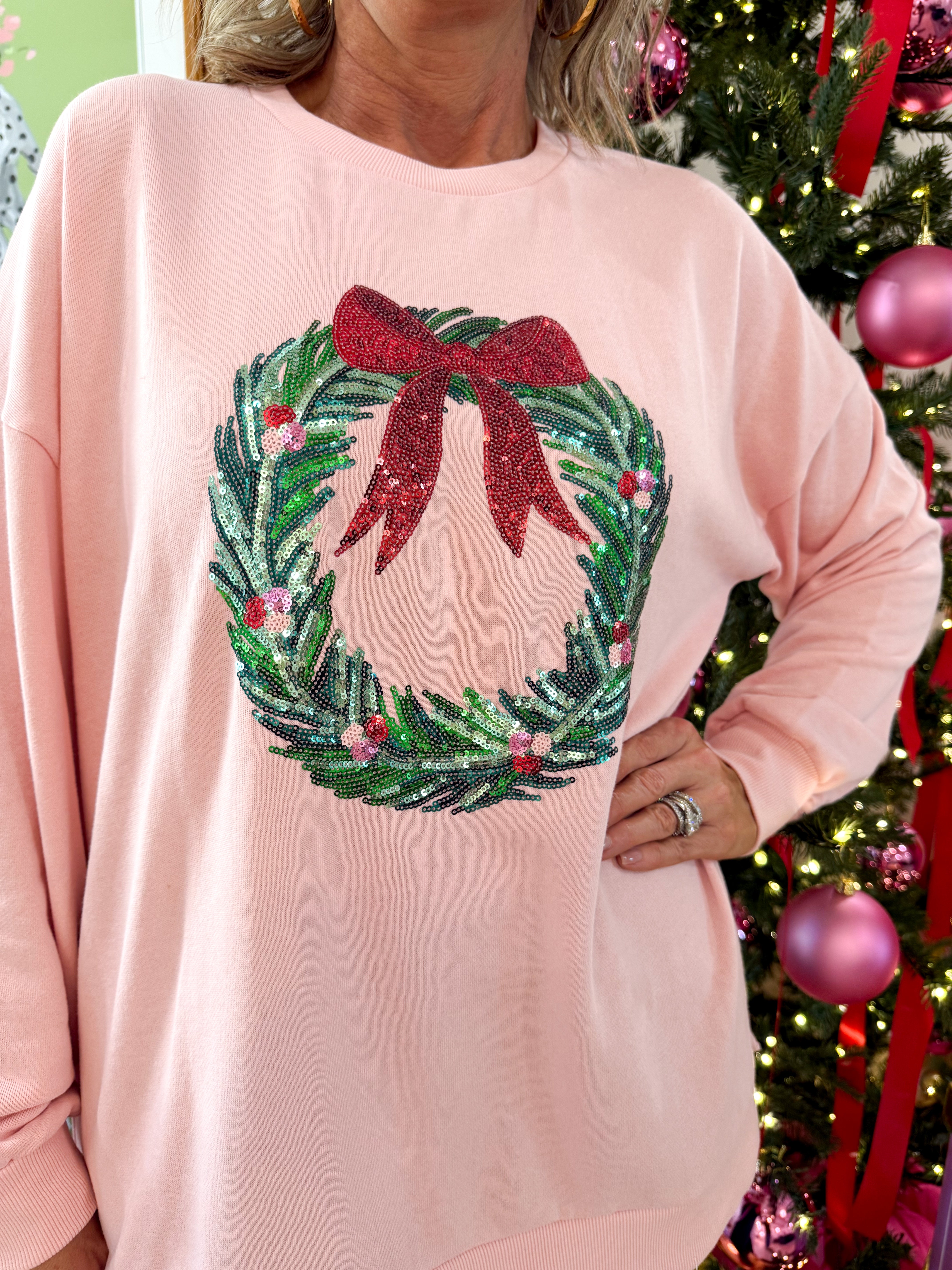 Wrap yourself in cozy charm with the Clara Wreath Sweatshirt, sparkling with sequin magic!