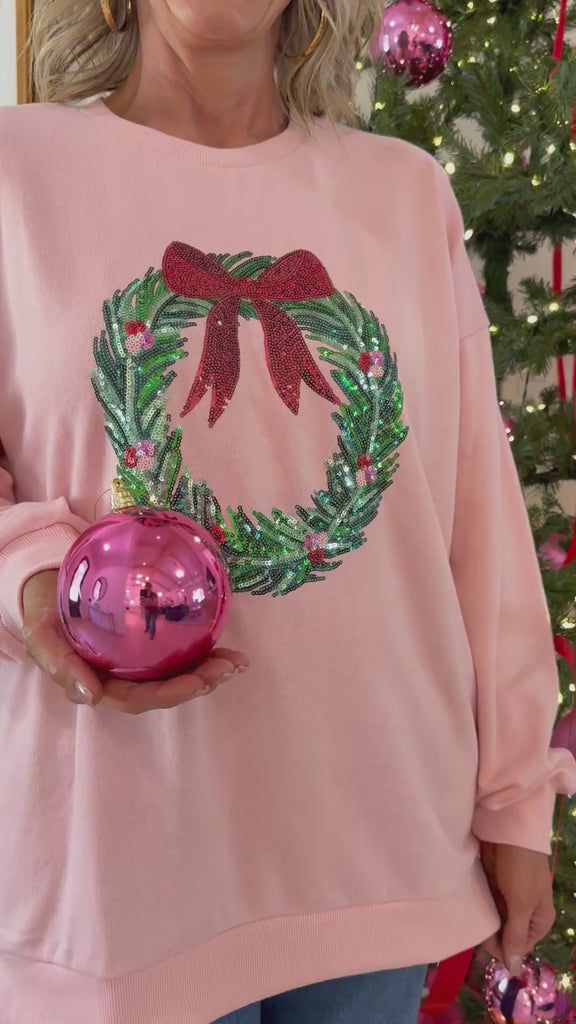 - Bright pink sweatshirt showcasing a festive sequin wreath that adds instant joy