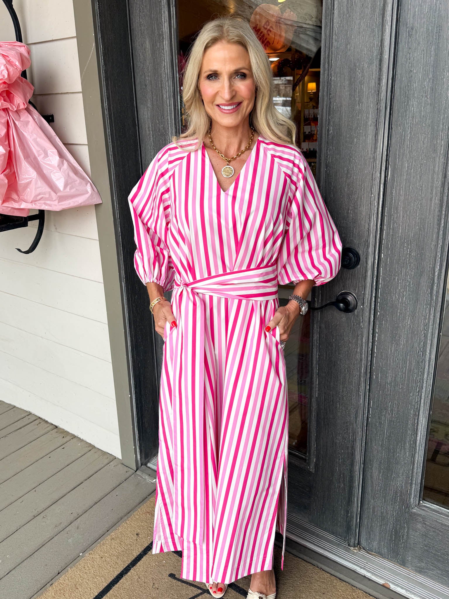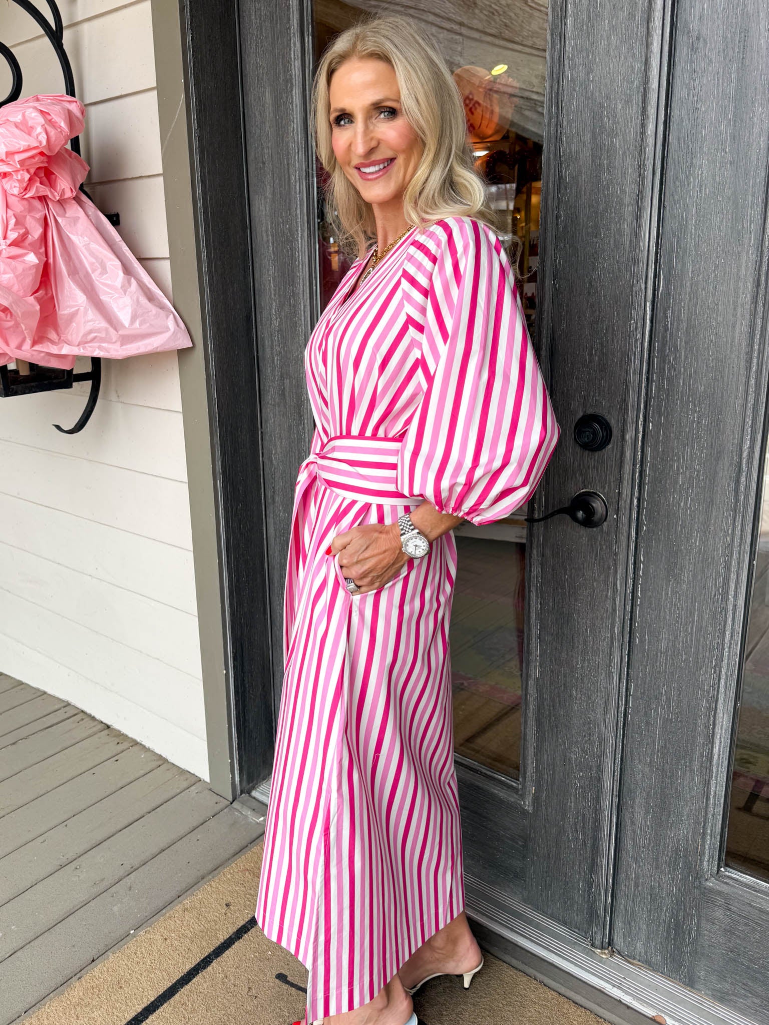 Effortlessly transition from day to evening in this charming striped midi dress, designed with a flattering waist tie and three-quarter sleeves for timeless sophistication.