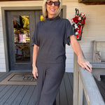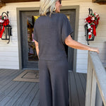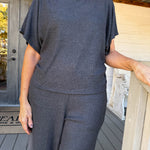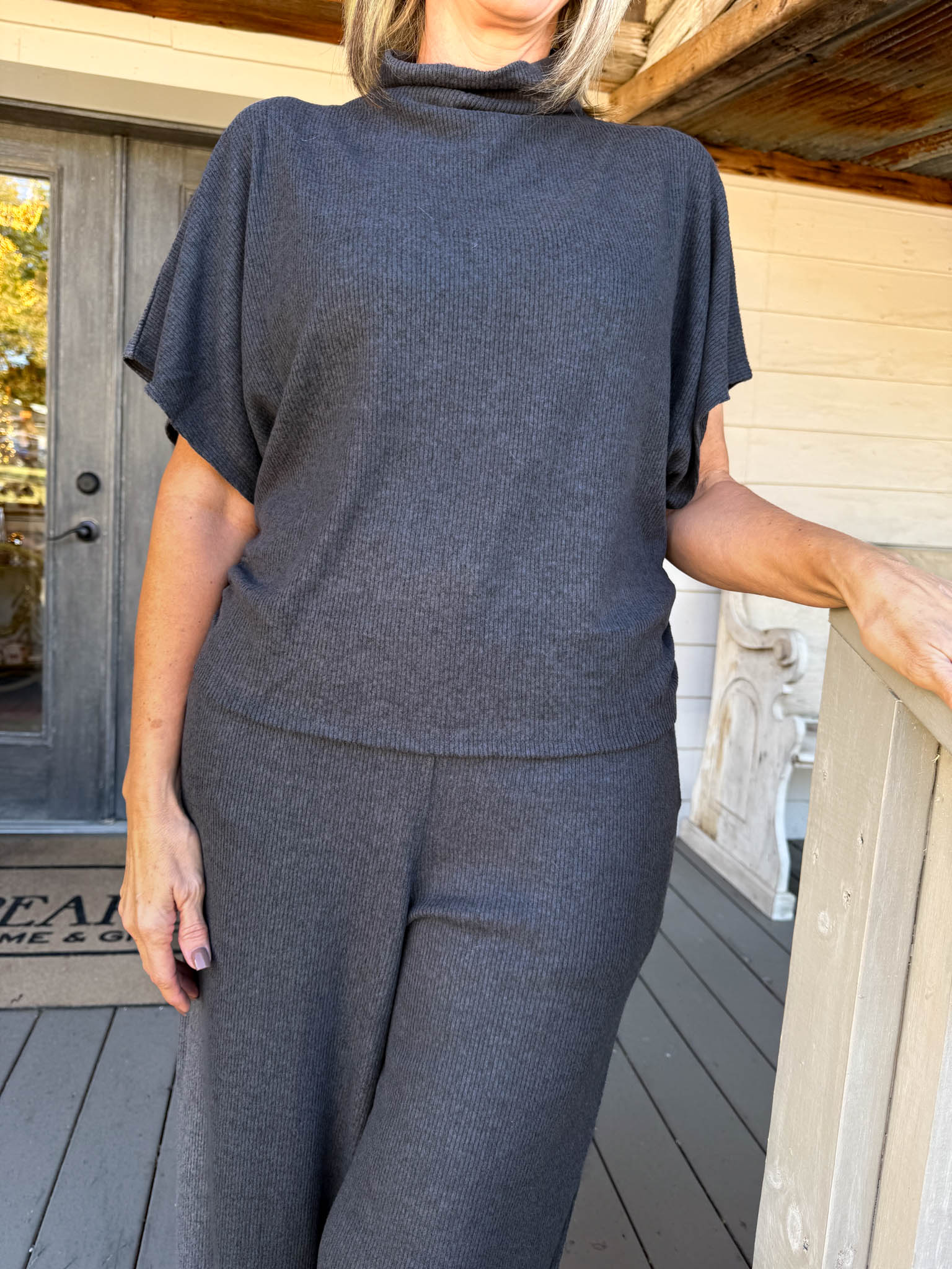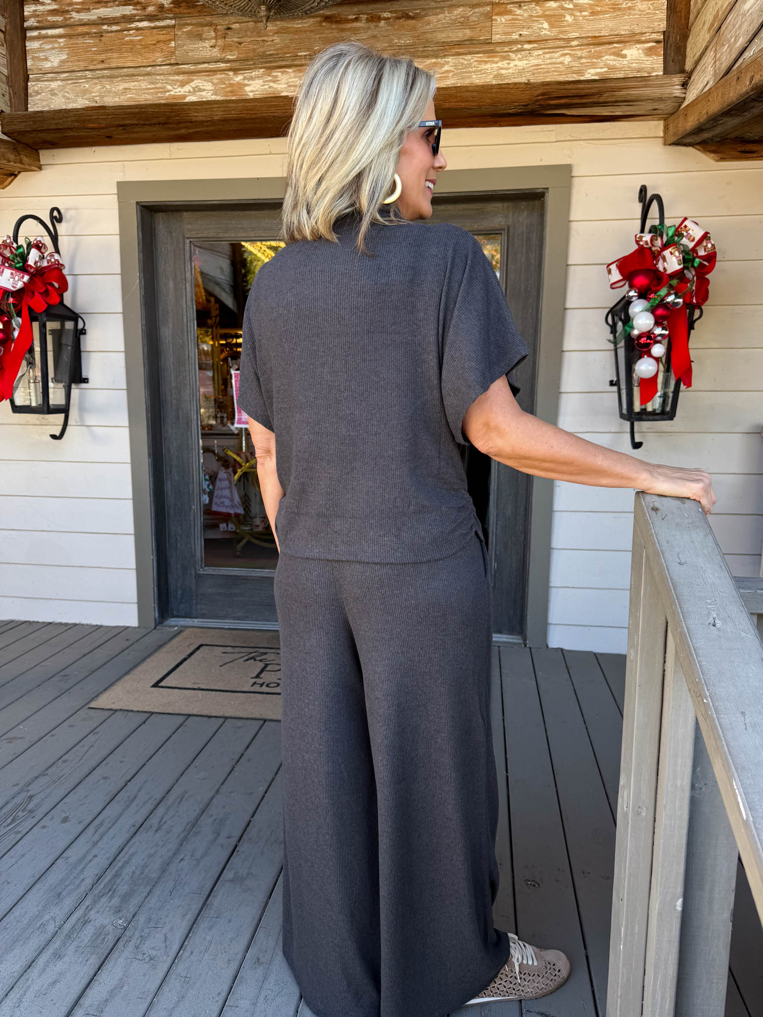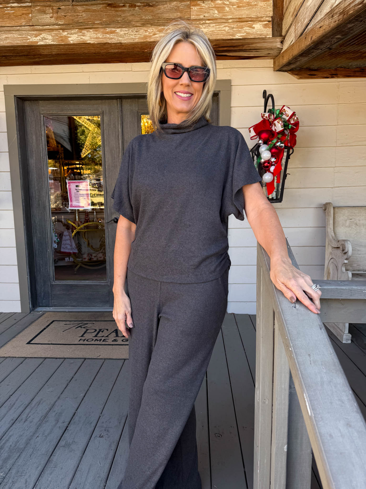 Get ready to feel amazing in this dark grey soft touch set that pairs a flattering side-ruched top with comfy elastic waist trousers for the ultimate comfort-meets-style combo.