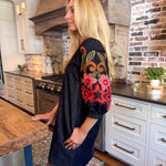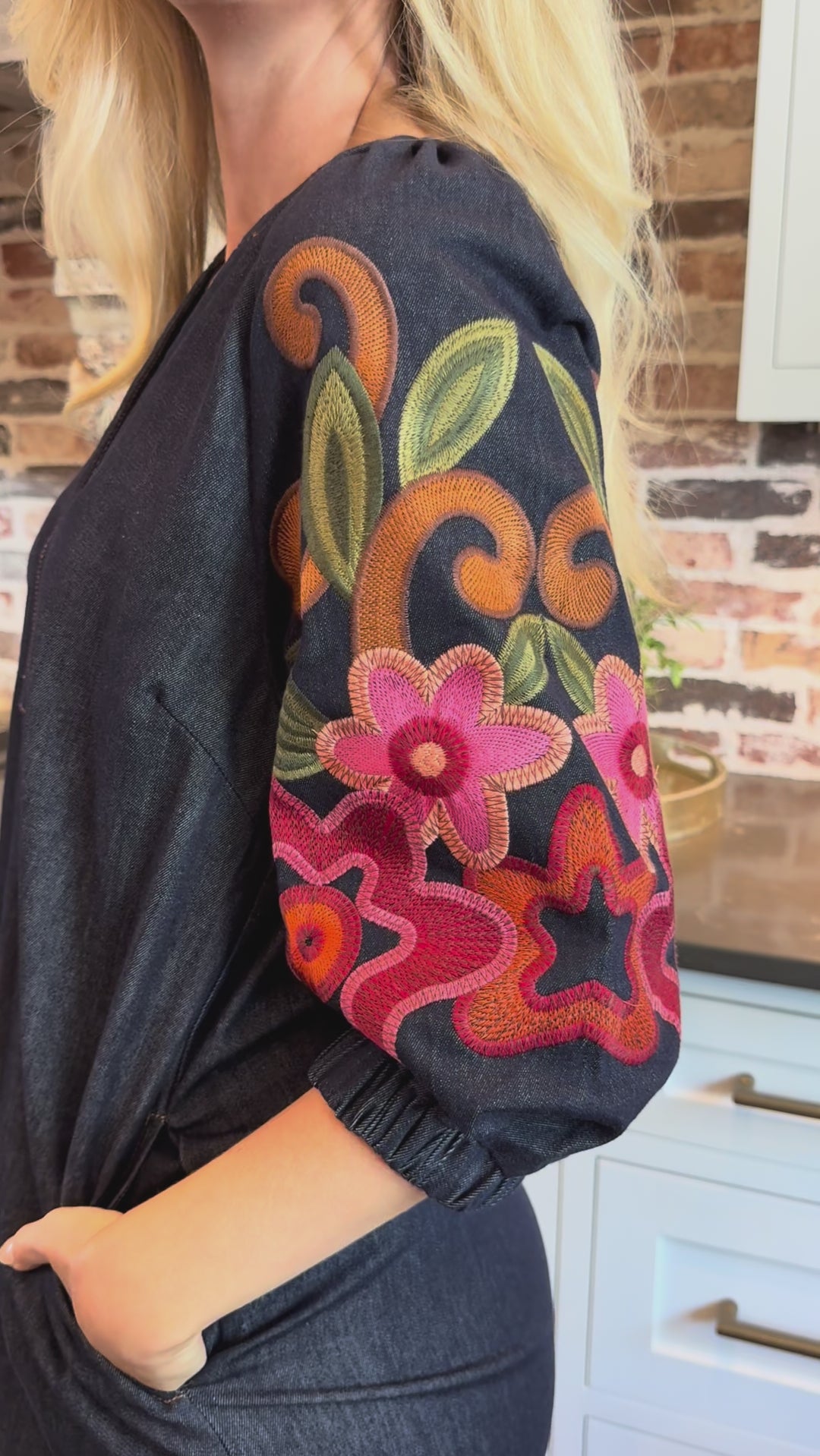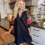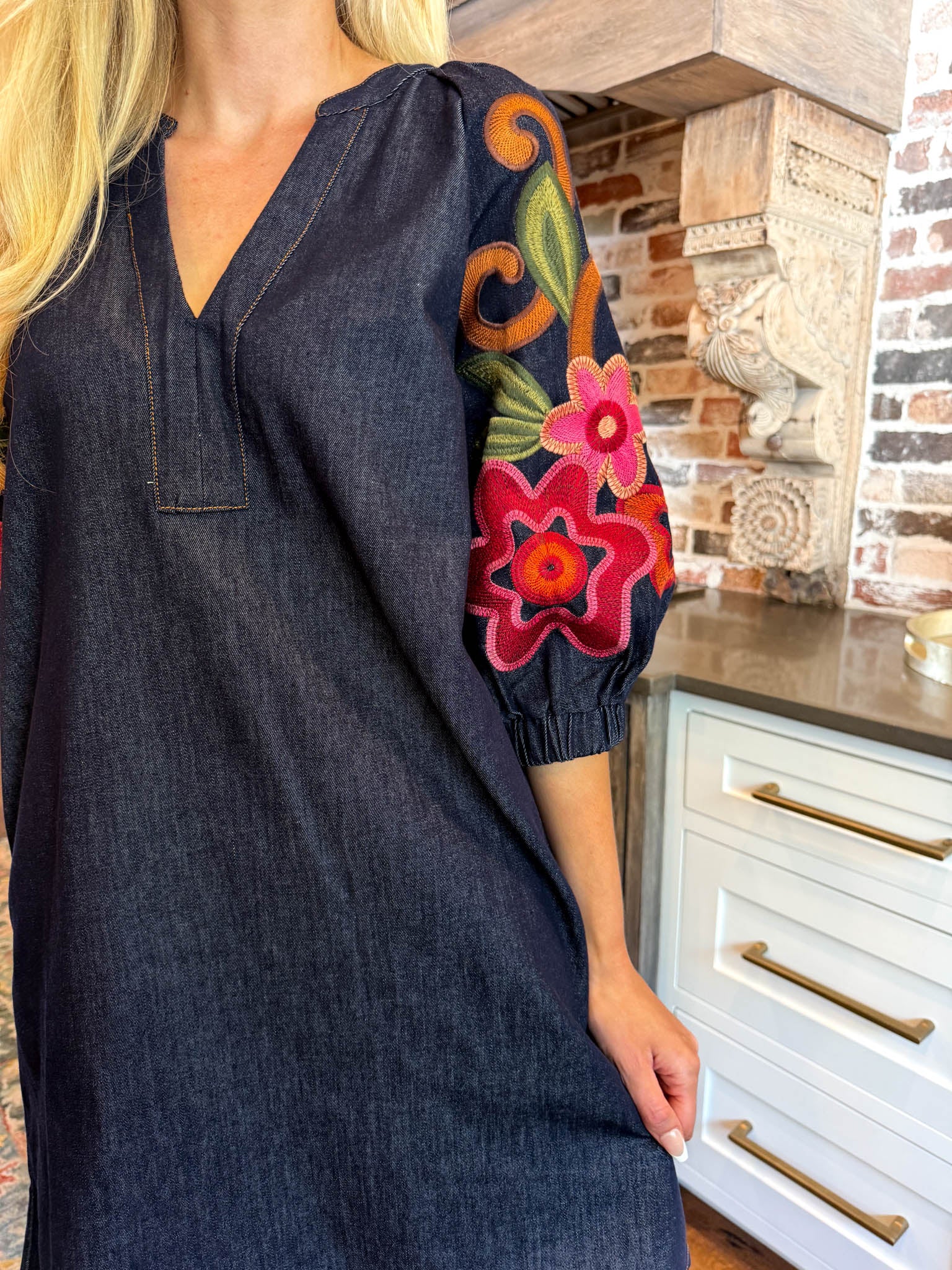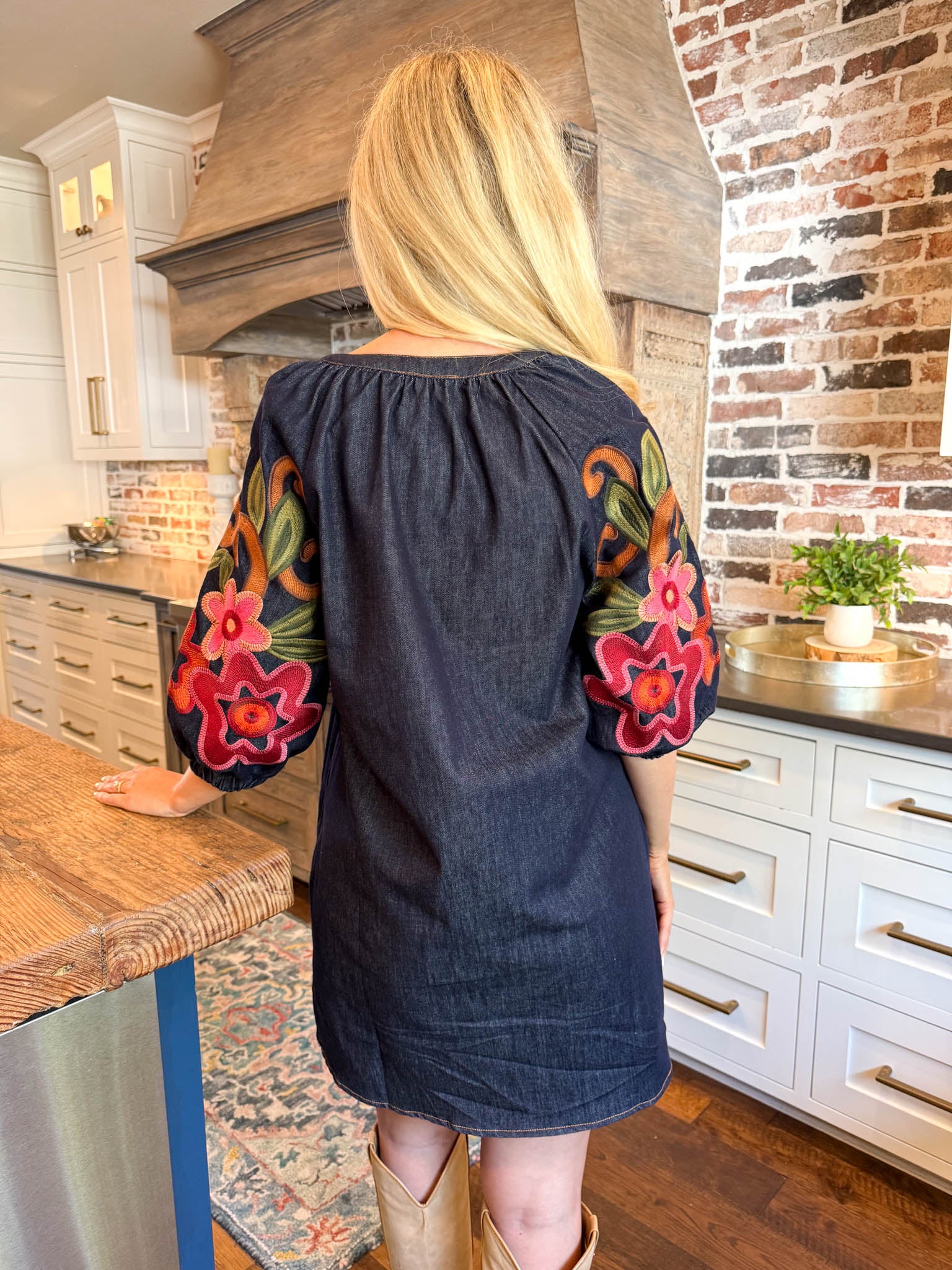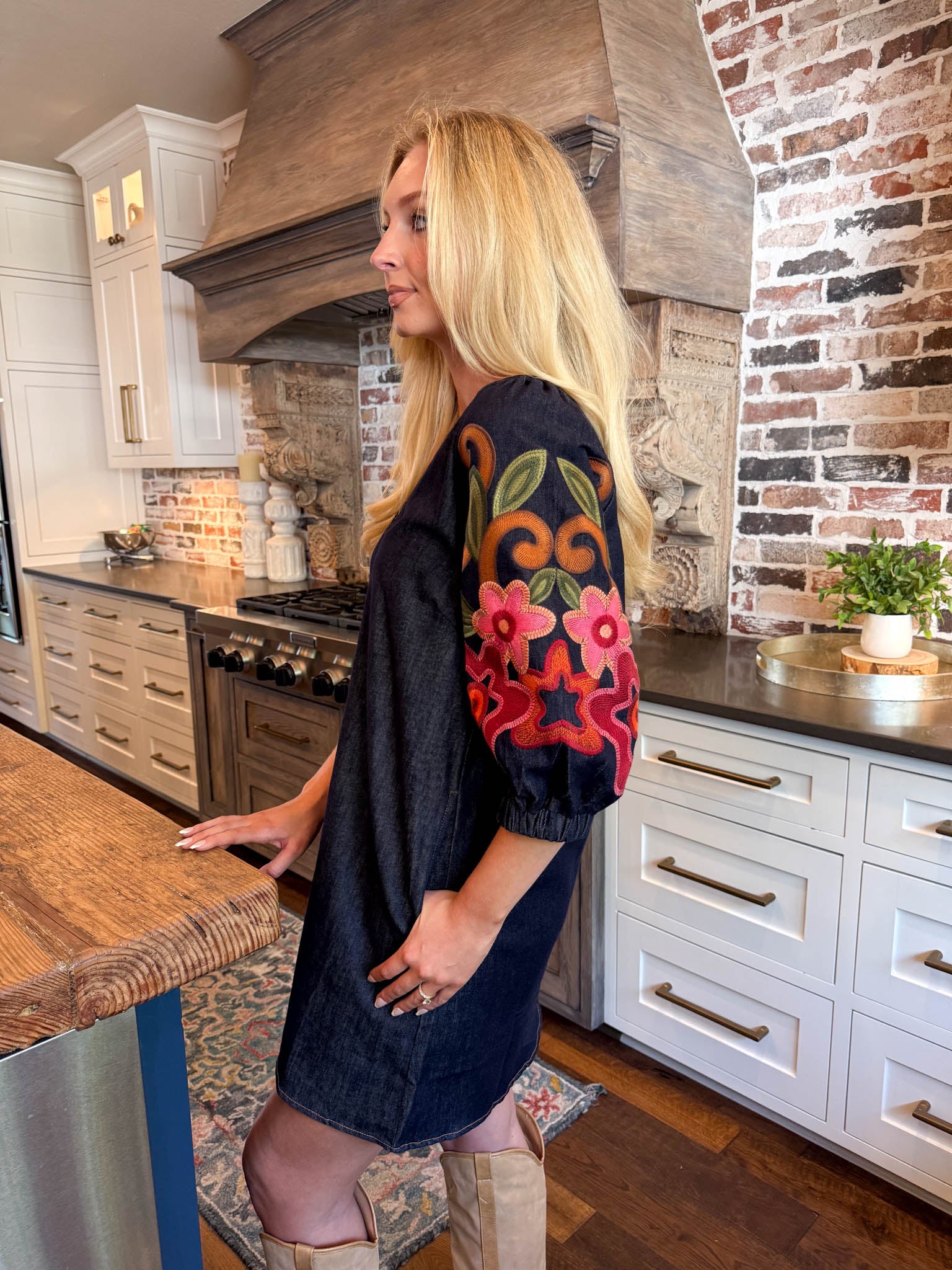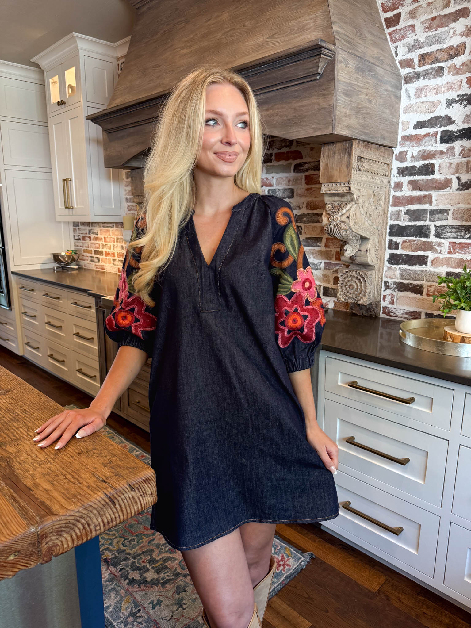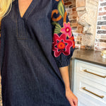 Step into fun with the Delaney Mini Dress, where classic denim meets vibrant floral embroidery for a playful pop of color!