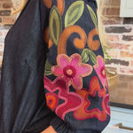 - Eye-catching pink, green, and orange blossoms brighten up the long sleeves, adding a fresh twist to your casual look