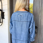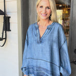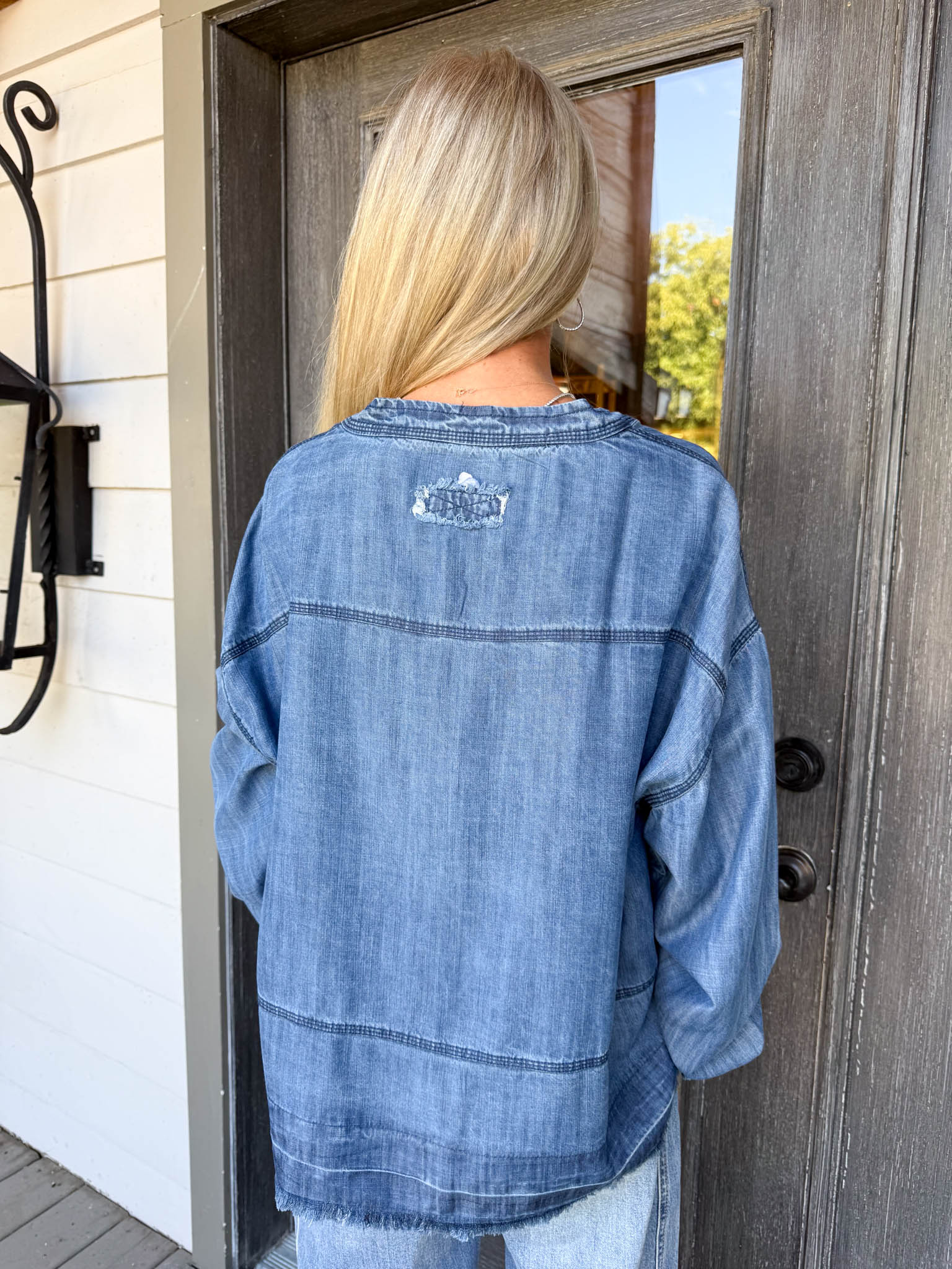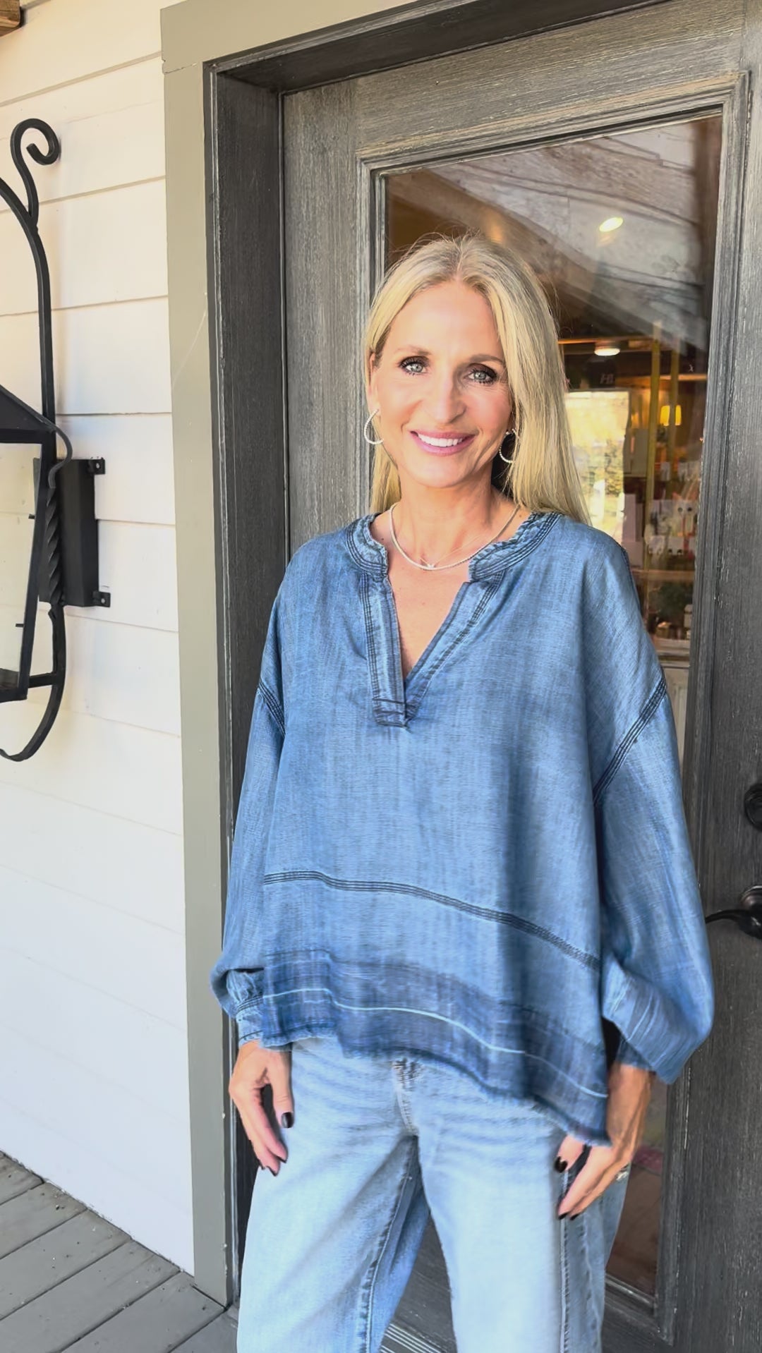 Step into laid-back cool with the Denim Henley Blouse—where classic charm meets all-day comfort.