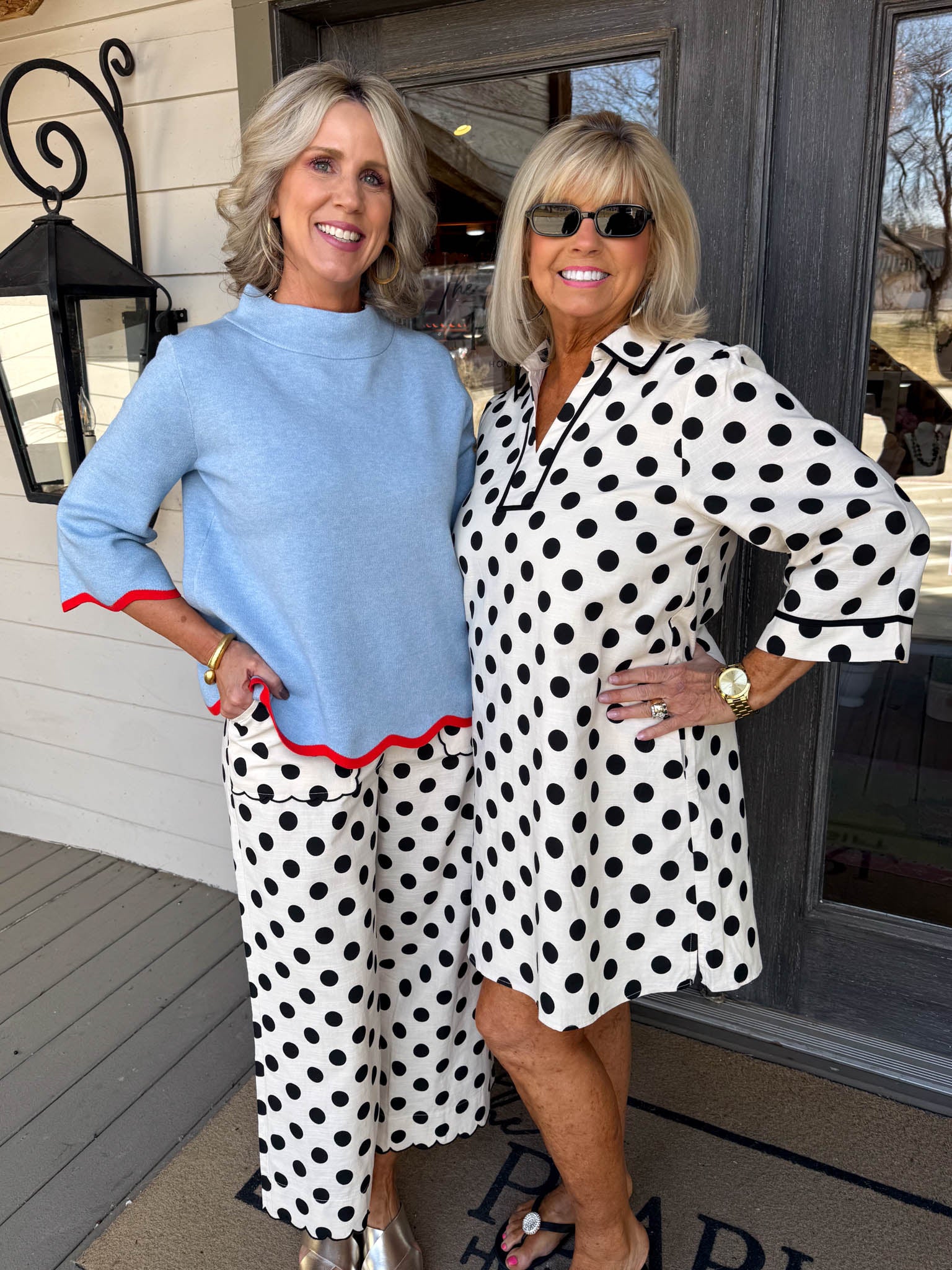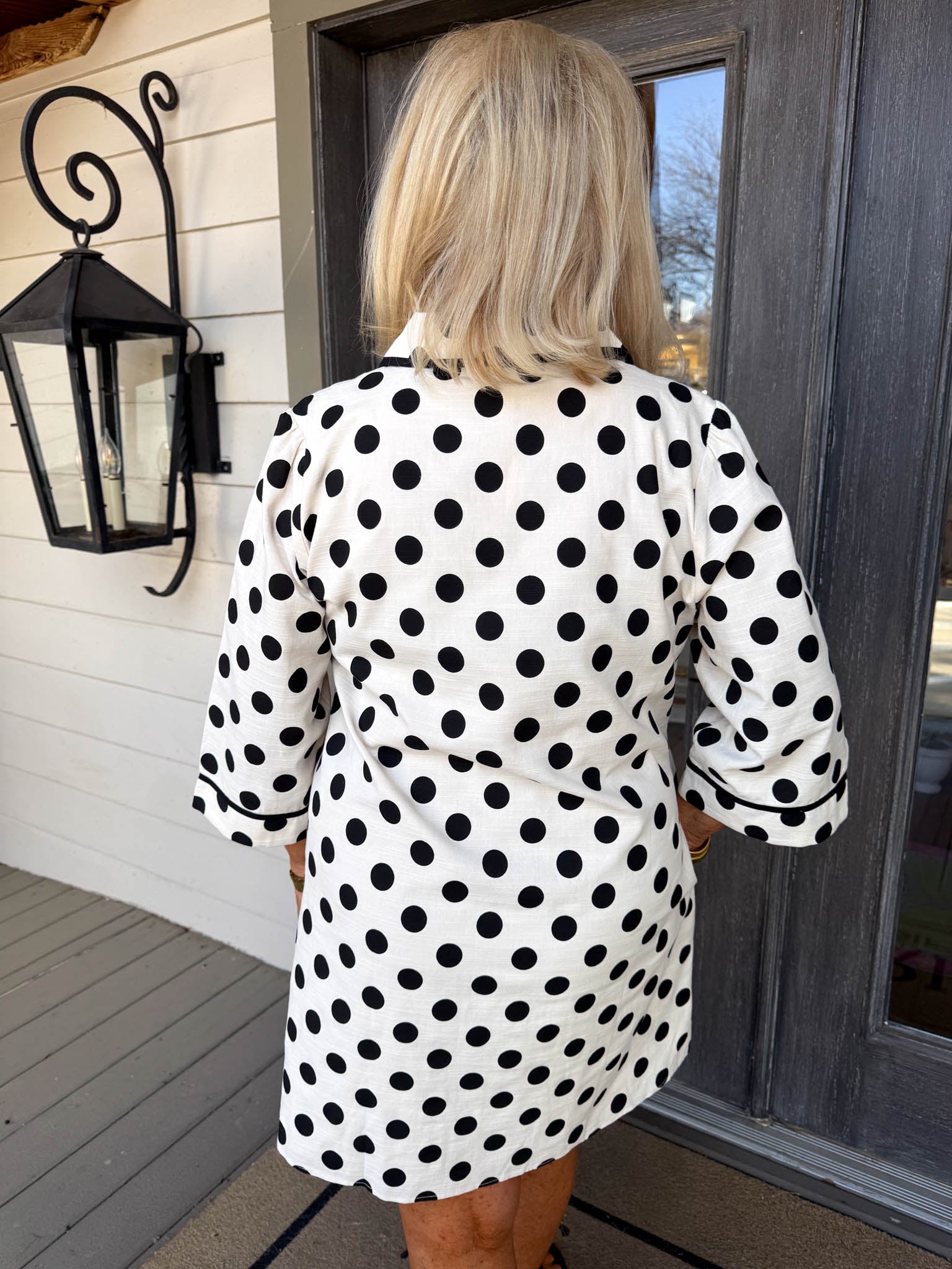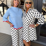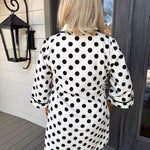 • Classic black polka dots dance across the fabric for a timeless pattern that feels both playful and sophisticated