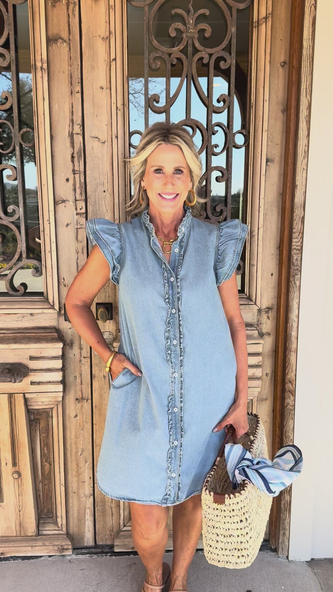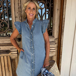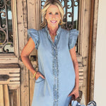 Elevate your everyday style with this versatile denim mini dress, featuring charming ruffle sleeves and classic button-up detailing for effortless sophistication.