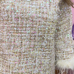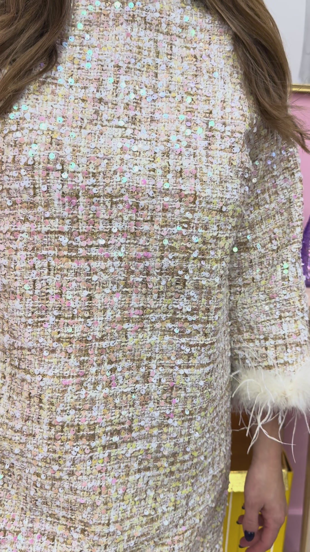 • Feather-trimmed sleeves add a touch of whimsy and texture, transforming a classic shift silhouette into something unforgettable