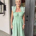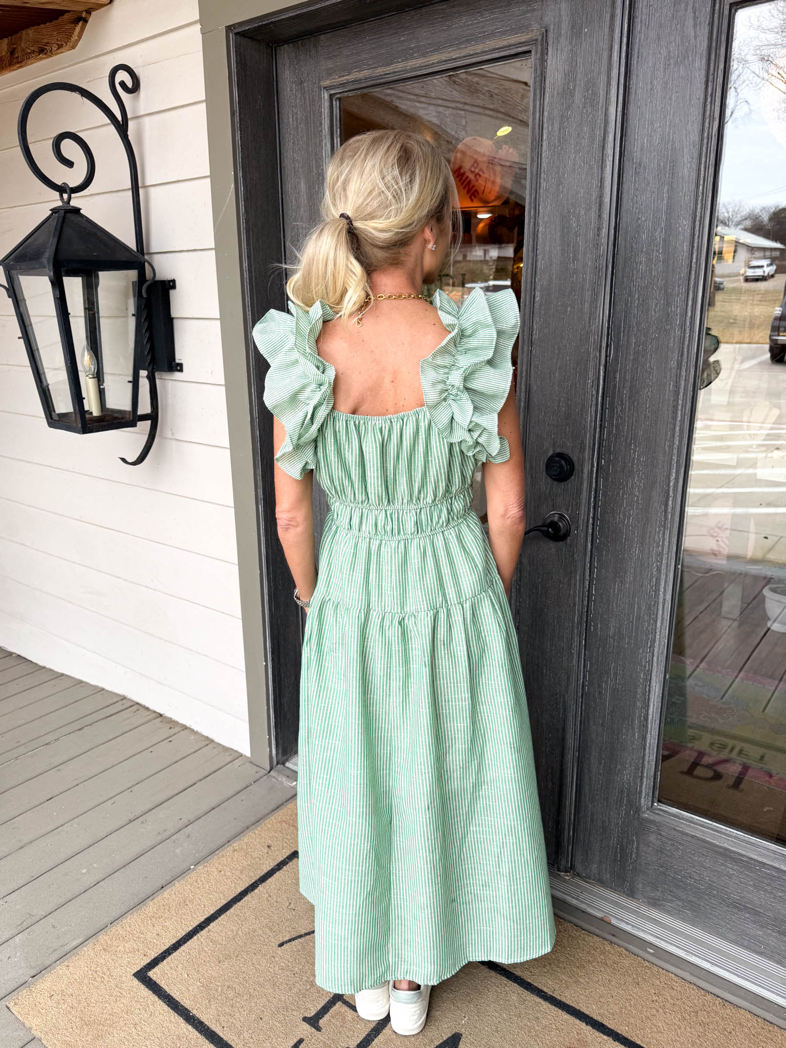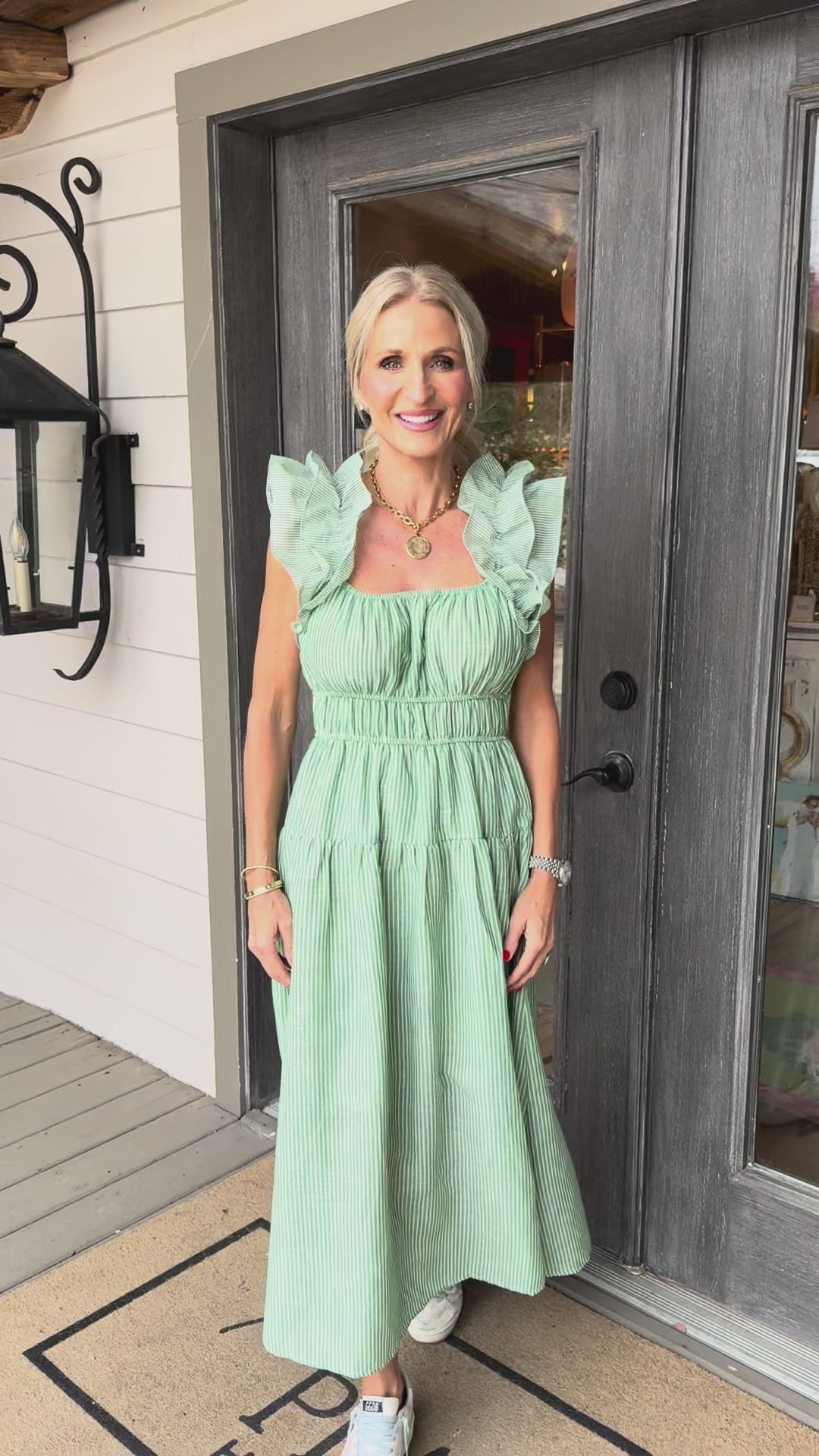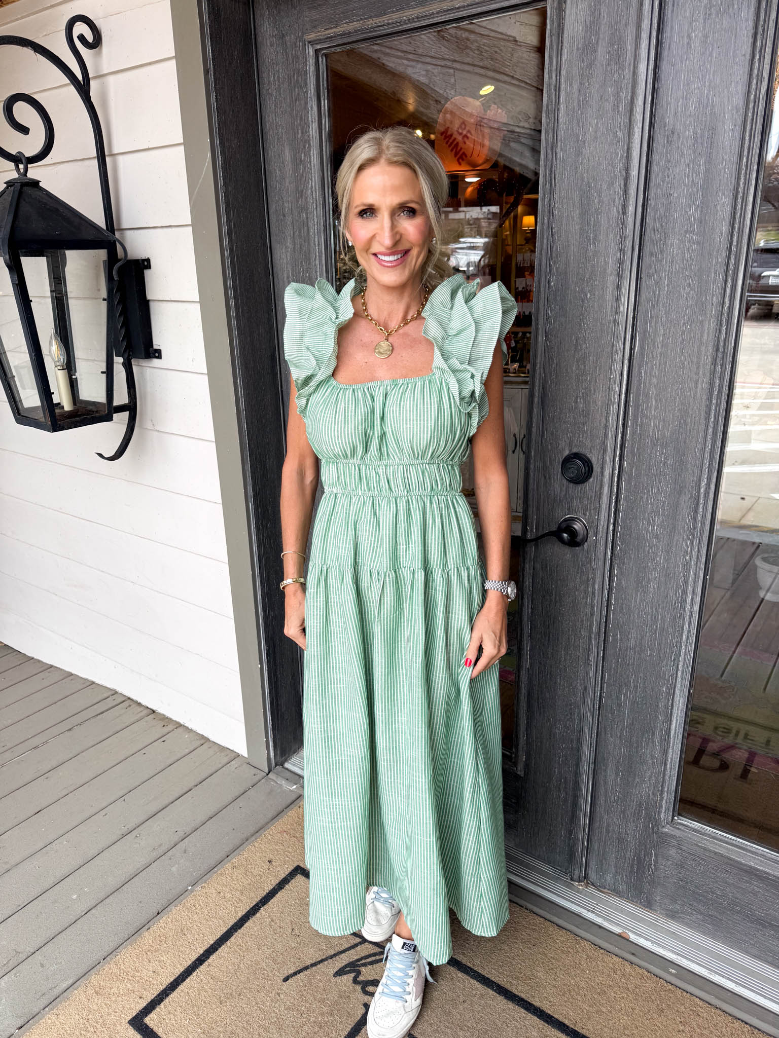 • Crisp green and white stripes paired with romantic tiered layers create a look that's both fresh and flattering