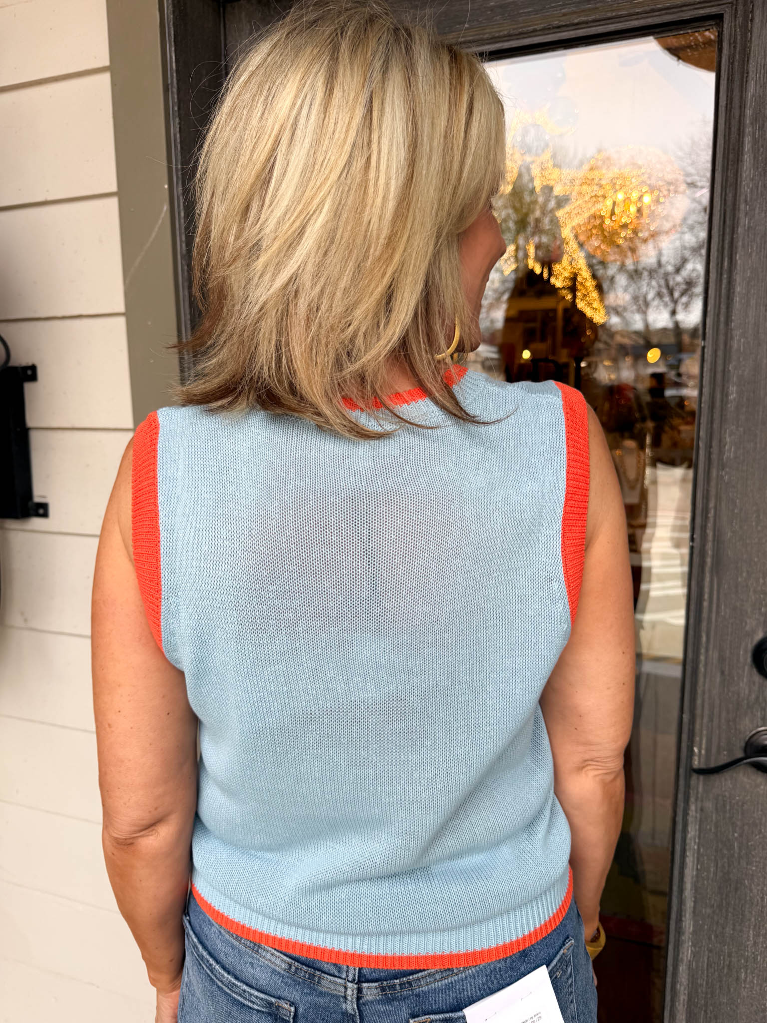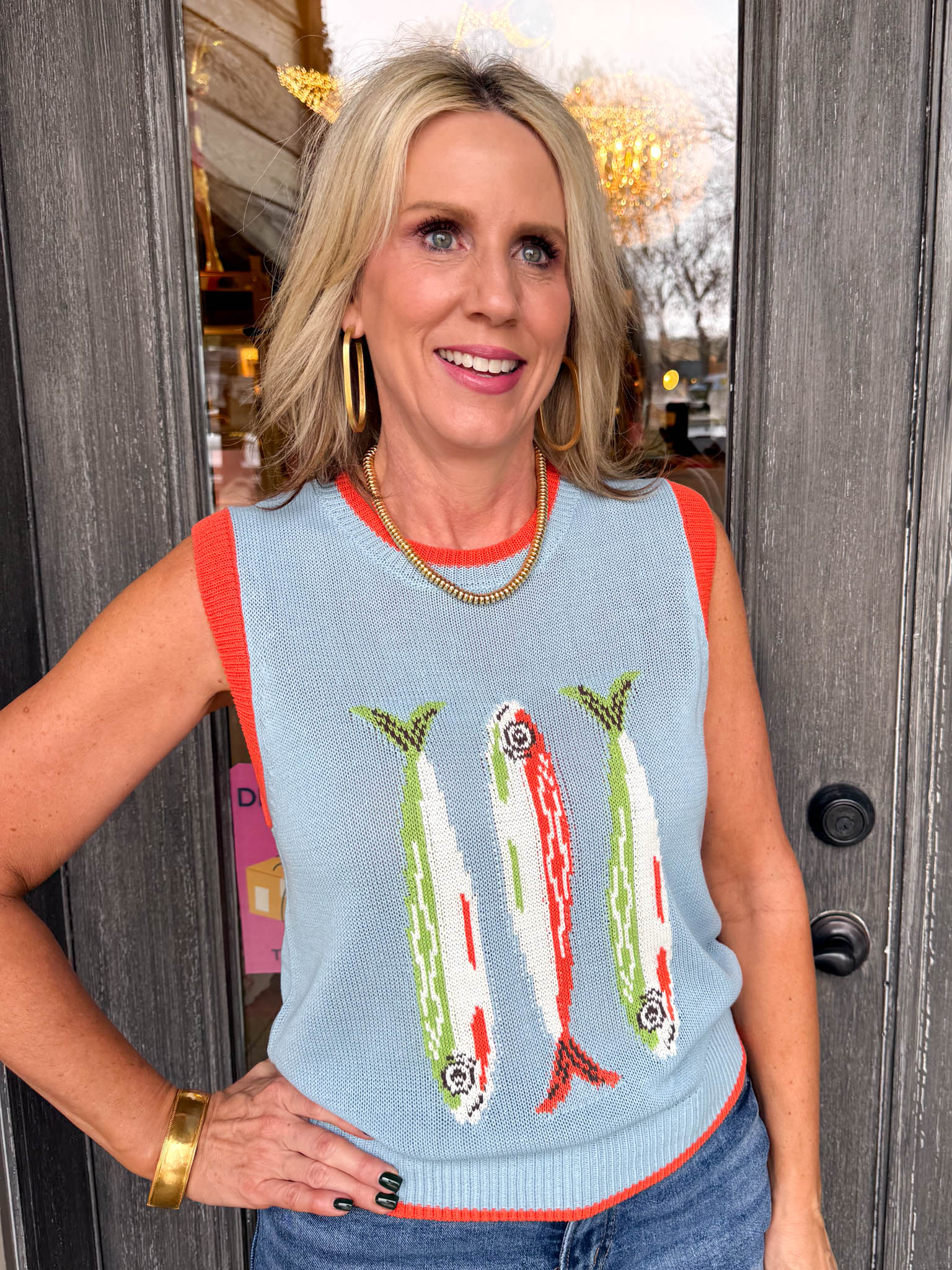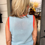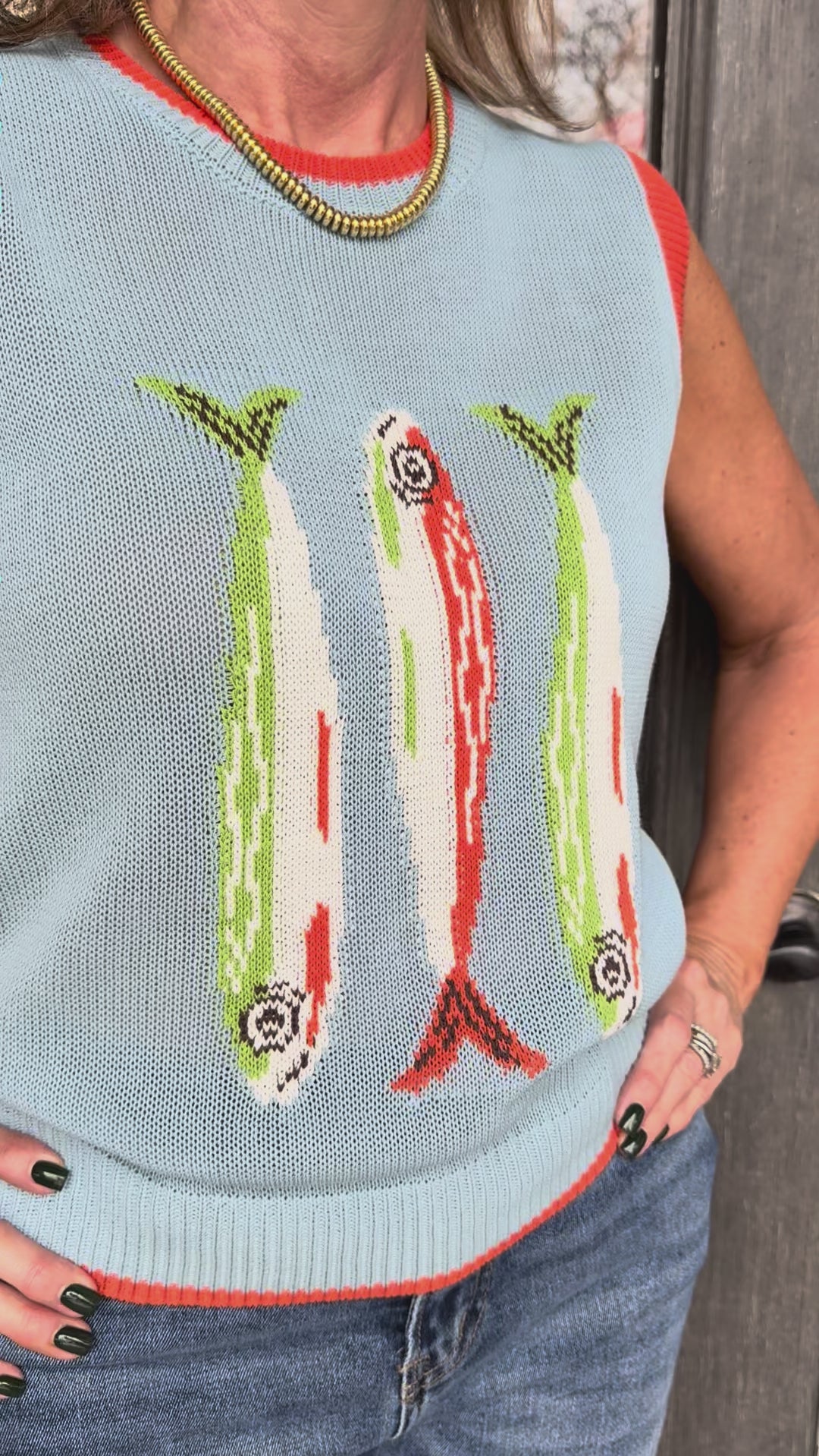 Make a splash with this charming light blue sweater vest featuring a whimsical fish graphic that brings coastal vibes to any outfit.