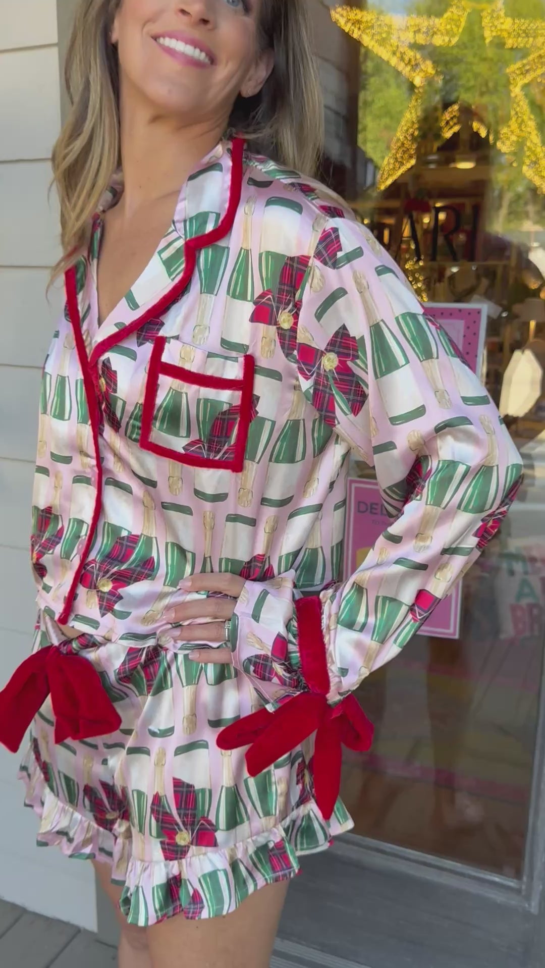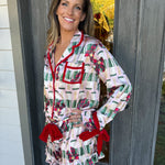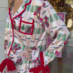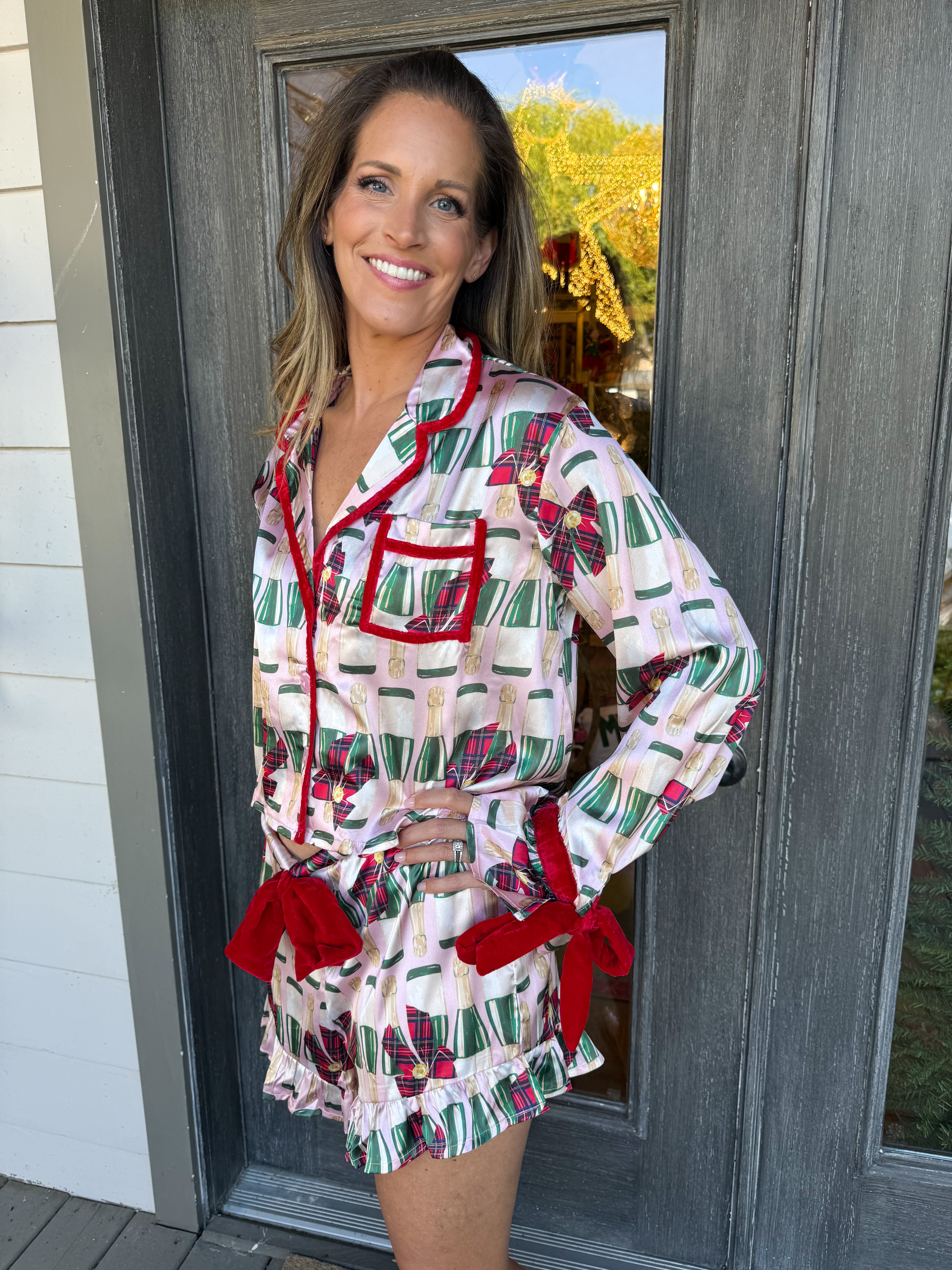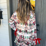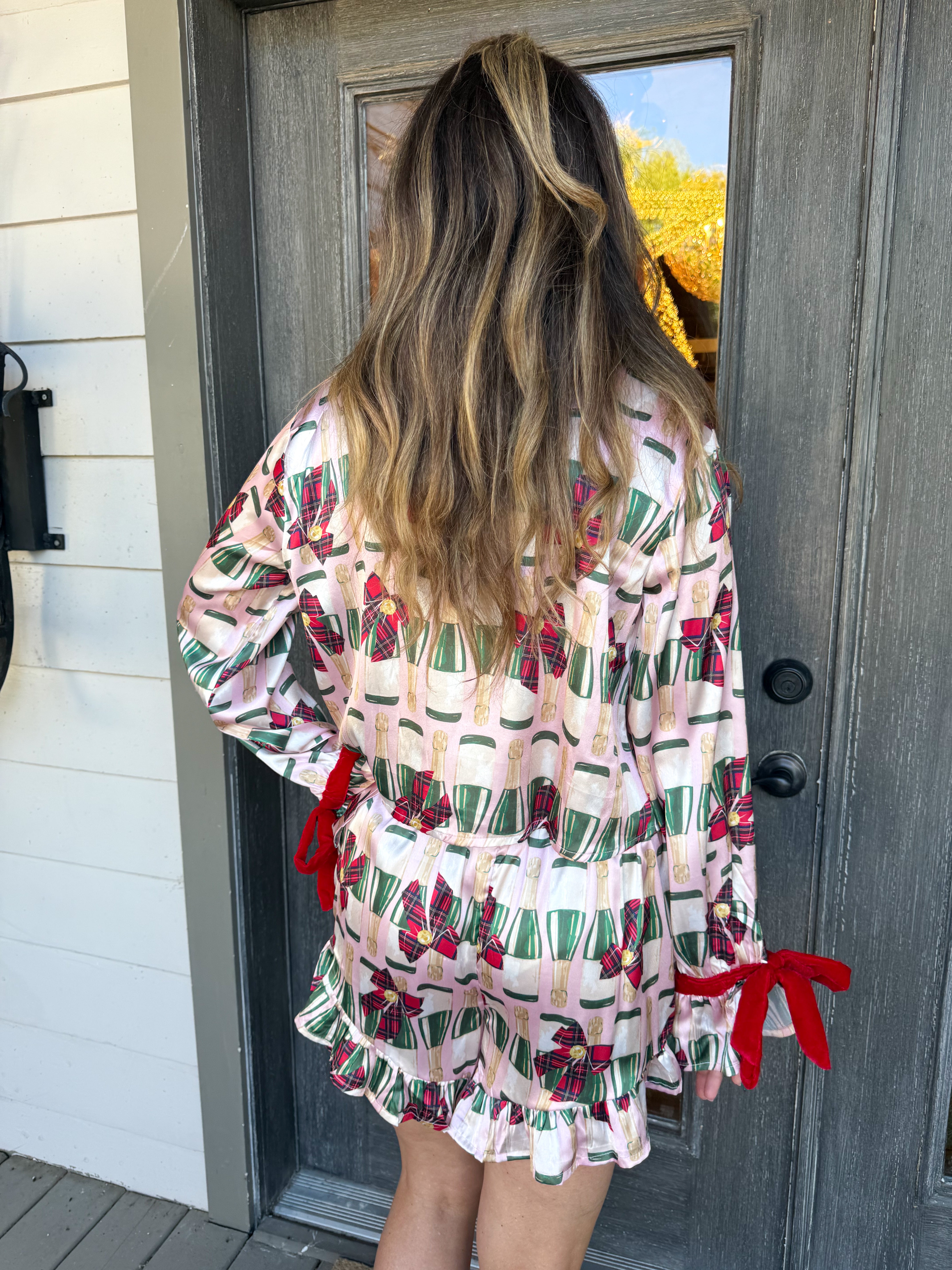 Slip into festive charm with the Fizz The Season Satin Ruffle Short Set, where playful pink satin meets delicate champagne prints and red bow accents for a cozy yet stylish sleepwear moment.