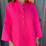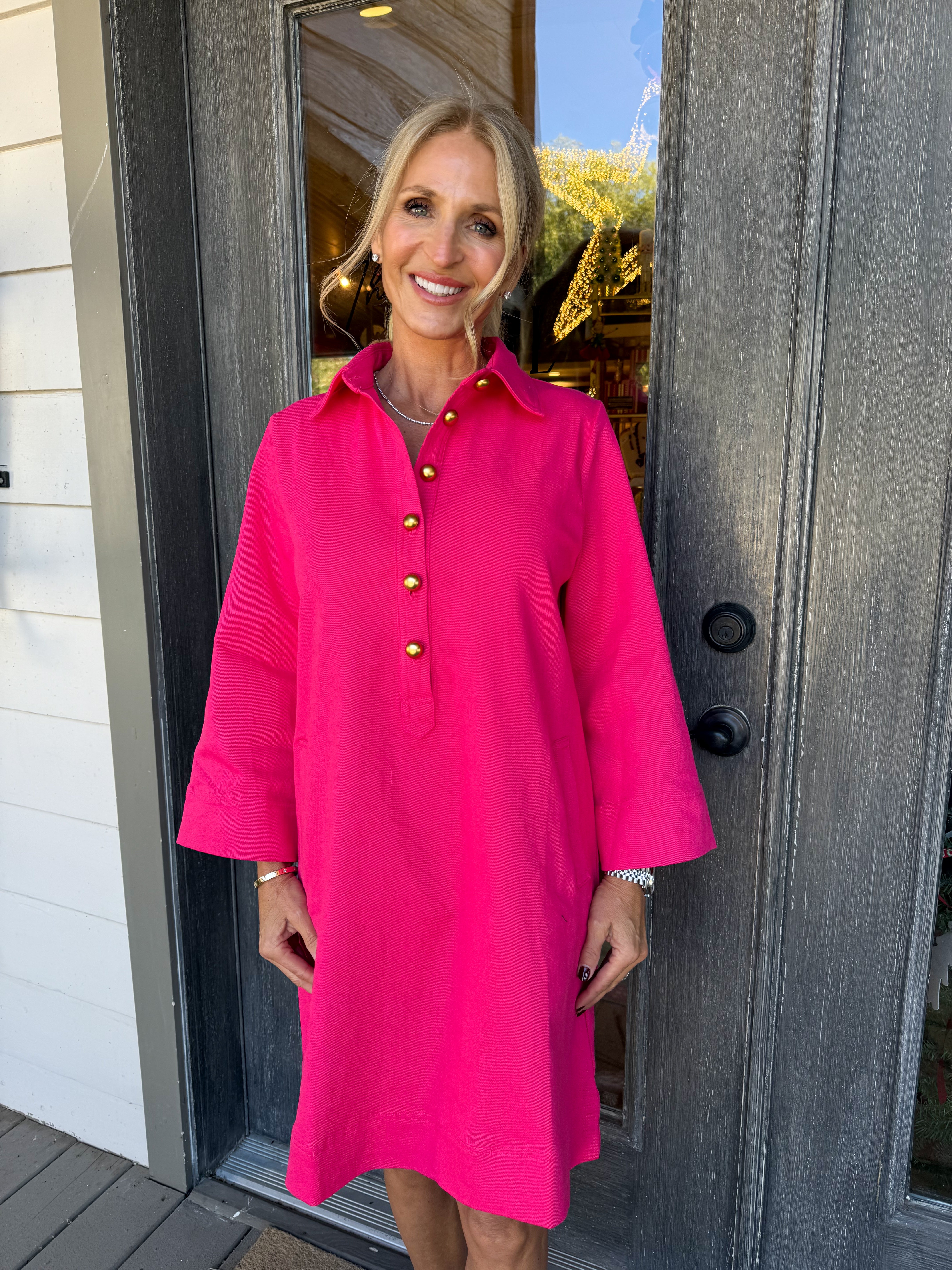 Slip into this stunning fuchsia mini dress and turn heads with its chic V-neckline, three-quarter sleeves, and gleaming gold button details.