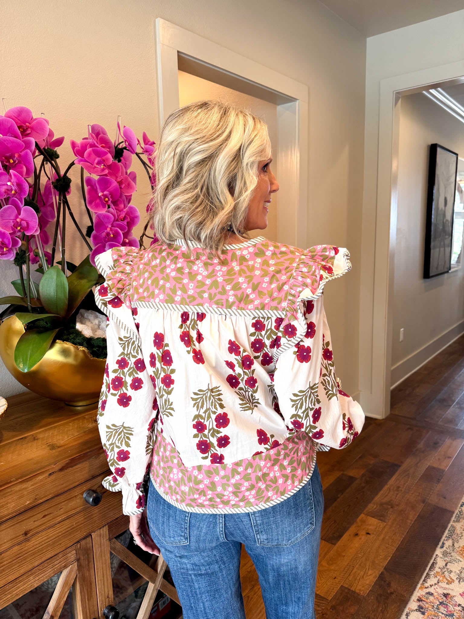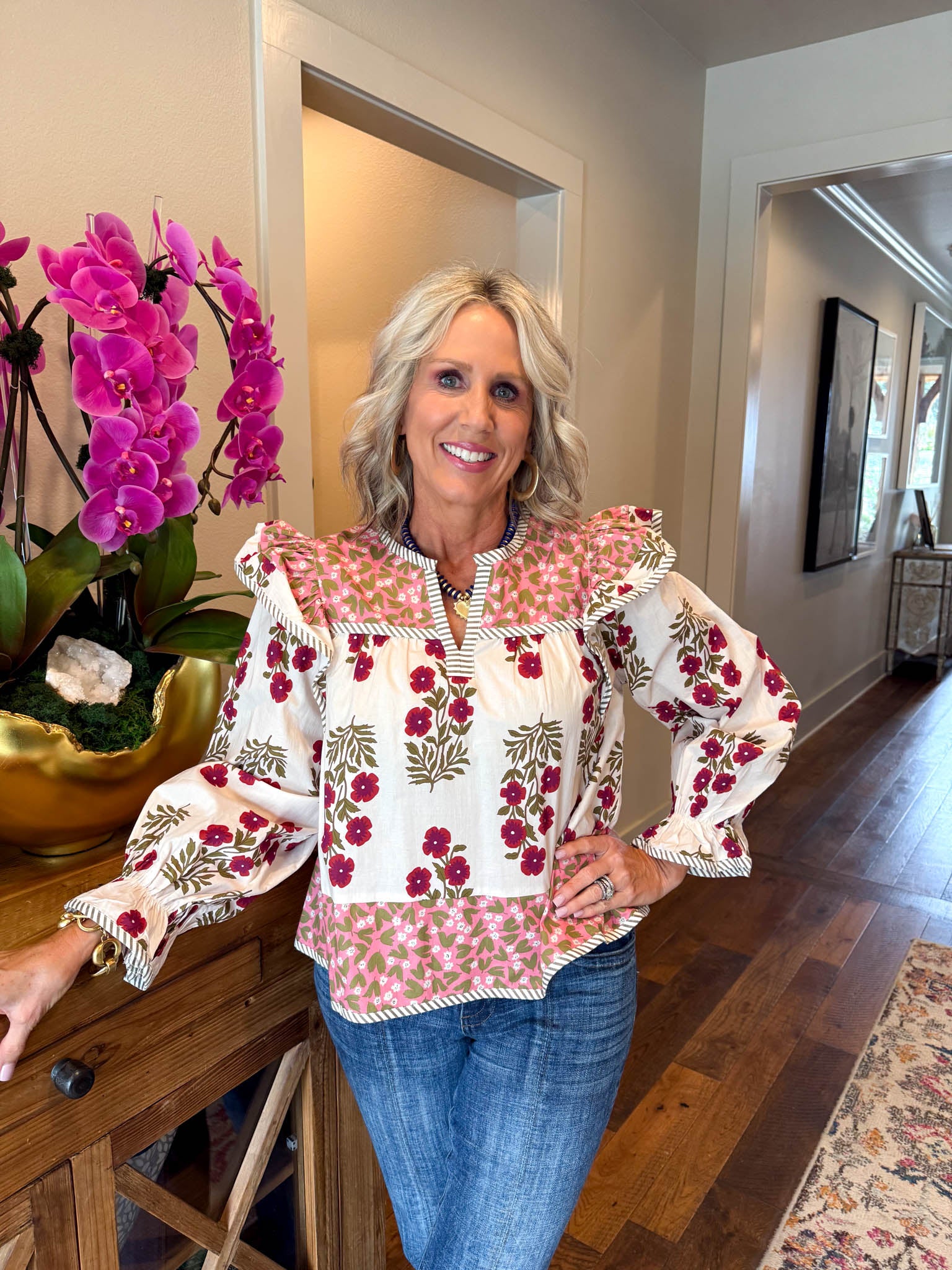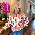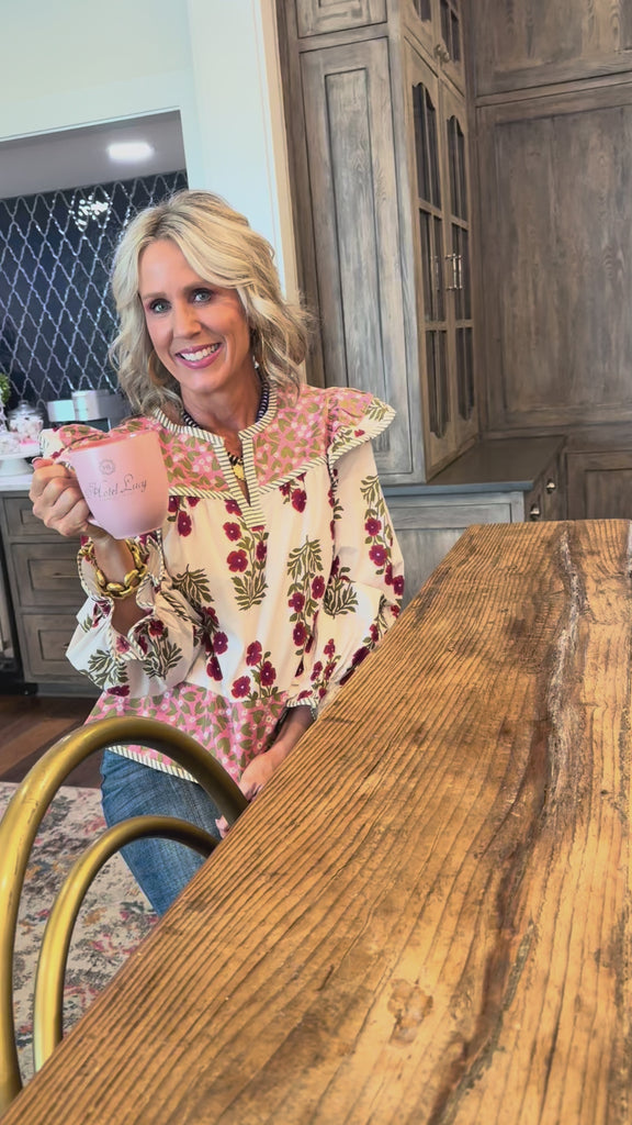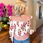 Elevate your look with the Gia Blouse, where playful pink florals meet cozy long sleeves for a vibrant touch of charm.