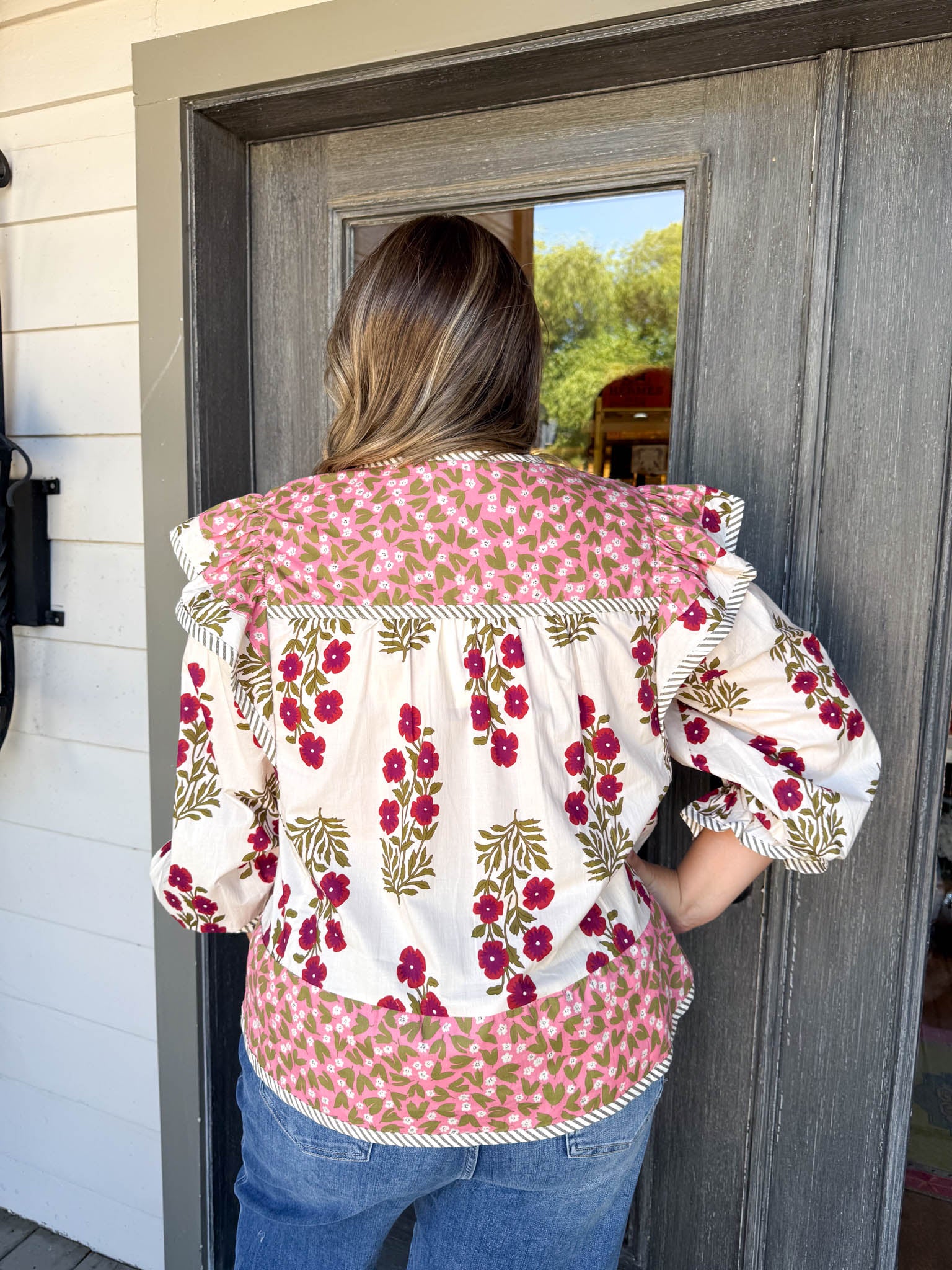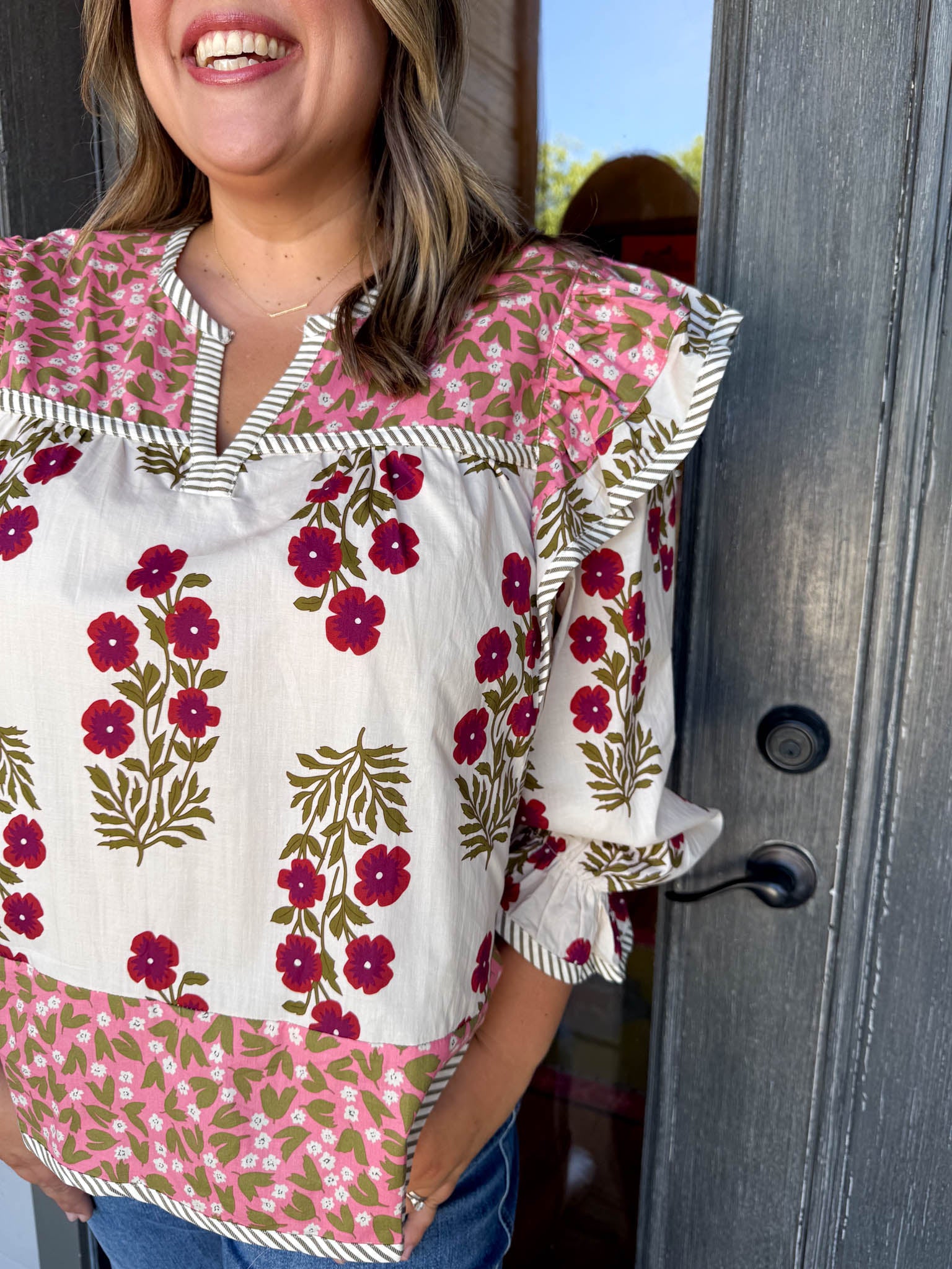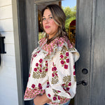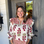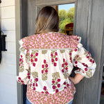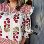 Elevate your look with the Gia Blouse, where playful pink florals meet cozy long sleeves for a vibrant touch of charm.