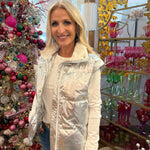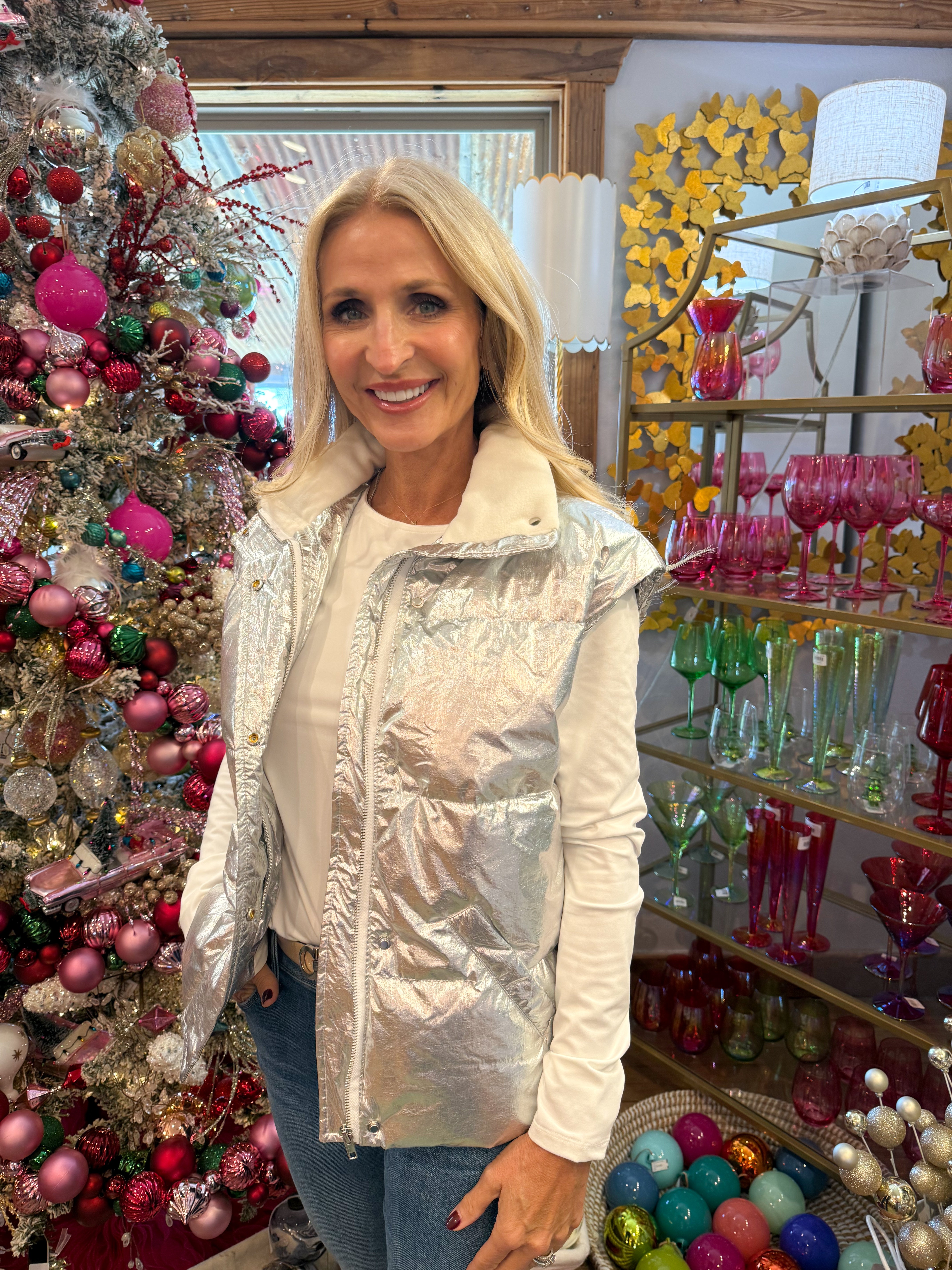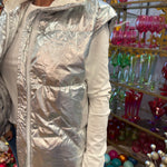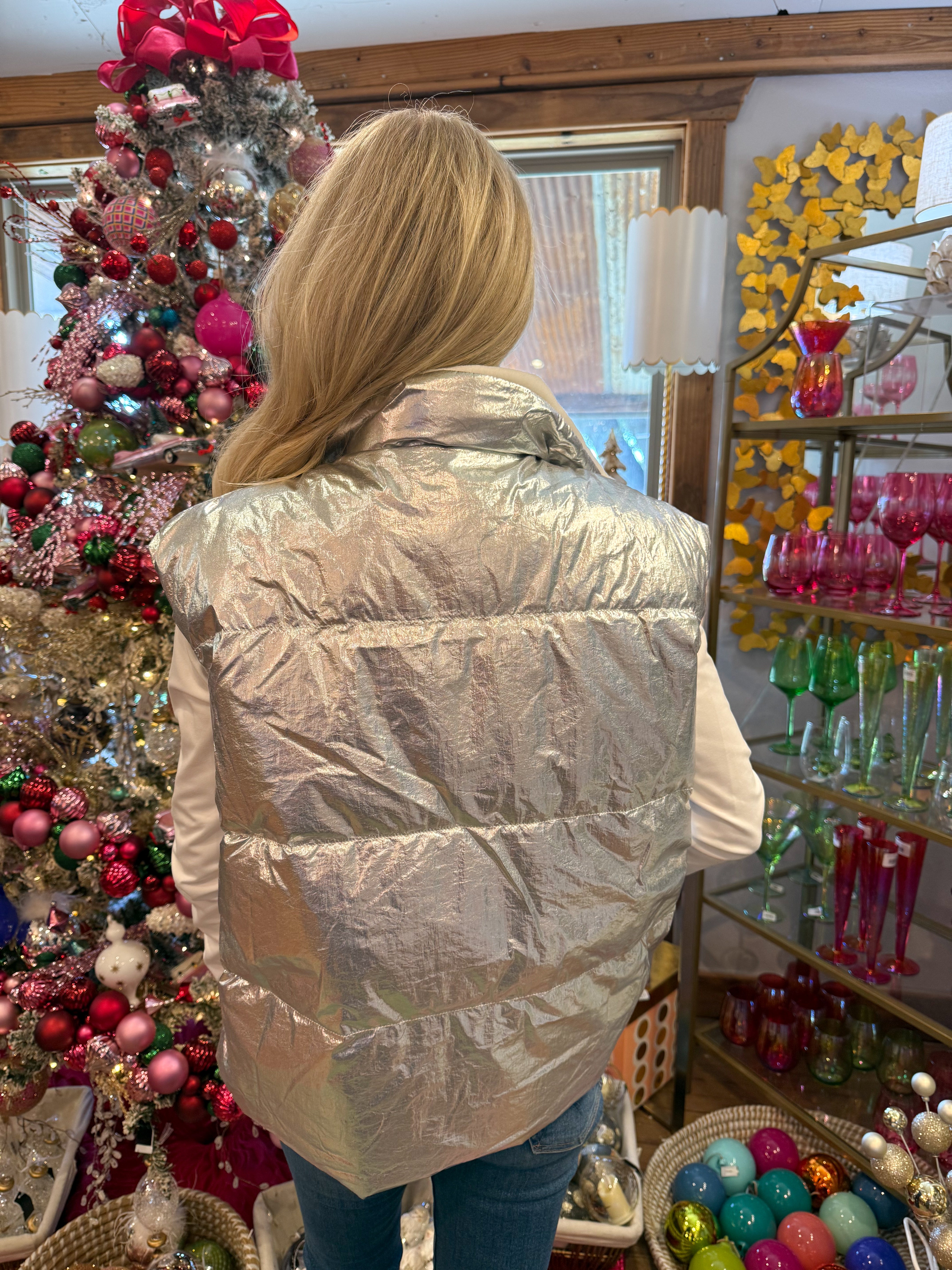 Channel your inner fashionista with this show-stopping metallic puffer vest that transforms any outfit into a statement look.