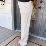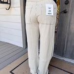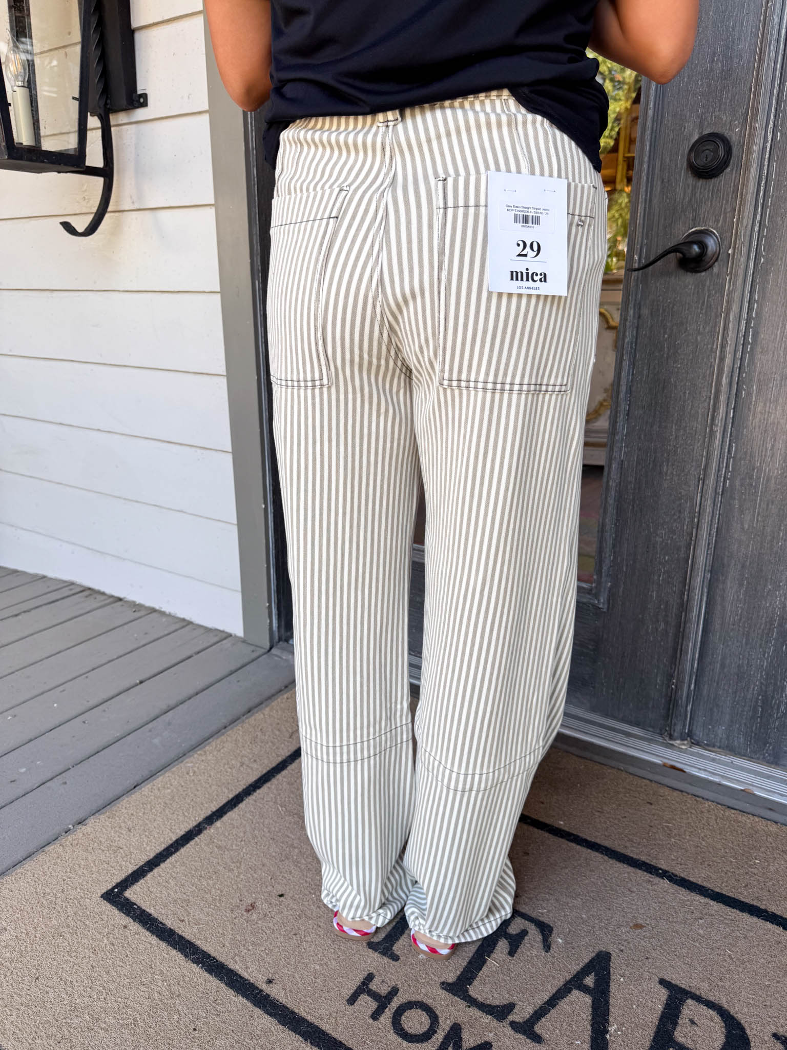 - Classic grey and white stripes make these jeans a playful statement for any outfit
