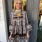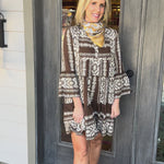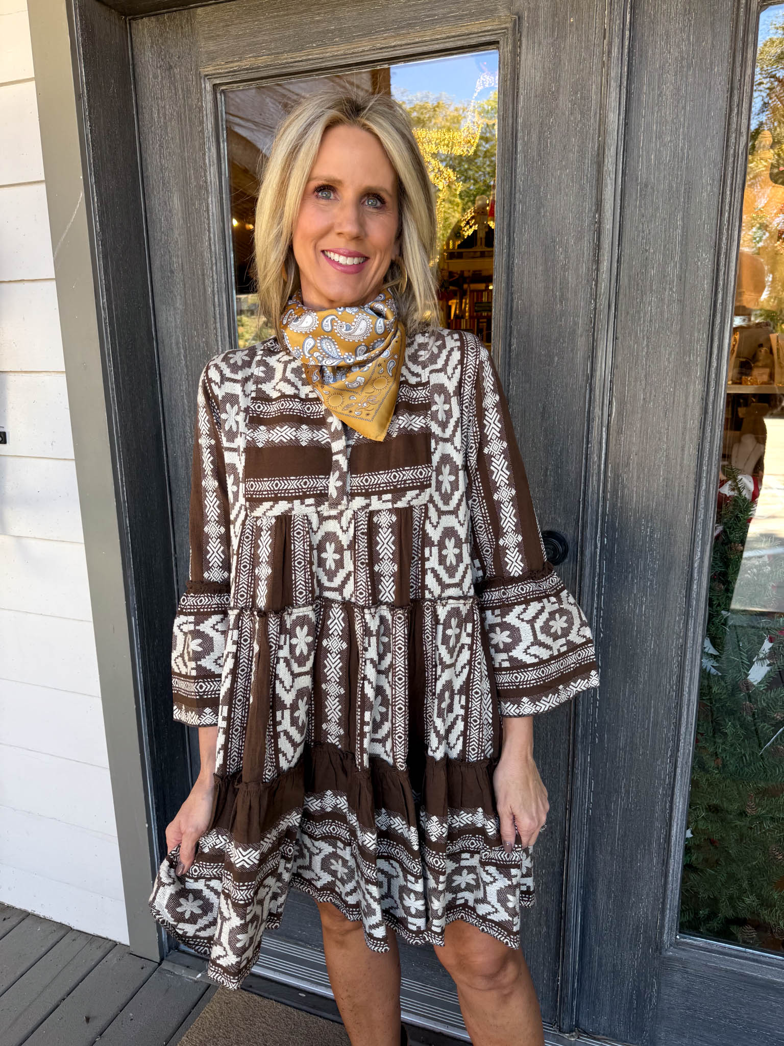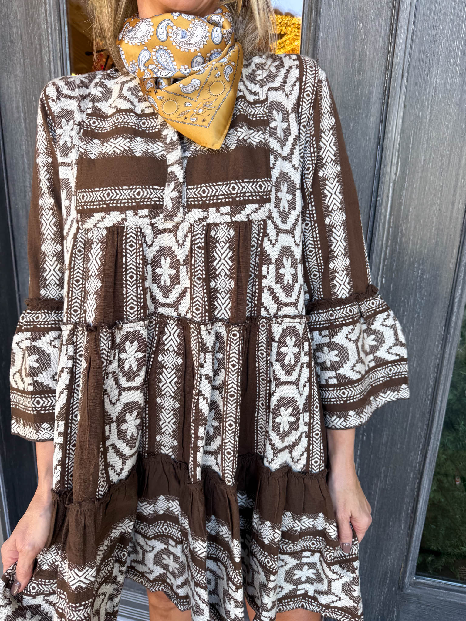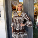 Twirl into adventure with this playful white mini dress featuring a striking aztec brown print and a flirty ruffle hem that dances with every step.
