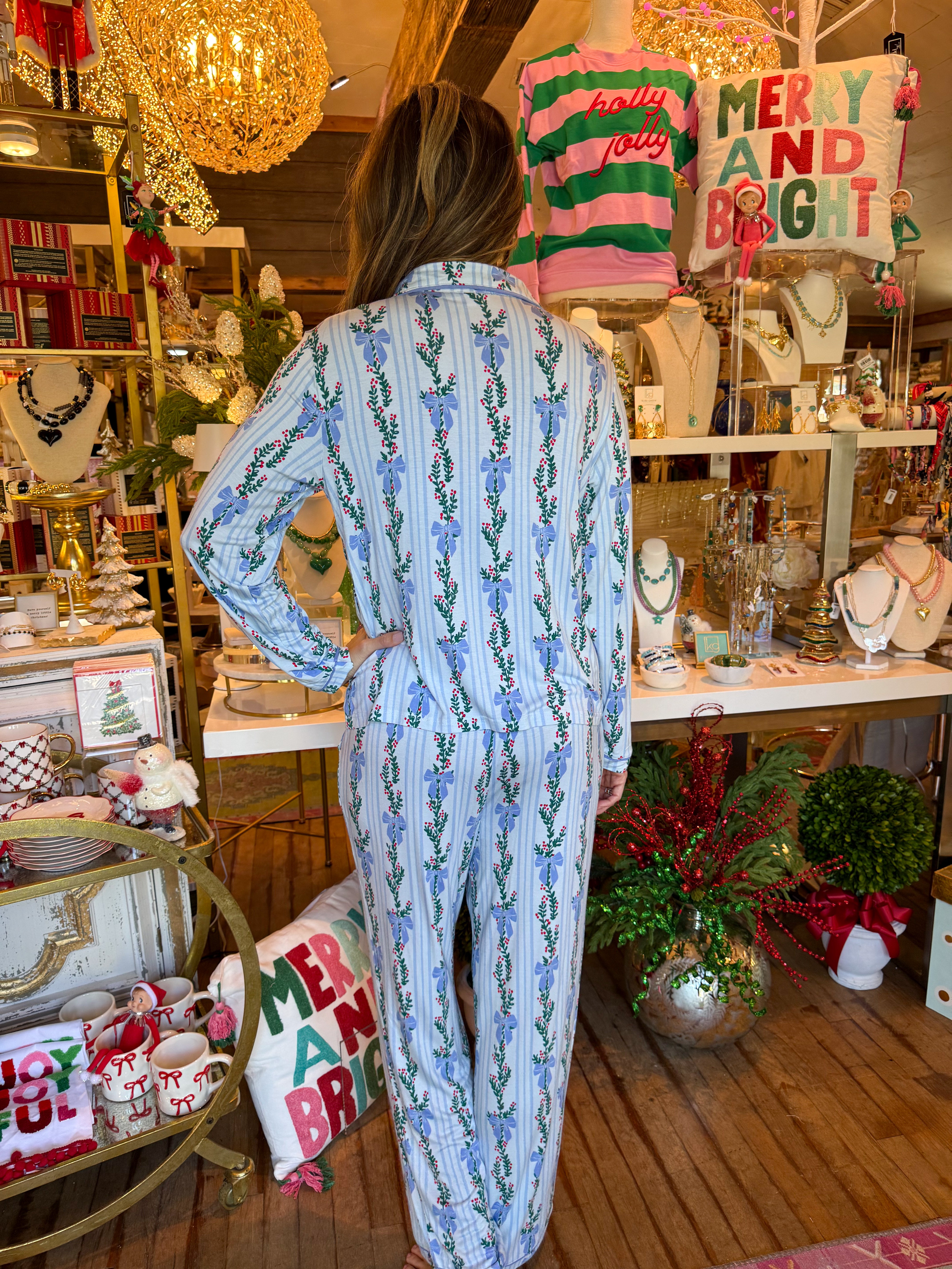 - Soft blue garland and bow prints add a whimsical touch to your bedtime look