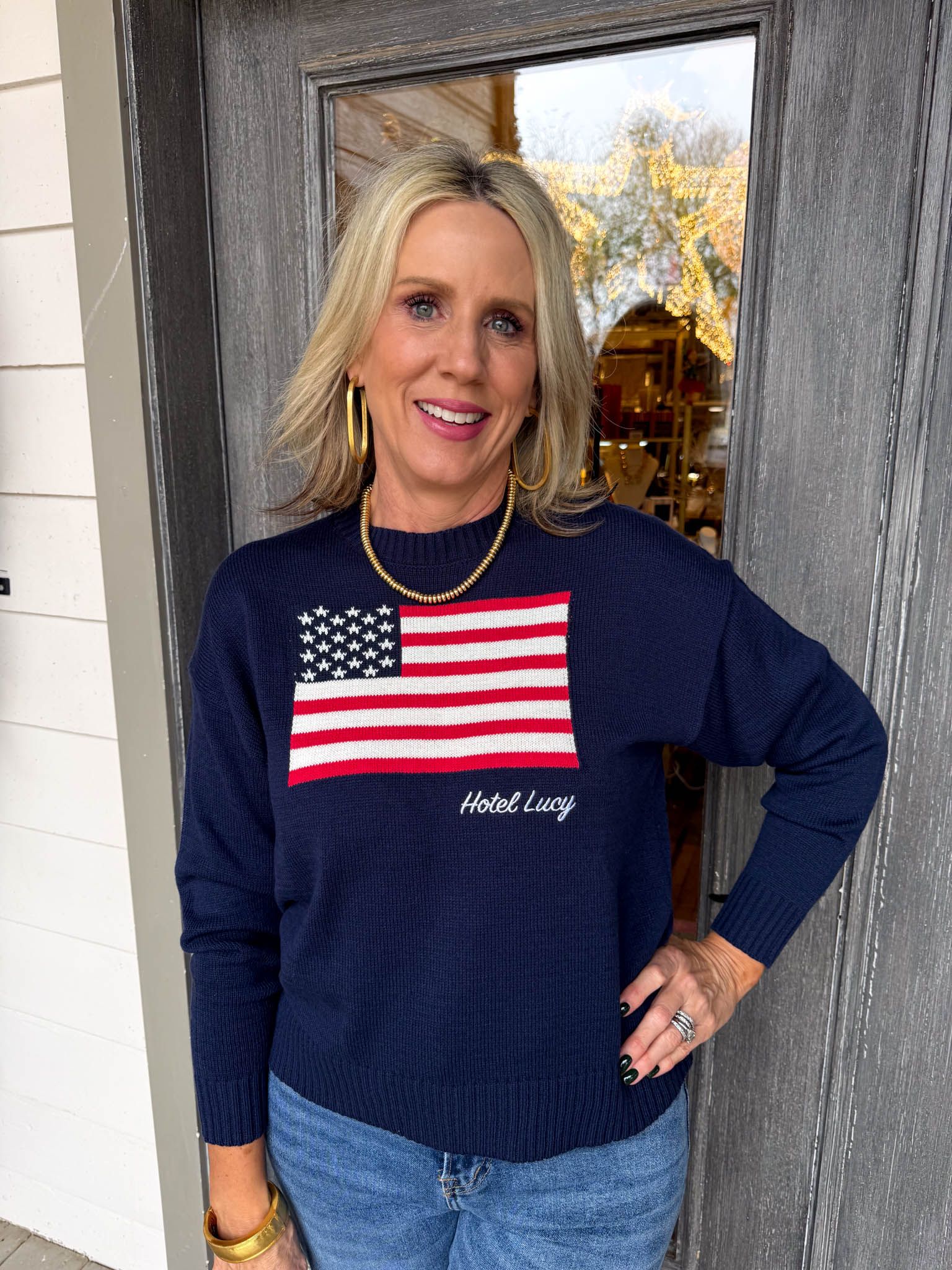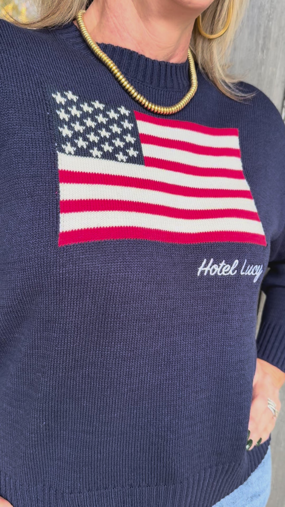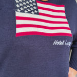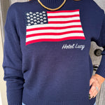 Wrap yourself in patriotic charm with this navy blue sweater that celebrates American spirit and Hotel Lucy pride.