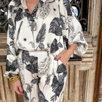 Elevate your lounge style with the Ibiza Mallorca Beige Set, featuring a champagne satin finish adorned with bold black tropical prints. The long-sleeve top and matching pants combine comfort with a touch of exotic flair for effortless chic all day long.