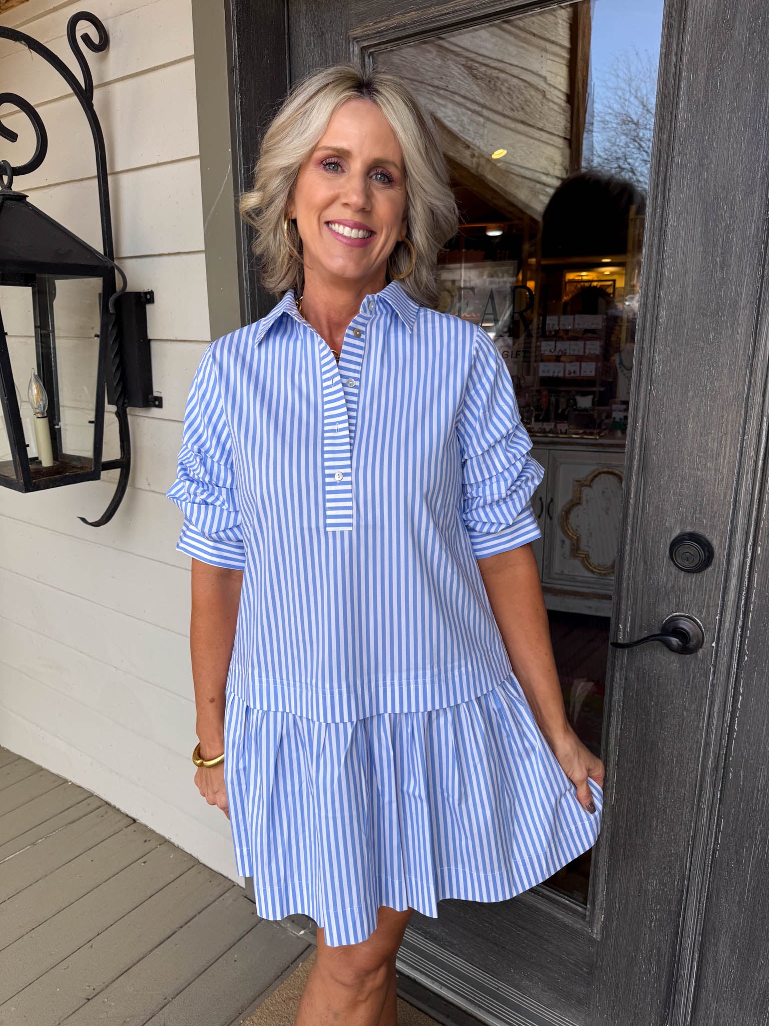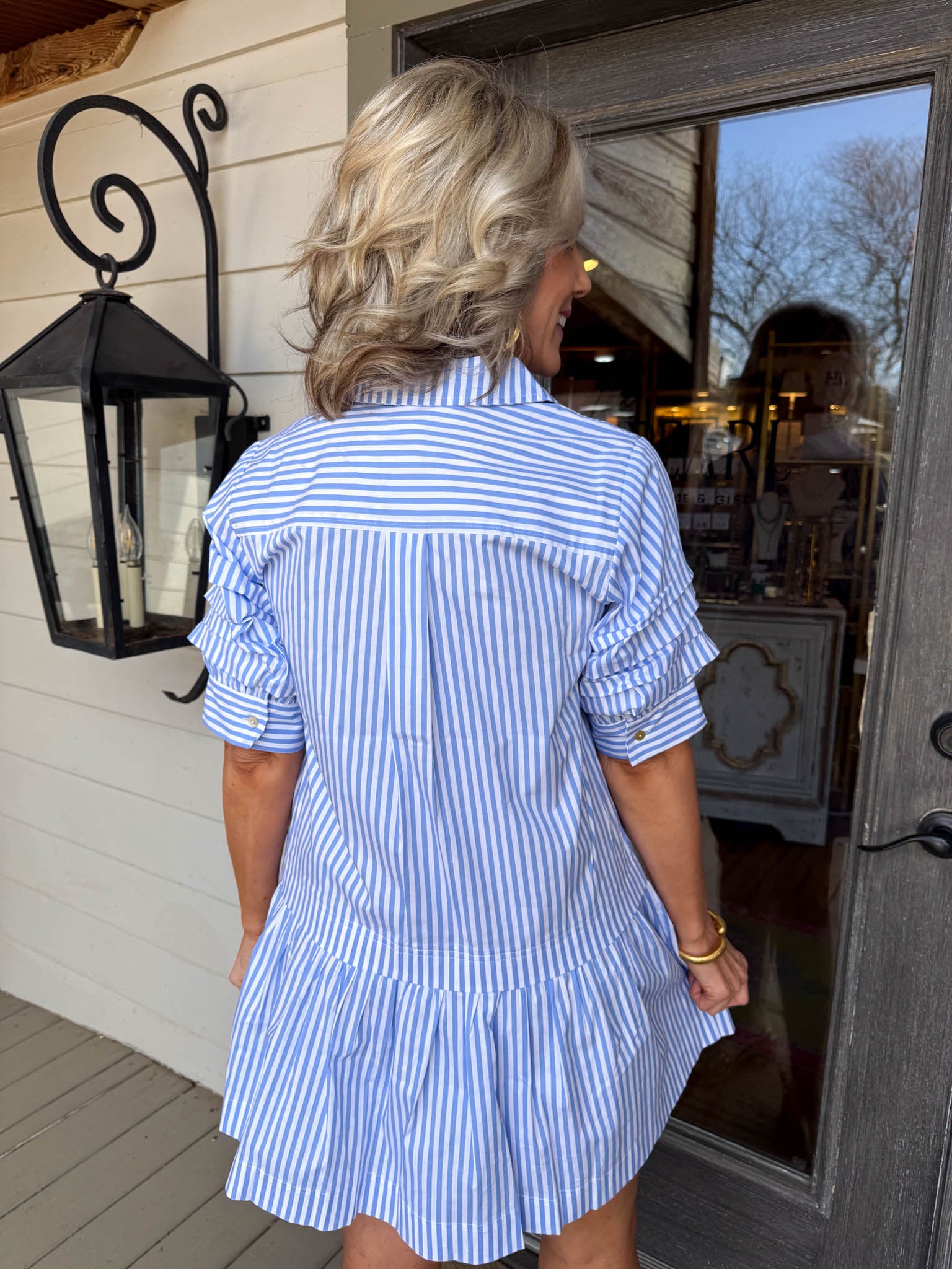 • Crisp blue and white stripes paired with statement 3/4 pleated puffy sleeves for instant personality