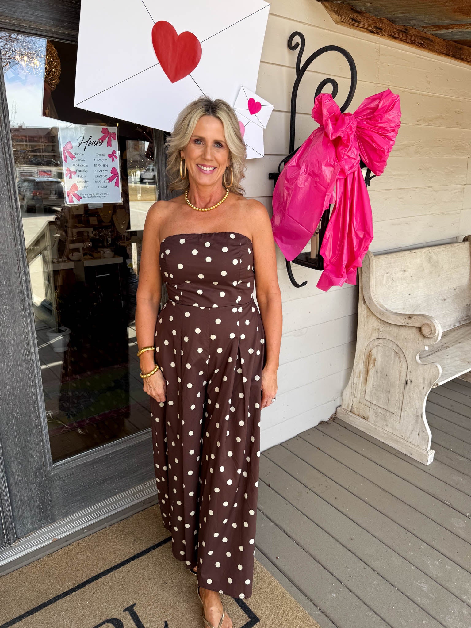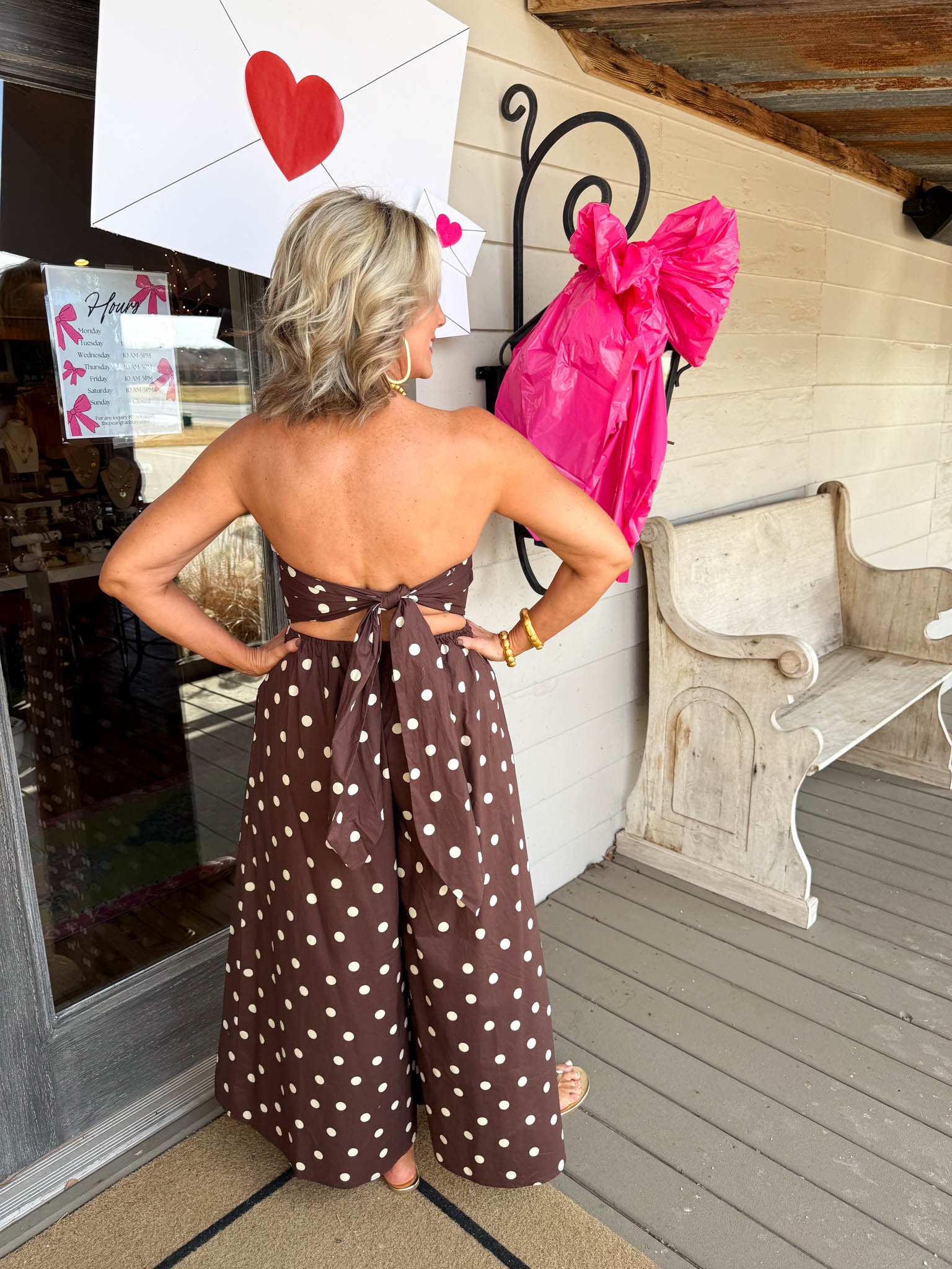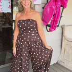 Effortlessly chic and ready to turn heads, this brown-and-white polka dot strapless jumpsuit pairs timeless pattern play with modern silhouette for an instant style win.