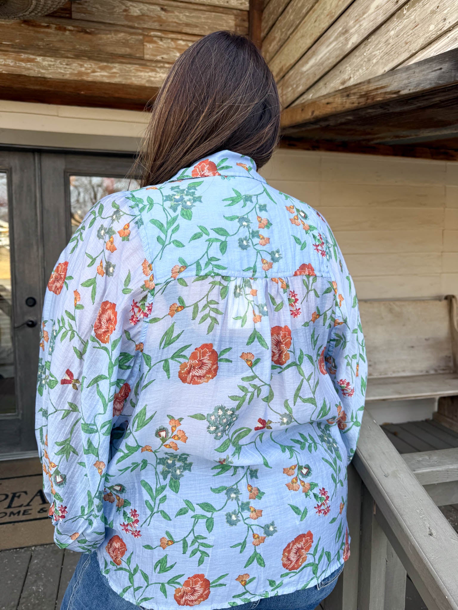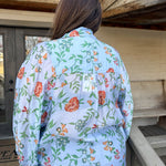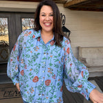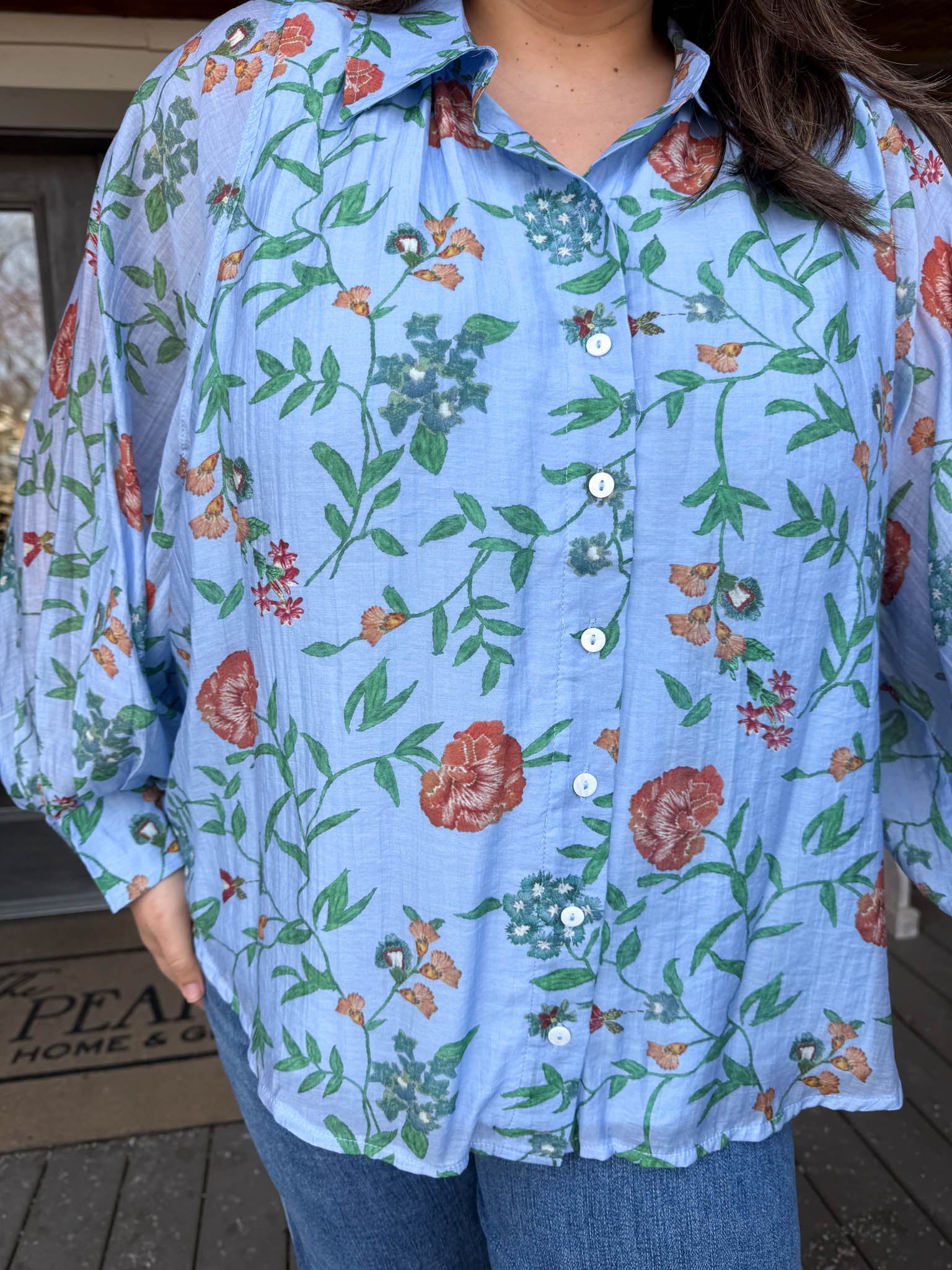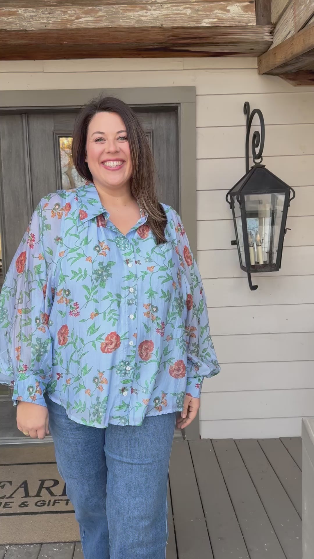 Make a bold statement in this striking red floral blouse, where voluminous long sleeves and a classic button-up front deliver confidence and timeless charm.