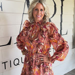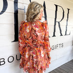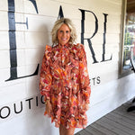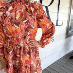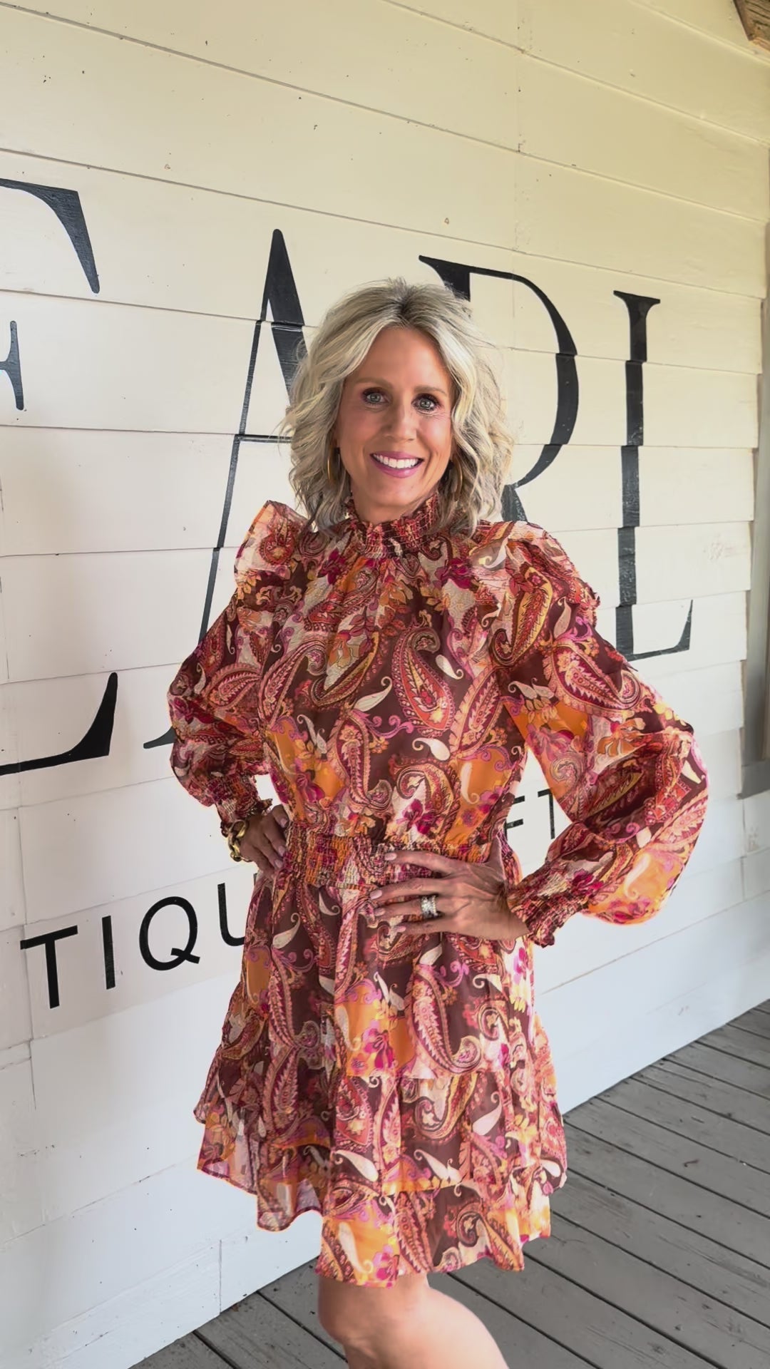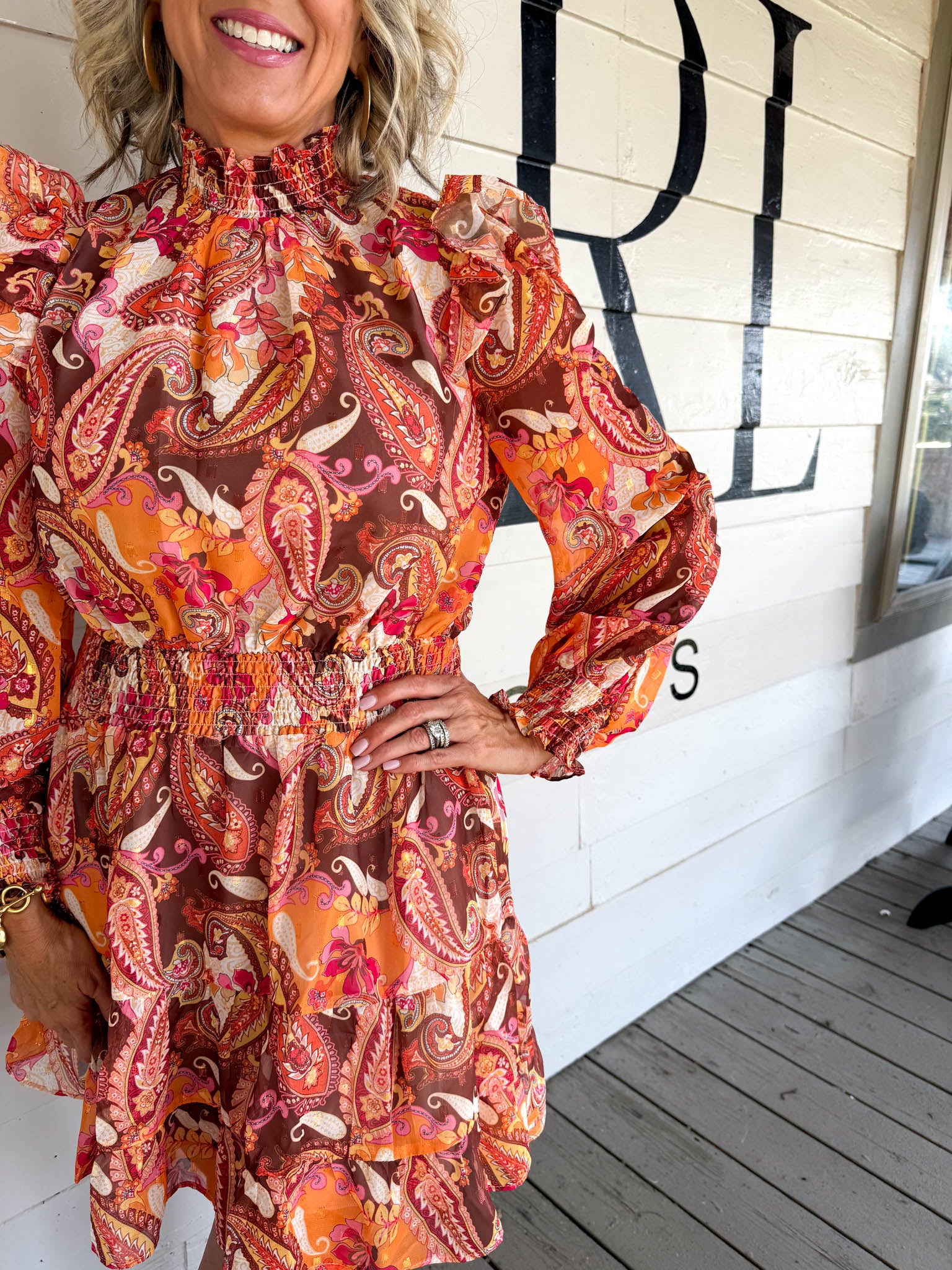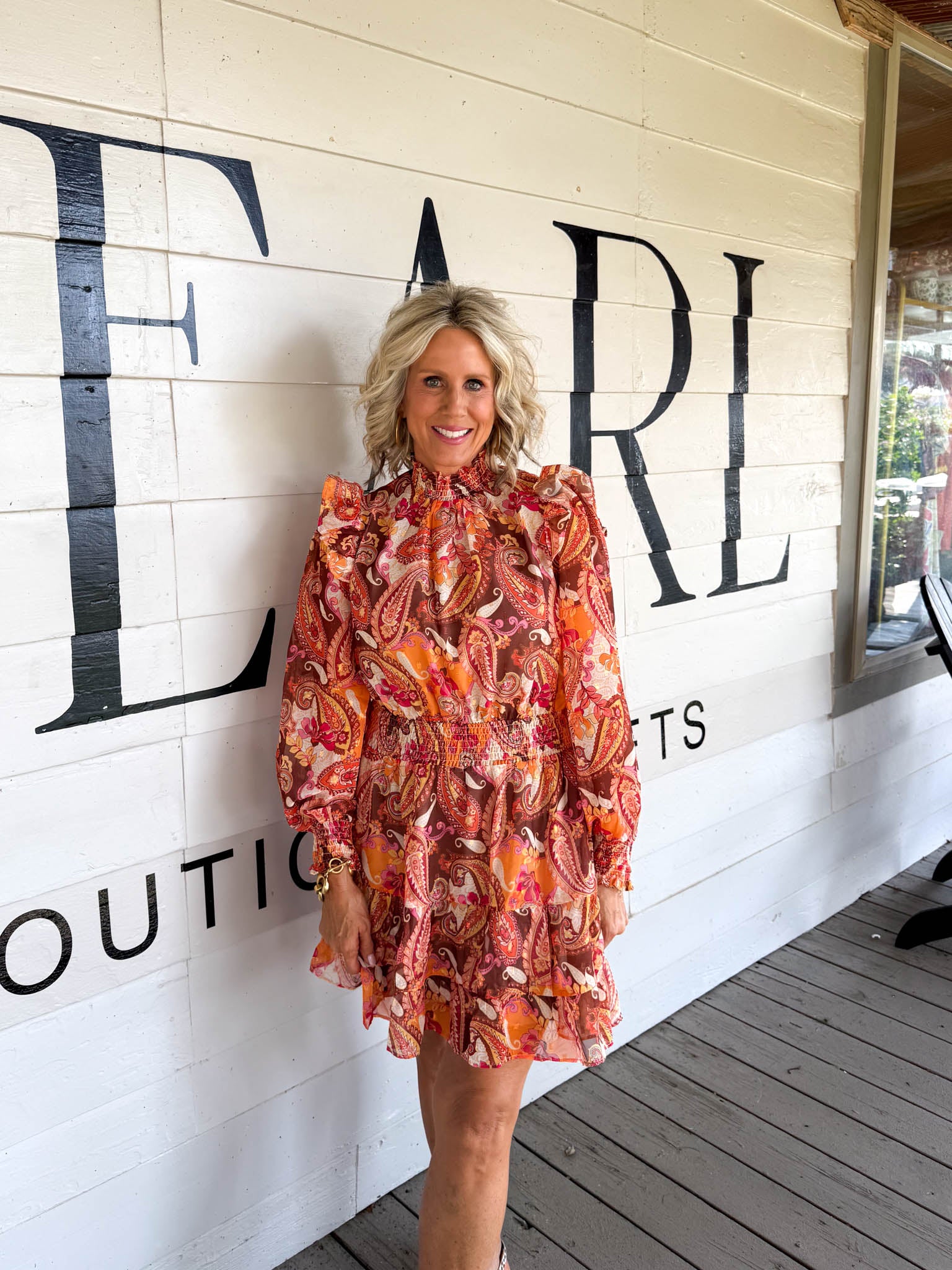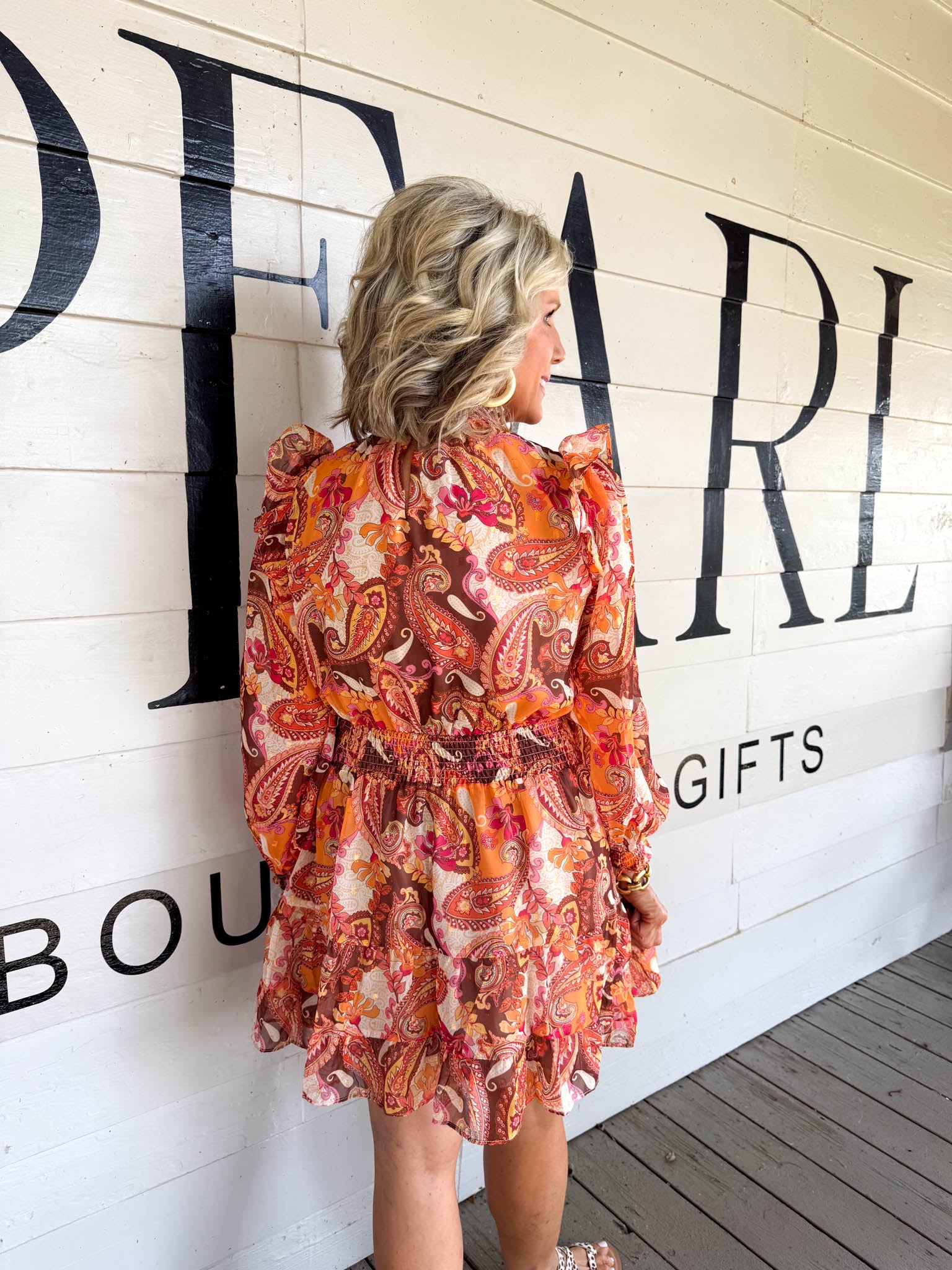 Turn heads in the Kaylor Mini Dress, where vibrant orange-brown paisley and flirty ruffles meet playful elegance.
