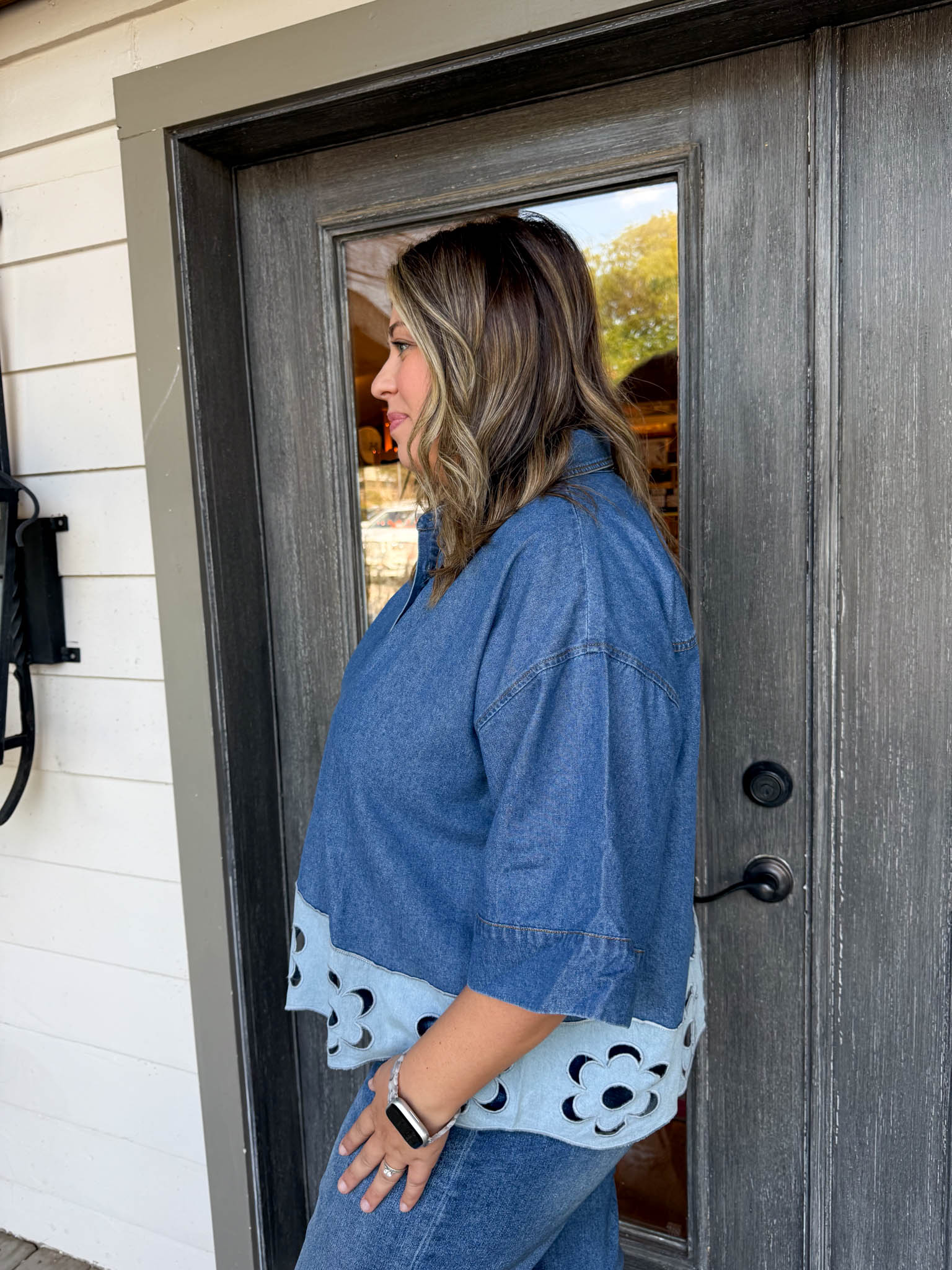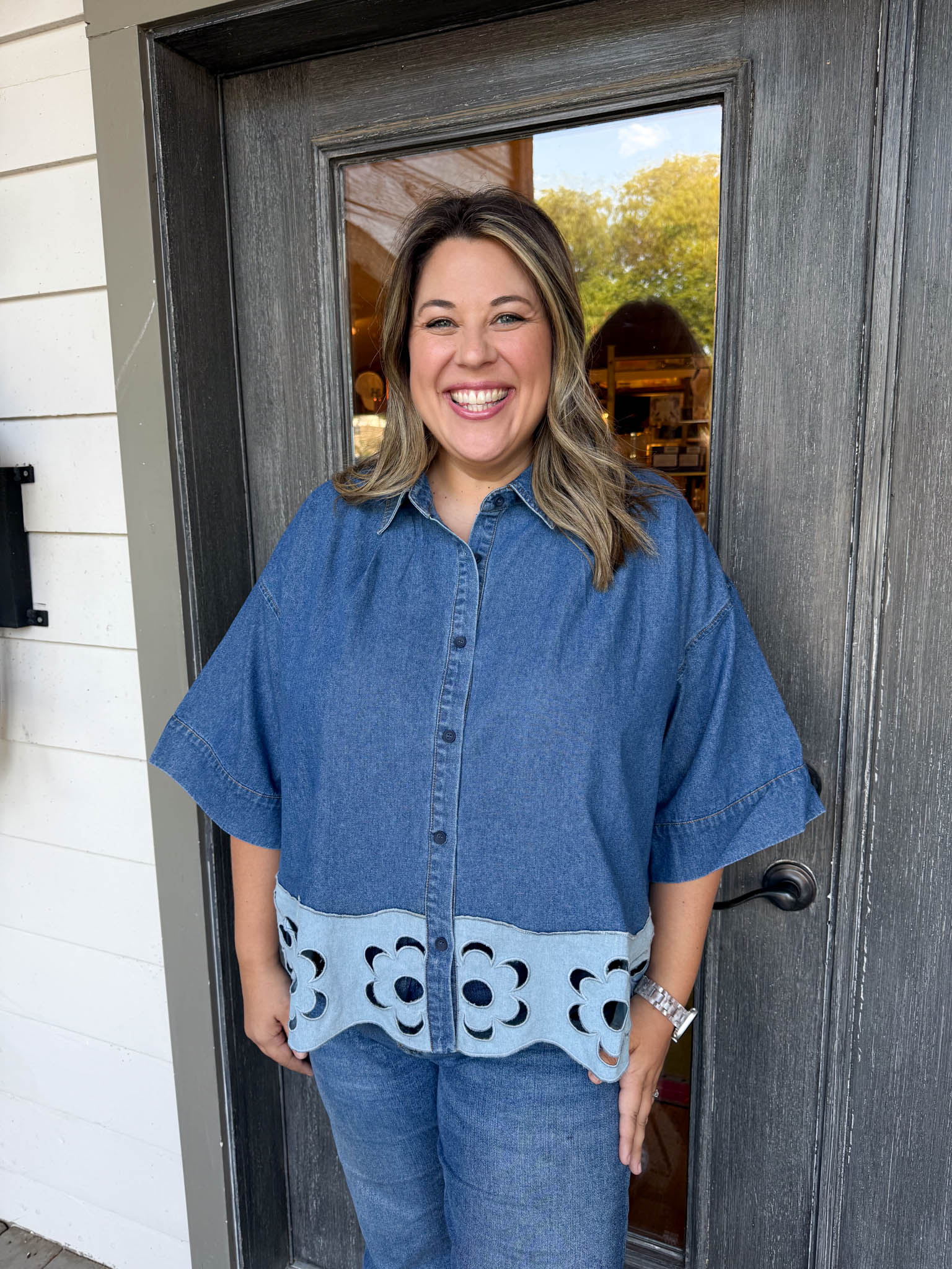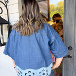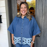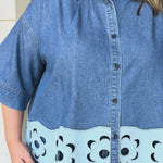 Elevate your casual look with the Khloe Denim Top—where classic denim meets flirty floral cutouts for curvy confidence.