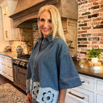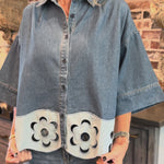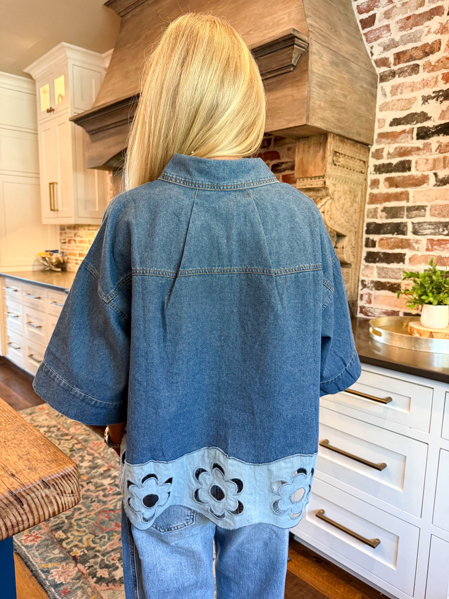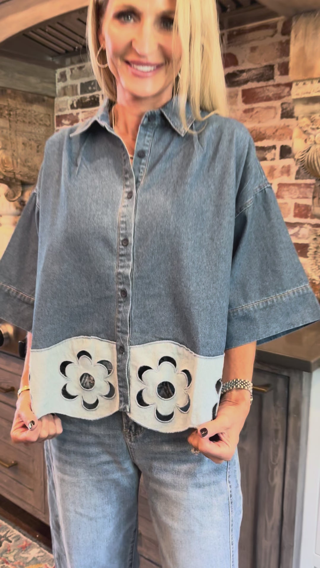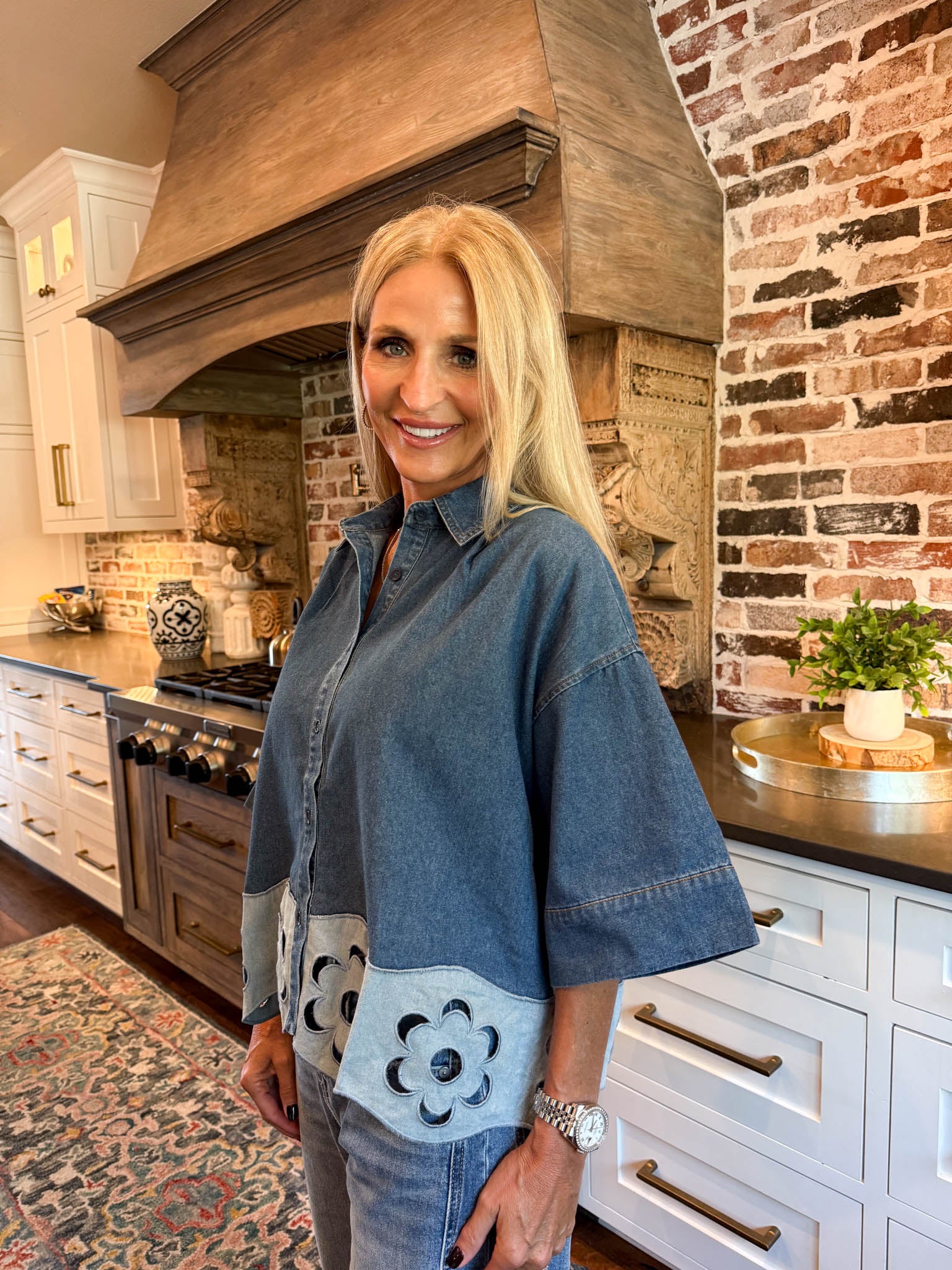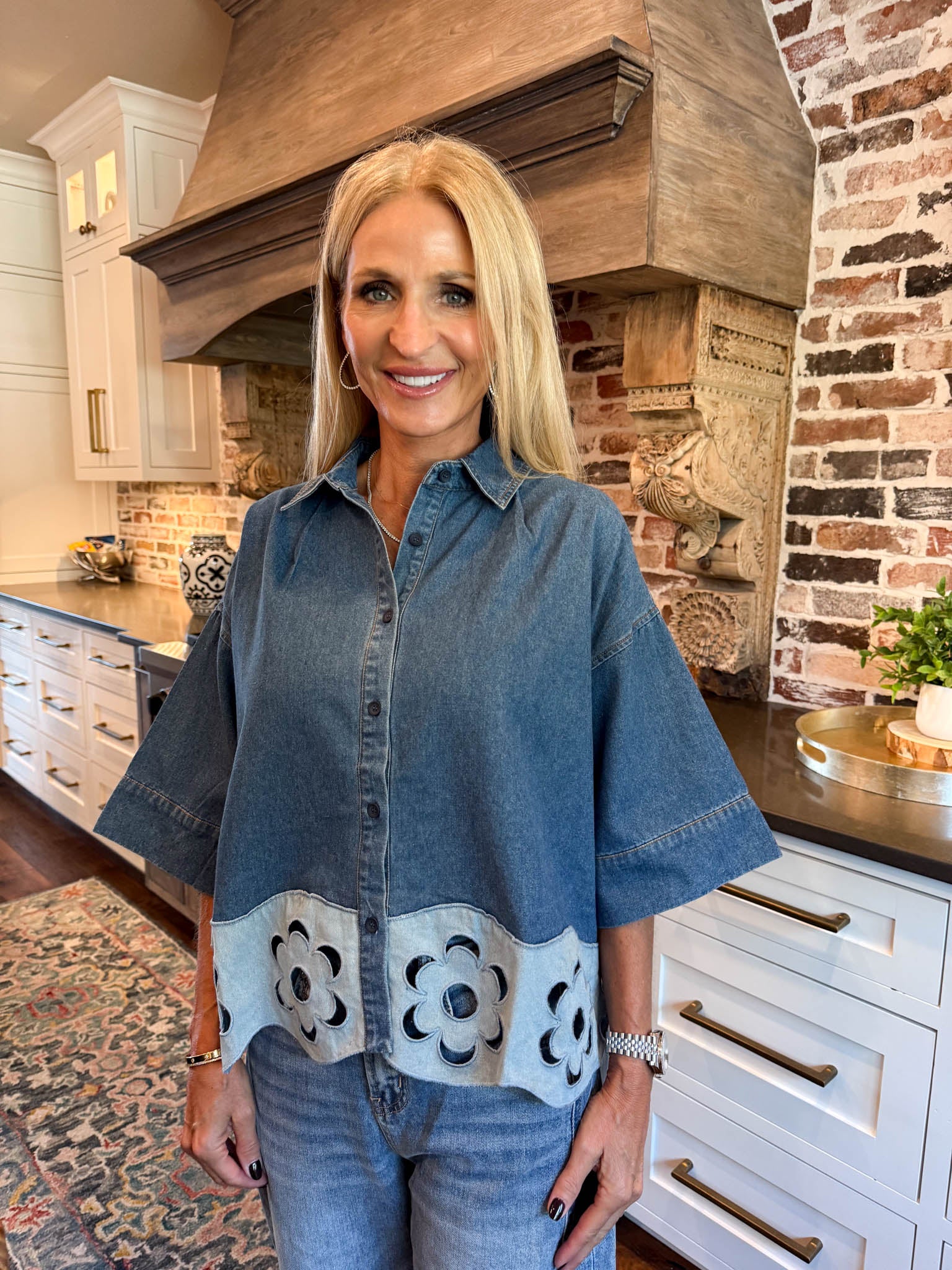 Elevate your casual look with the Khloe Denim Top—where classic denim meets flirty floral cutouts for curvy confidence.